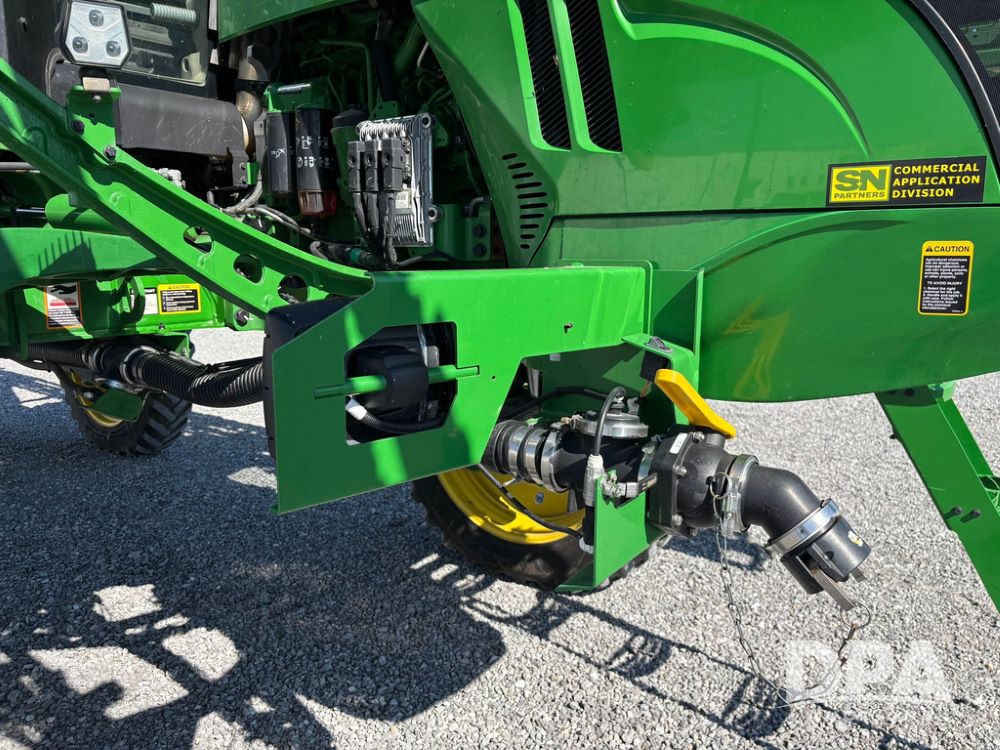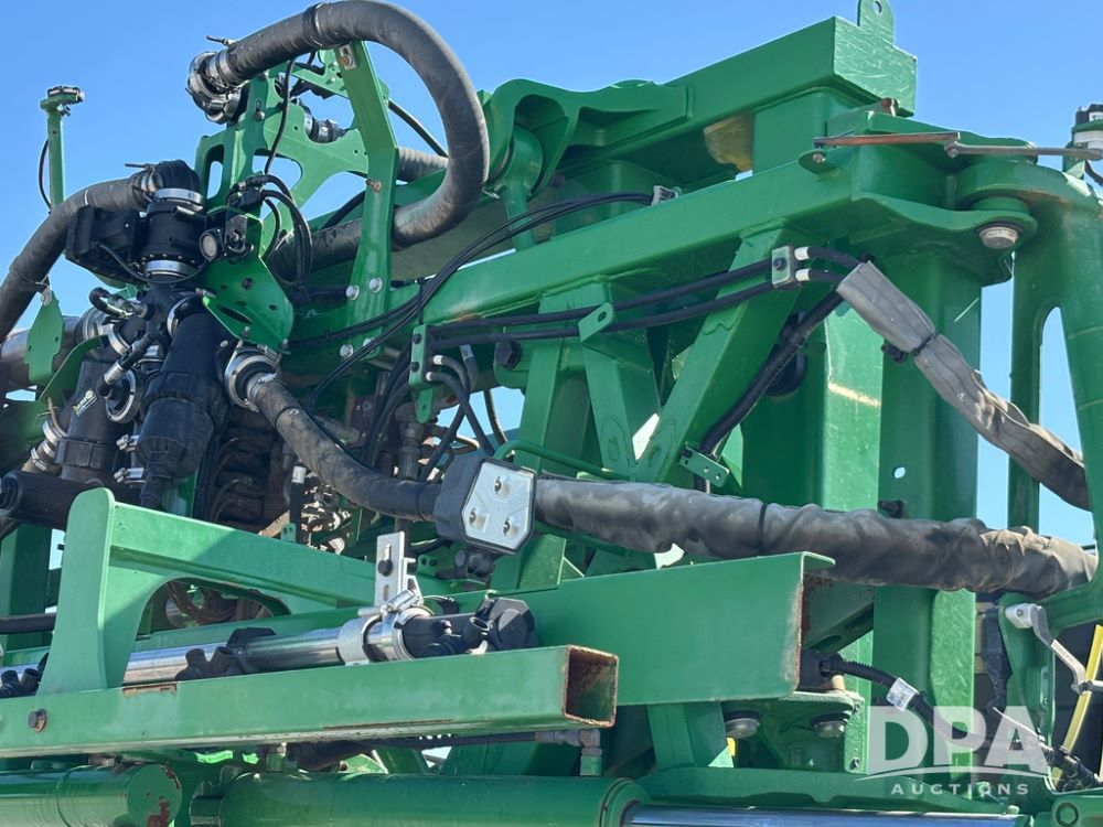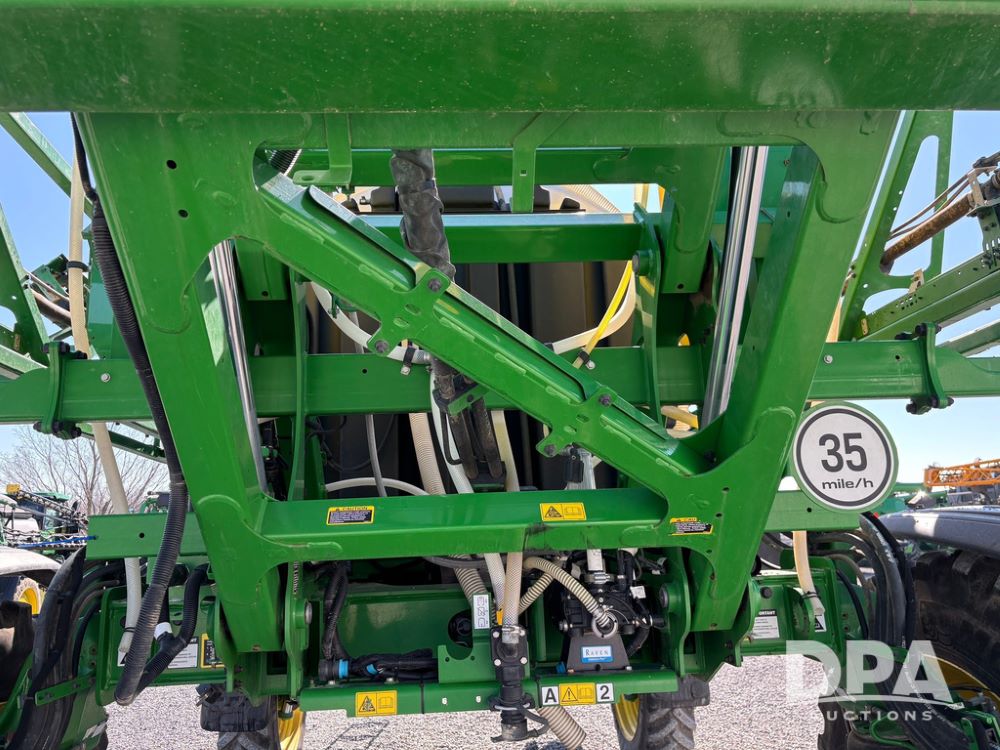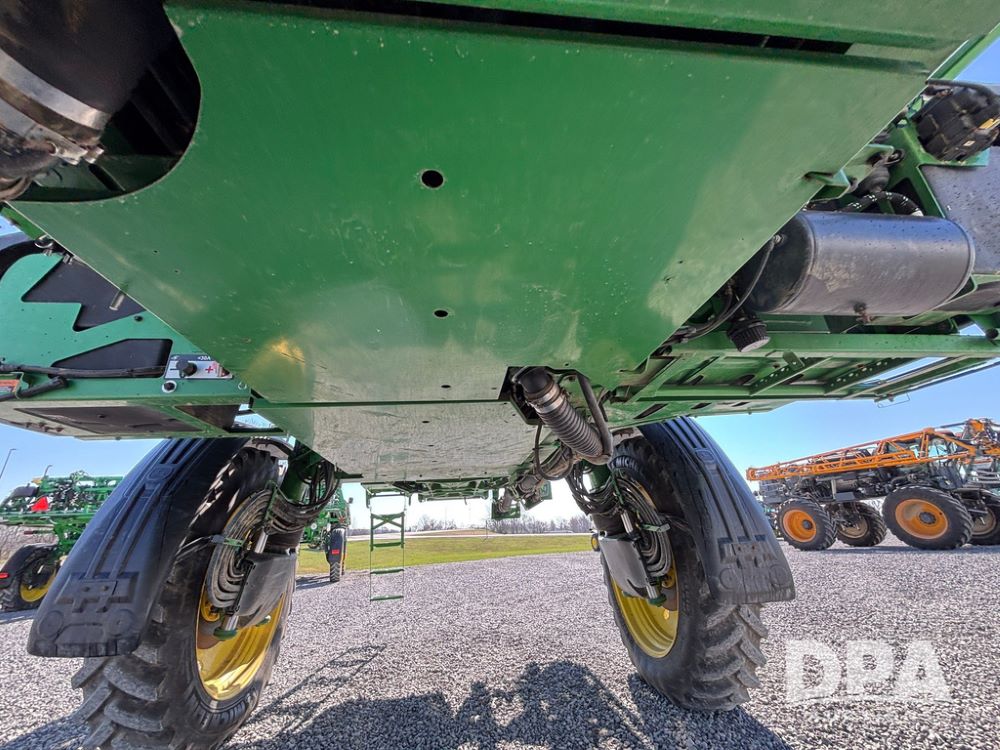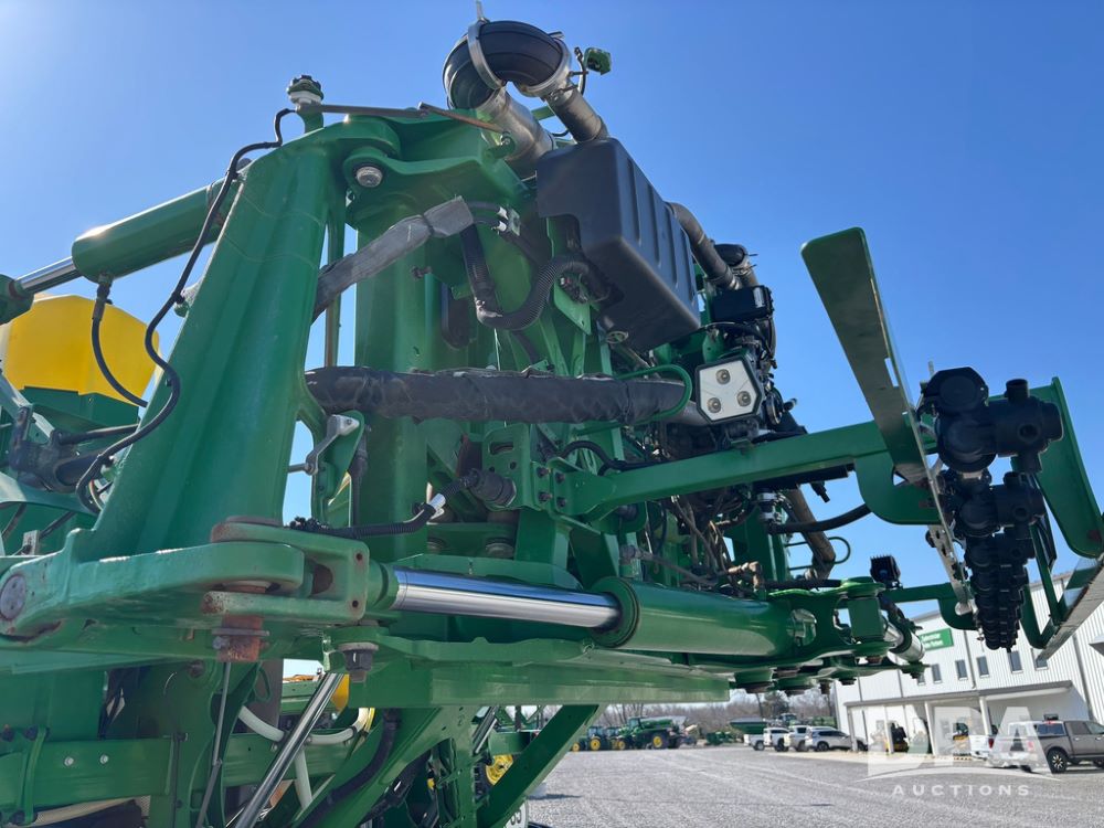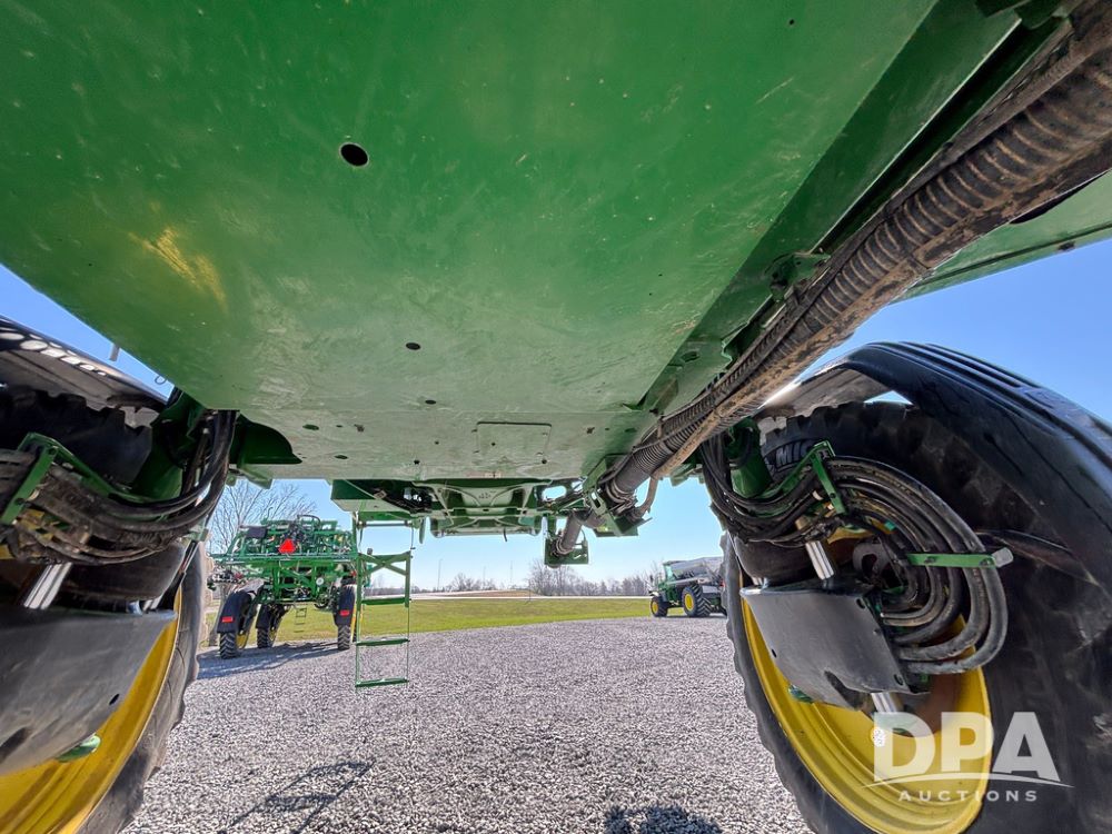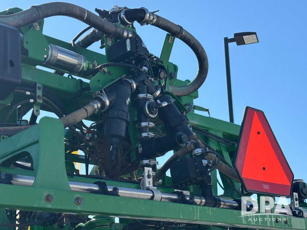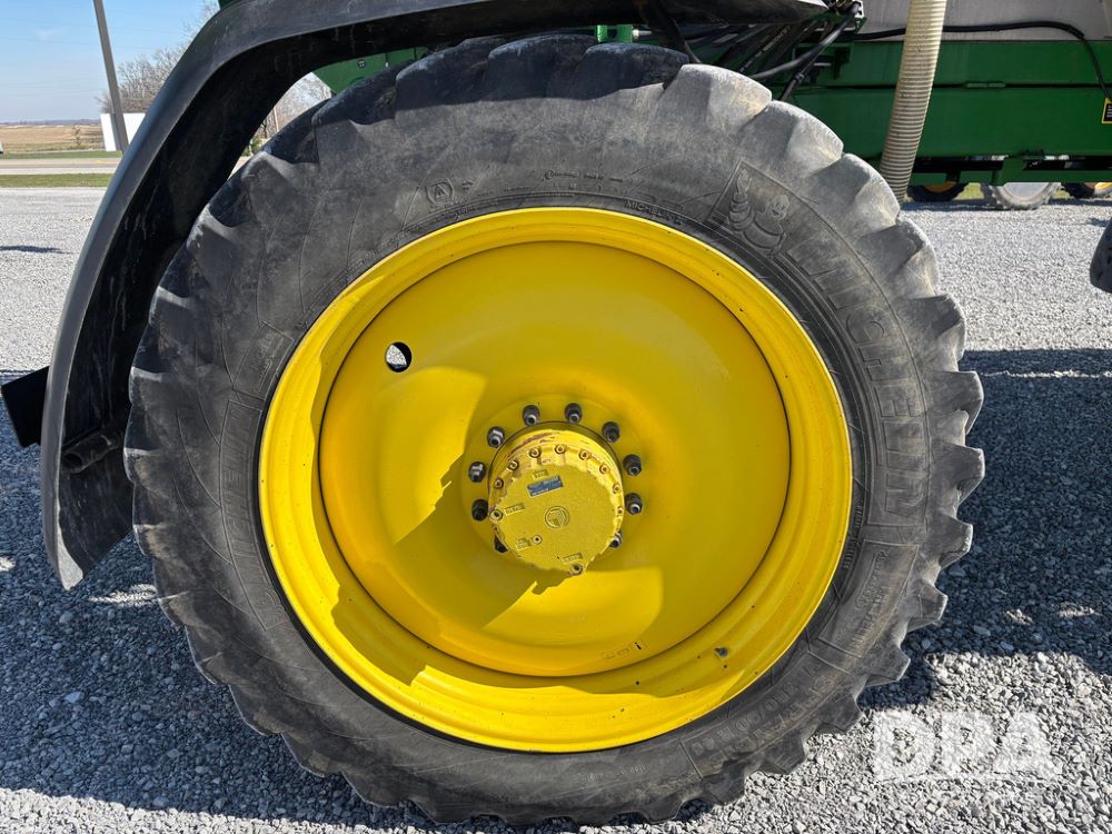 2023 John Deere 410R Sprayer (GP12953), full time 4 wheel drive with traction control, 9.0L - 6 cylinder turbo diesel engine - 310 HP (S/N RG6090U132442), dual range hydrostatic drive (25 MPH field, 35 MPH transport), JDLink MTG, CommandView 4 cab, HVAC, ultimate comfort and convenience package, auto temp control, Active II leather air suspension seat, leather buddy seat, premium touch screen Am/Fm radio, refrigerator, 1,000 gallon stainless steel liquid system, 3" left side quick fill and front fill, 120' steel boom, 1" stainless plumbing, 15" on-center spacing, (97) five position nozzle bodies, (11) section boom control valves, automatic solution control, fence row nozzles left & right, single drop foam markers, 3"x2" high flow solution pump (15 to 225 GPM), boom air purge, 5 sensor auto boom leveling, underframe crop shields, direct chemical injection system with (2) 50 gallon tanks & (1) high volume pump, hydraulic tread spacing adjustment (120-160"), auto air spring chassis leveling, on board air compressor, 380/90R46 tires, Cat 1 air filtration system, Gen 4, 4600 Command Center Gen4 GreenStar 10" color display and extended monitor, Command Center Premium 3.0 activation auto trac, section control, RowSense, Data Sync & Data Share, mechanical RowSense sensors and vision camera, premium visibility package, LED field lighting, LED beacon lights, rear view camera, Integrated SF7000 SF-1 global position receiver, shows 1,655 hours.