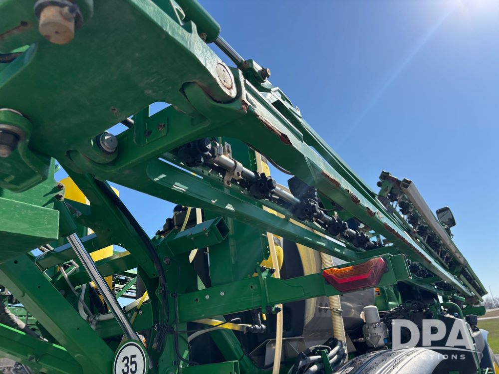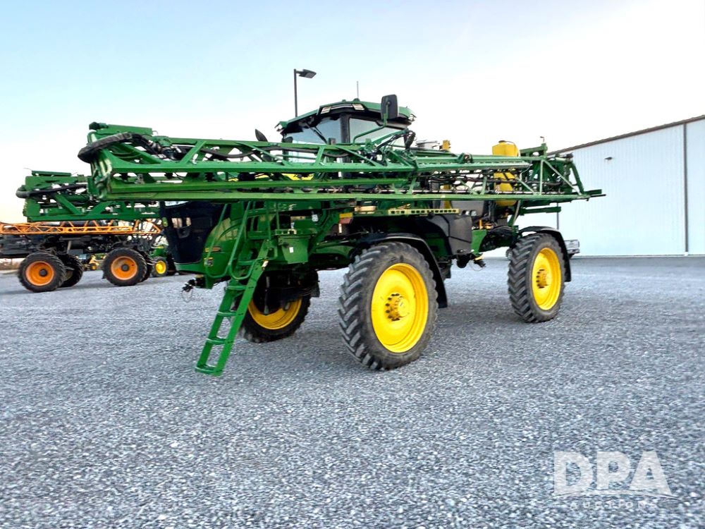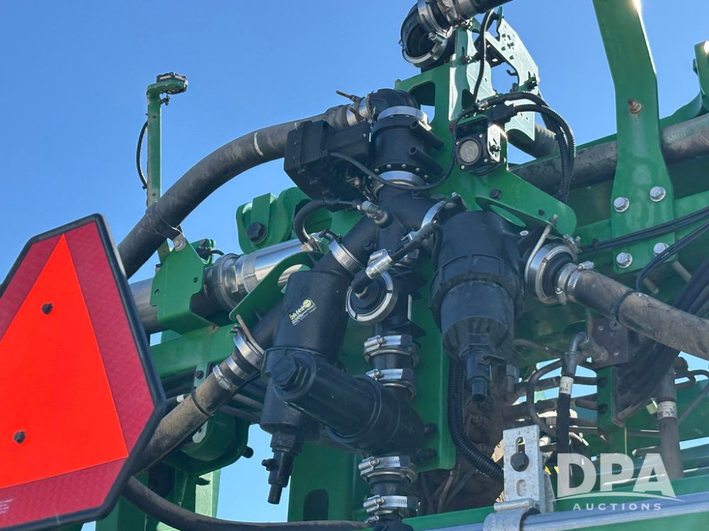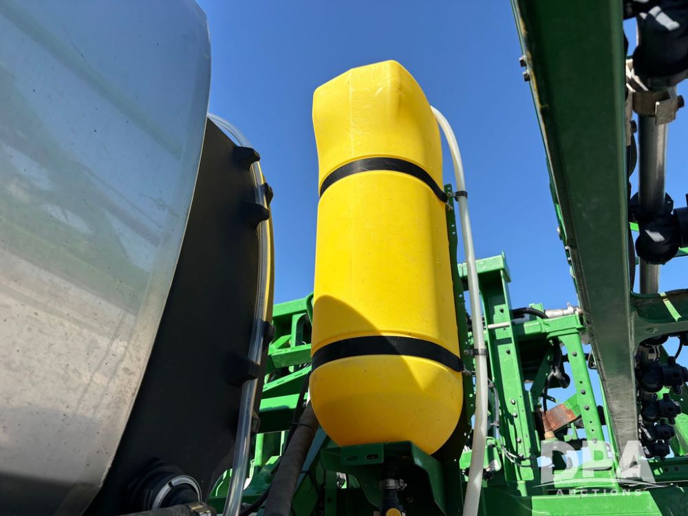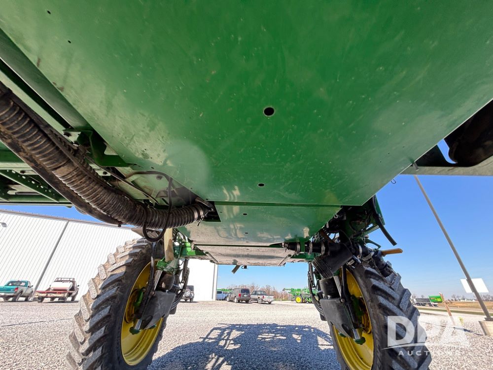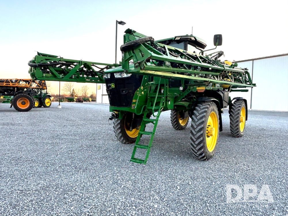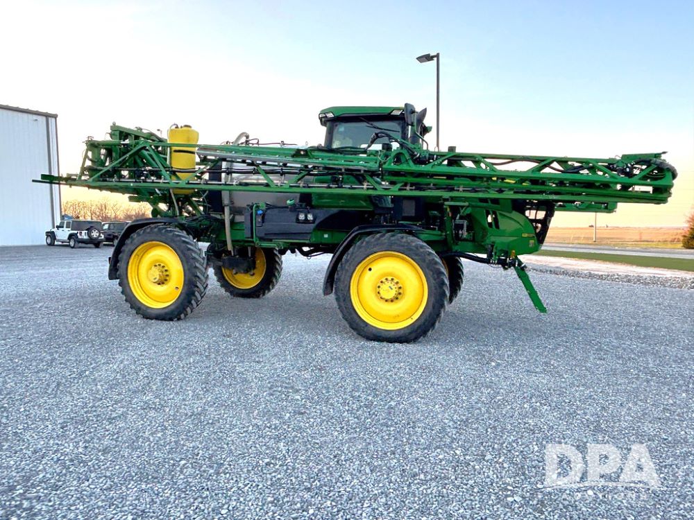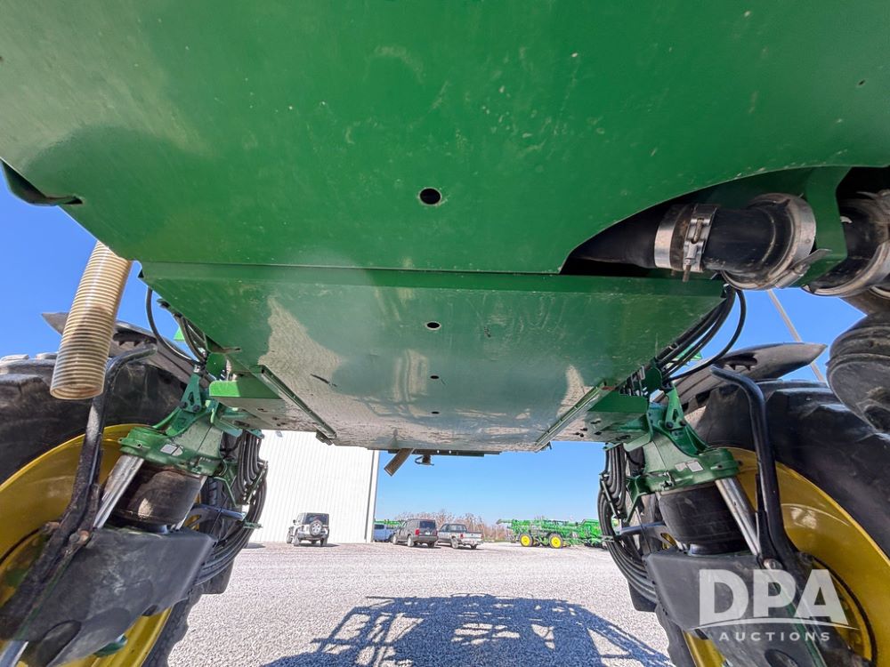 2023 John Deere 410R Sprayer (GP12953), full time 4 wheel drive with traction control, 9.0L - 6 cylinder turbo diesel engine - 310 HP (S/N RG6090U132442), dual range hydrostatic drive (25 MPH field, 35 MPH transport), JDLink MTG, CommandView 4 cab, HVAC, ultimate comfort and convenience package, auto temp control, Active II leather air suspension seat, leather buddy seat, premium touch screen Am/Fm radio, refrigerator, 1,000 gallon stainless steel liquid system, 3" left side quick fill and front fill, 120' steel boom, 1" stainless plumbing, 15" on-center spacing, (97) five position nozzle bodies, (11) section boom control valves, automatic solution control, fence row nozzles left & right, single drop foam markers, 3"x2" high flow solution pump (15 to 225 GPM), boom air purge, 5 sensor auto boom leveling, underframe crop shields, direct chemical injection system with (2) 50 gallon tanks & (1) high volume pump, hydraulic tread spacing adjustment (120-160"), auto air spring chassis leveling, on board air compressor, 380/90R46 tires, Cat 1 air filtration system, Gen 4, 4600 Command Center Gen4 GreenStar 10" color display and extended monitor, Command Center Premium 3.0 activation auto trac, section control, RowSense, Data Sync & Data Share, mechanical RowSense sensors and vision camera, premium visibility package, LED field lighting, LED beacon lights, rear view camera, Integrated SF7000 SF-1 global position receiver, shows 1,655 hours.