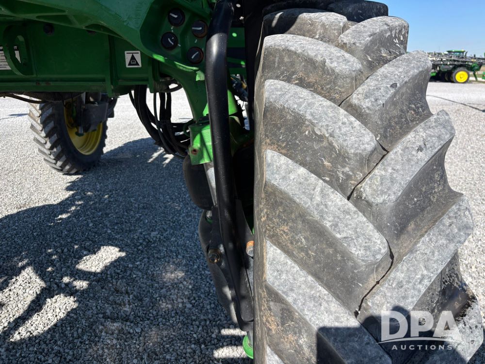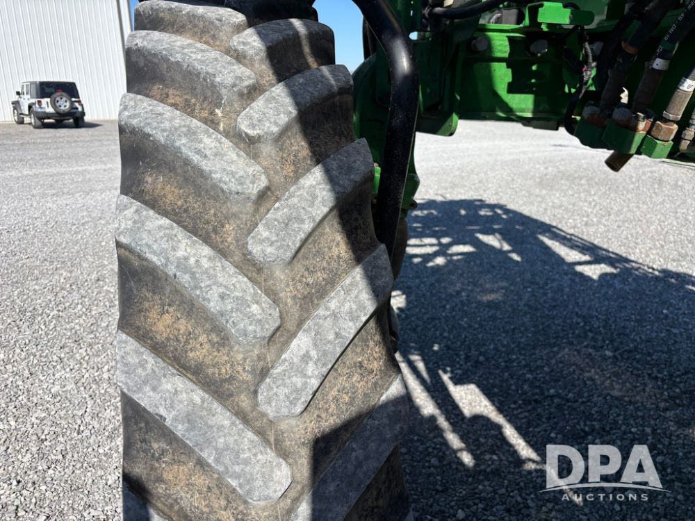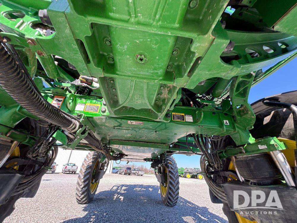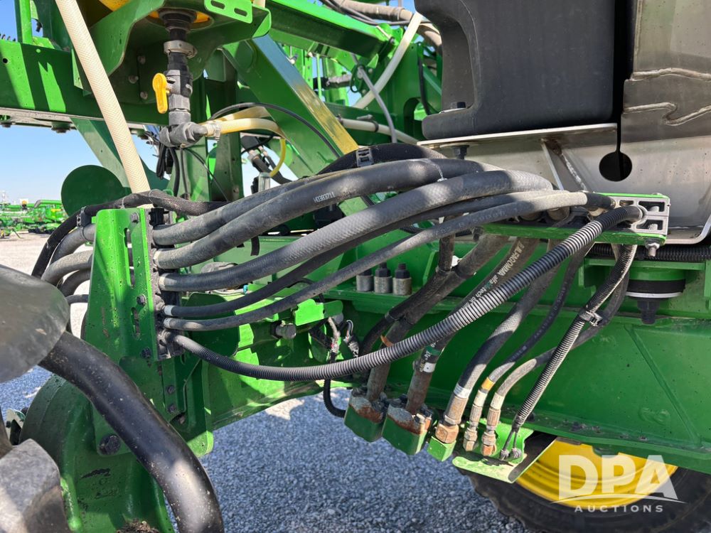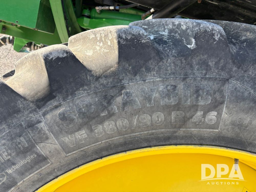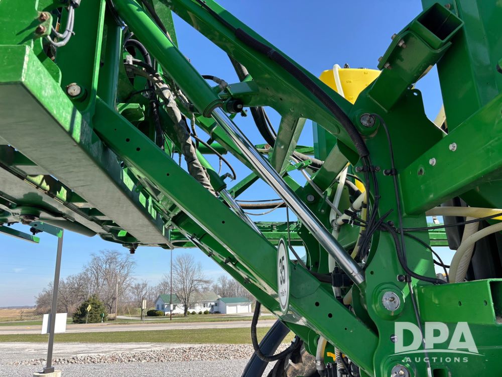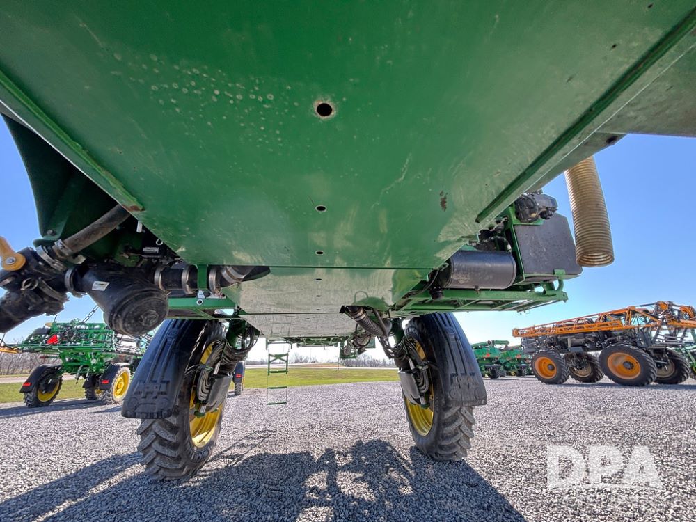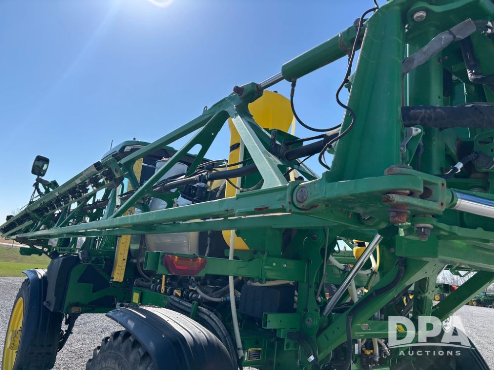 2023 John Deere 410R Sprayer (GP12953), full time 4 wheel drive with traction control, 9.0L - 6 cylinder turbo diesel engine - 310 HP (S/N RG6090U132442), dual range hydrostatic drive (25 MPH field, 35 MPH transport), JDLink MTG, CommandView 4 cab, HVAC, ultimate comfort and convenience package, auto temp control, Active II leather air suspension seat, leather buddy seat, premium touch screen Am/Fm radio, refrigerator, 1,000 gallon stainless steel liquid system, 3" left side quick fill and front fill, 120' steel boom, 1" stainless plumbing, 15" on-center spacing, (97) five position nozzle bodies, (11) section boom control valves, automatic solution control, fence row nozzles left & right, single drop foam markers, 3"x2" high flow solution pump (15 to 225 GPM), boom air purge, 5 sensor auto boom leveling, underframe crop shields, direct chemical injection system with (2) 50 gallon tanks & (1) high volume pump, hydraulic tread spacing adjustment (120-160"), auto air spring chassis leveling, on board air compressor, 380/90R46 tires, Cat 1 air filtration system, Gen 4, 4600 Command Center Gen4 GreenStar 10" color display and extended monitor, Command Center Premium 3.0 activation auto trac, section control, RowSense, Data Sync & Data Share, mechanical RowSense sensors and vision camera, premium visibility package, LED field lighting, LED beacon lights, rear view camera, Integrated SF7000 SF-1 global position receiver, shows 1,655 hours.