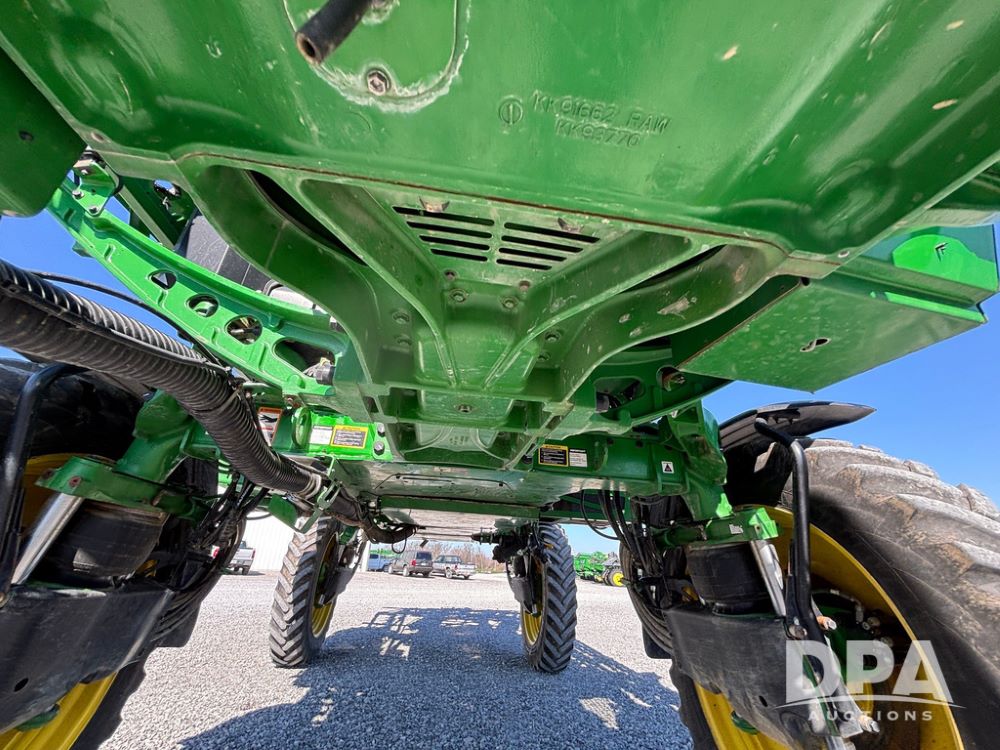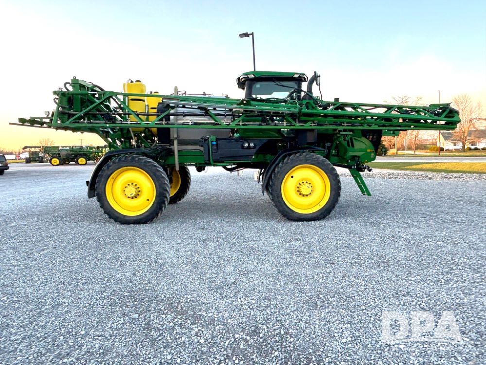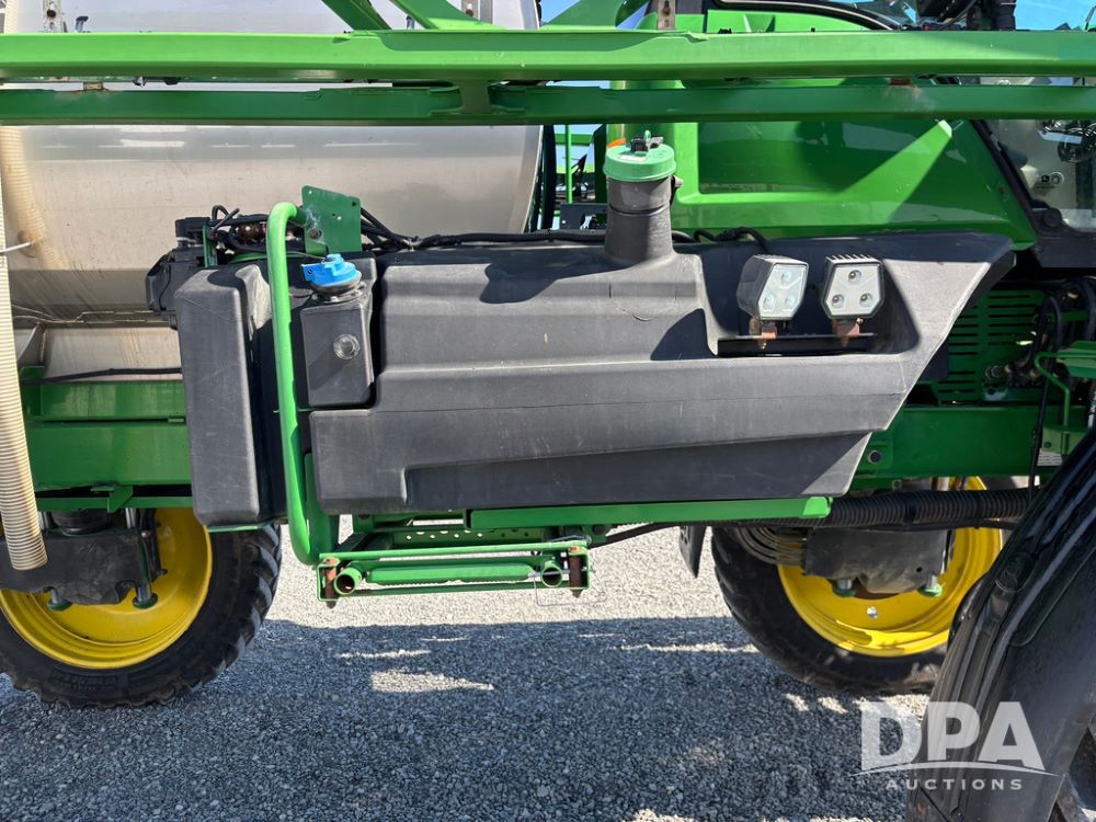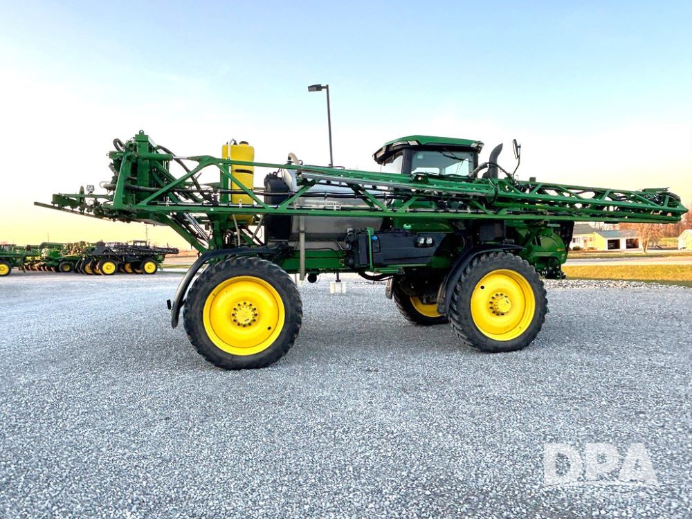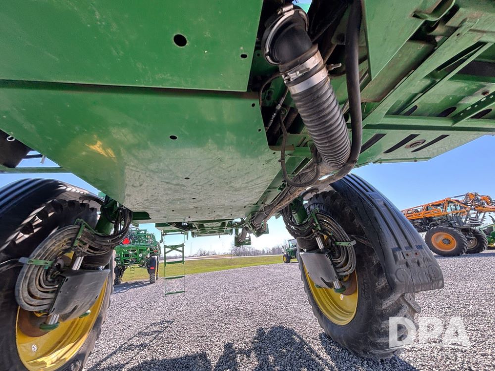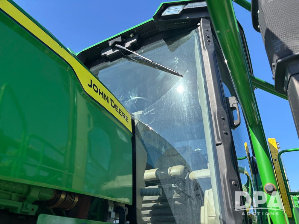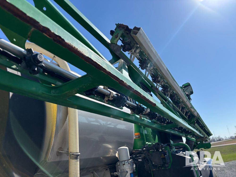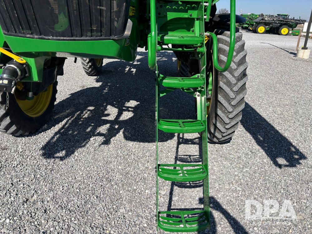 2023 John Deere 410R Sprayer (GP12953), full time 4 wheel drive with traction control, 9.0L - 6 cylinder turbo diesel engine - 310 HP (S/N RG6090U132442), dual range hydrostatic drive (25 MPH field, 35 MPH transport), JDLink MTG, CommandView 4 cab, HVAC, ultimate comfort and convenience package, auto temp control, Active II leather air suspension seat, leather buddy seat, premium touch screen Am/Fm radio, refrigerator, 1,000 gallon stainless steel liquid system, 3" left side quick fill and front fill, 120' steel boom, 1" stainless plumbing, 15" on-center spacing, (97) five position nozzle bodies, (11) section boom control valves, automatic solution control, fence row nozzles left & right, single drop foam markers, 3"x2" high flow solution pump (15 to 225 GPM), boom air purge, 5 sensor auto boom leveling, underframe crop shields, direct chemical injection system with (2) 50 gallon tanks & (1) high volume pump, hydraulic tread spacing adjustment (120-160"), auto air spring chassis leveling, on board air compressor, 380/90R46 tires, Cat 1 air filtration system, Gen 4, 4600 Command Center Gen4 GreenStar 10" color display and extended monitor, Command Center Premium 3.0 activation auto trac, section control, RowSense, Data Sync & Data Share, mechanical RowSense sensors and vision camera, premium visibility package, LED field lighting, LED beacon lights, rear view camera, Integrated SF7000 SF-1 global position receiver, shows 1,655 hours.