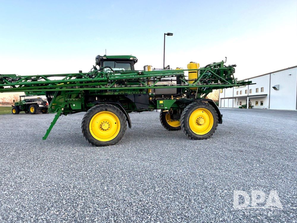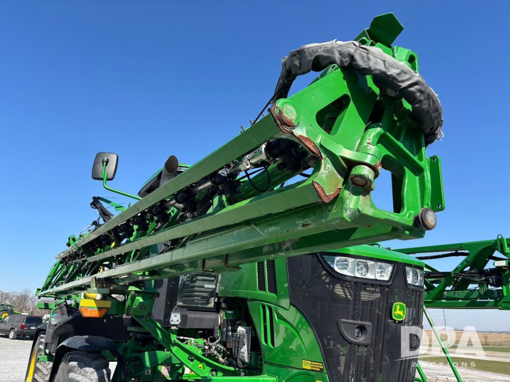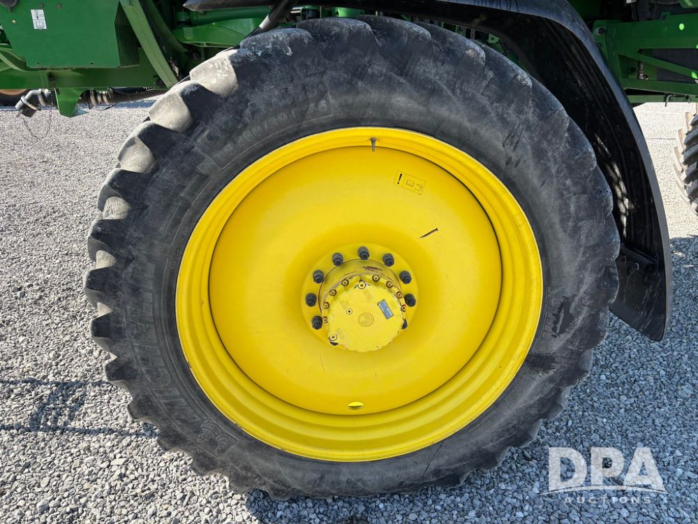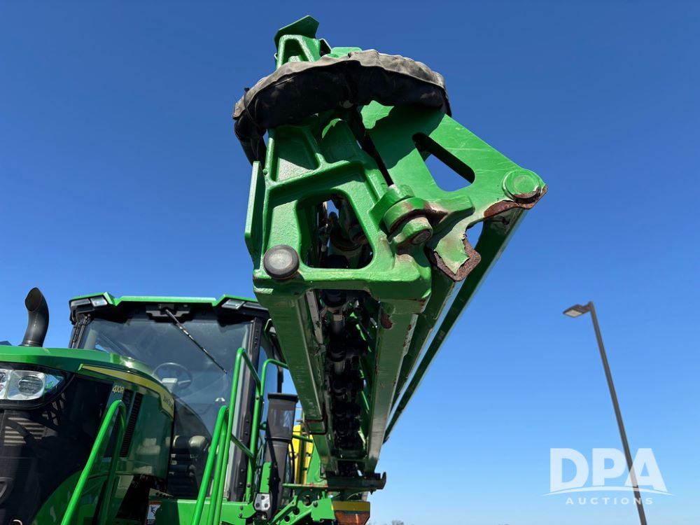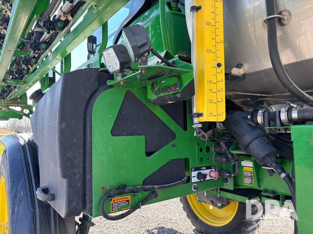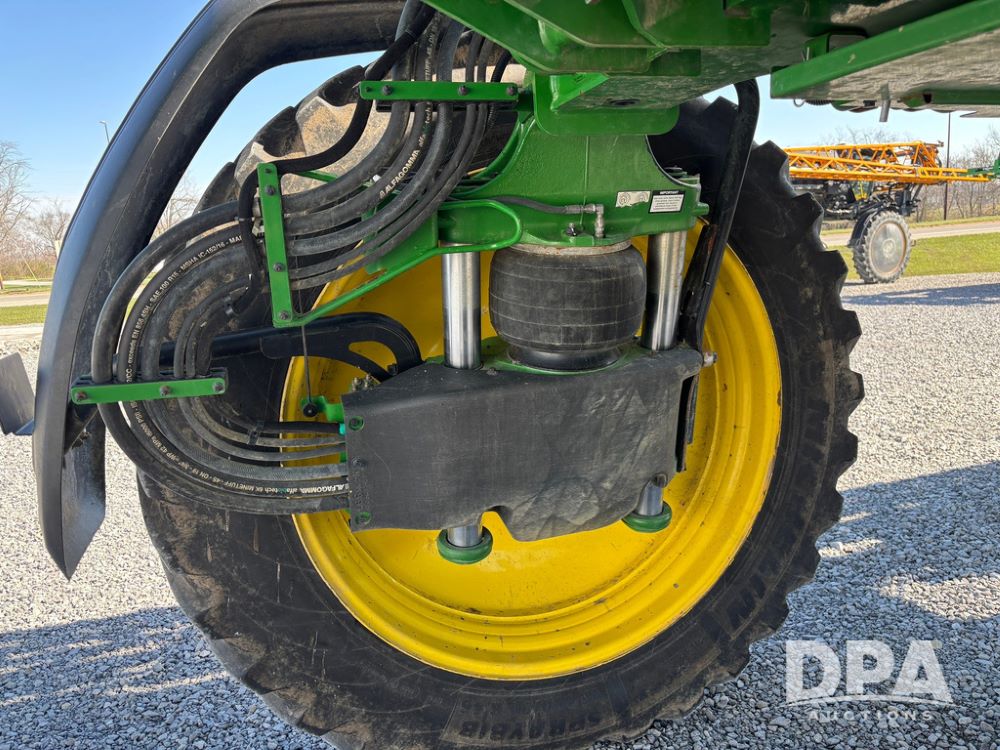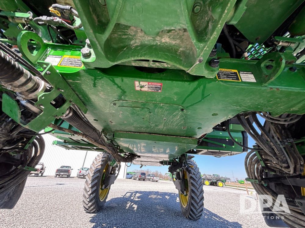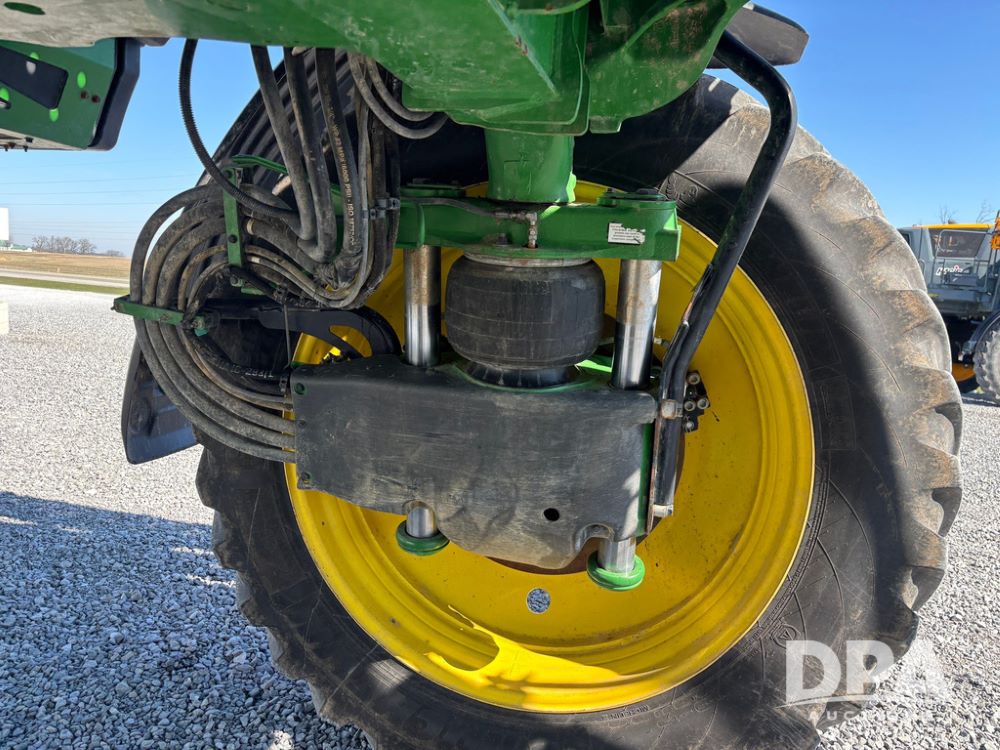 2023 John Deere 410R Sprayer (GP12953), full time 4 wheel drive with traction control, 9.0L - 6 cylinder turbo diesel engine - 310 HP (S/N RG6090U132442), dual range hydrostatic drive (25 MPH field, 35 MPH transport), JDLink MTG, CommandView 4 cab, HVAC, ultimate comfort and convenience package, auto temp control, Active II leather air suspension seat, leather buddy seat, premium touch screen Am/Fm radio, refrigerator, 1,000 gallon stainless steel liquid system, 3" left side quick fill and front fill, 120' steel boom, 1" stainless plumbing, 15" on-center spacing, (97) five position nozzle bodies, (11) section boom control valves, automatic solution control, fence row nozzles left & right, single drop foam markers, 3"x2" high flow solution pump (15 to 225 GPM), boom air purge, 5 sensor auto boom leveling, underframe crop shields, direct chemical injection system with (2) 50 gallon tanks & (1) high volume pump, hydraulic tread spacing adjustment (120-160"), auto air spring chassis leveling, on board air compressor, 380/90R46 tires, Cat 1 air filtration system, Gen 4, 4600 Command Center Gen4 GreenStar 10" color display and extended monitor, Command Center Premium 3.0 activation auto trac, section control, RowSense, Data Sync & Data Share, mechanical RowSense sensors and vision camera, premium visibility package, LED field lighting, LED beacon lights, rear view camera, Integrated SF7000 SF-1 global position receiver, shows 1,655 hours.