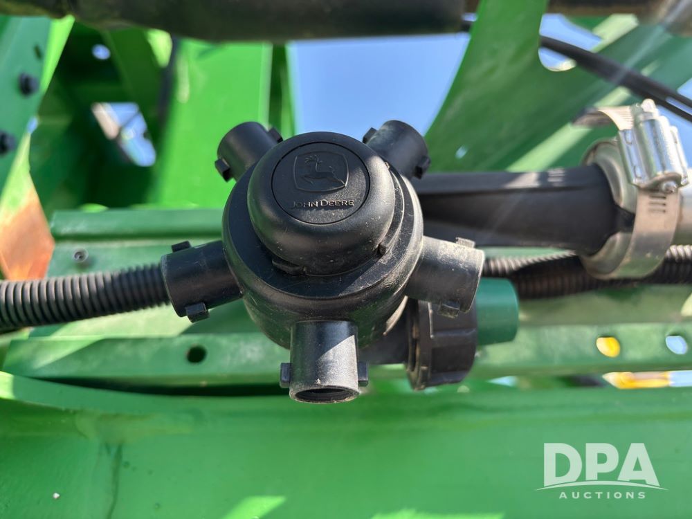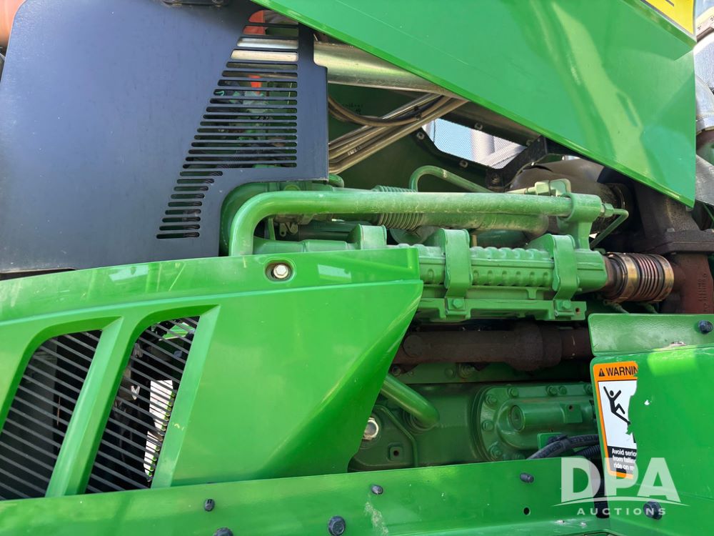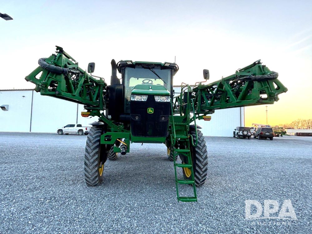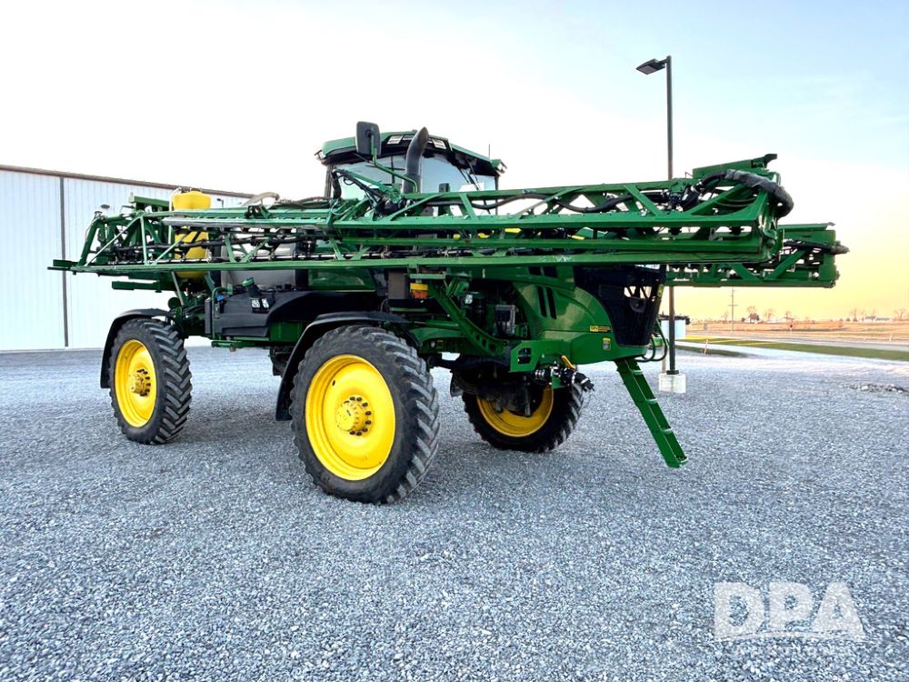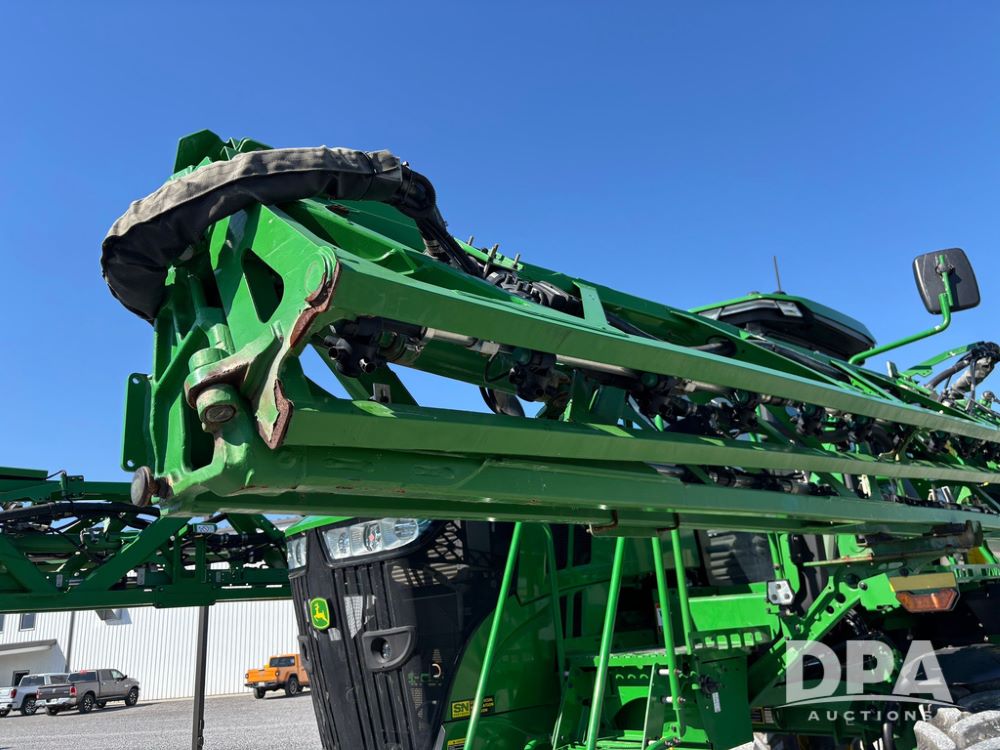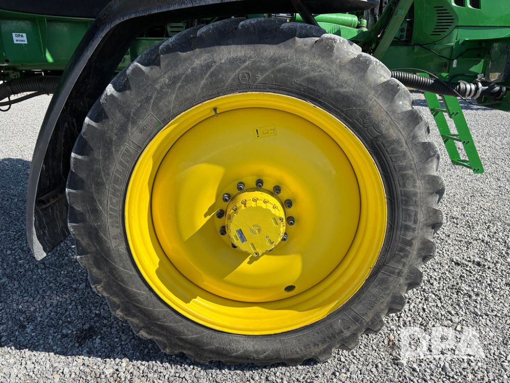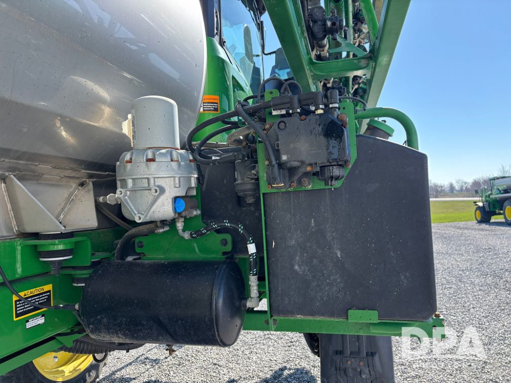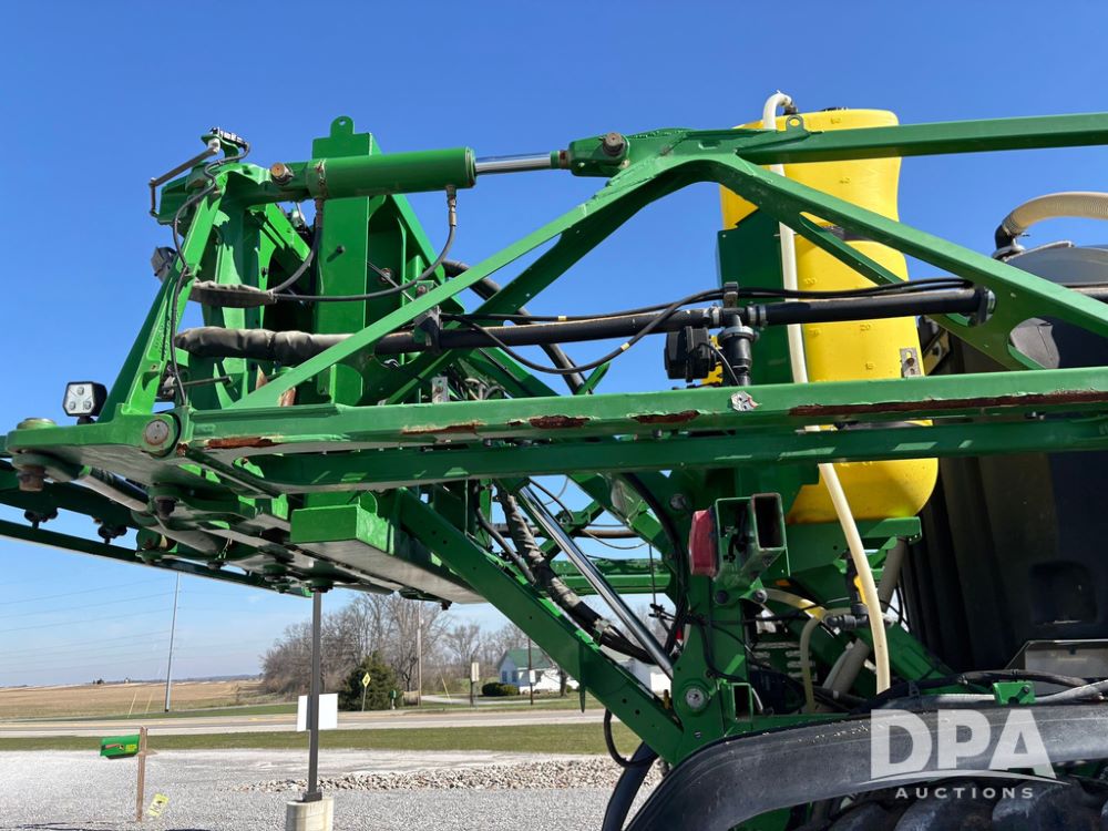 2023 John Deere 410R Sprayer (GP12953), full time 4 wheel drive with traction control, 9.0L - 6 cylinder turbo diesel engine - 310 HP (S/N RG6090U132442), dual range hydrostatic drive (25 MPH field, 35 MPH transport), JDLink MTG, CommandView 4 cab, HVAC, ultimate comfort and convenience package, auto temp control, Active II leather air suspension seat, leather buddy seat, premium touch screen Am/Fm radio, refrigerator, 1,000 gallon stainless steel liquid system, 3" left side quick fill and front fill, 120' steel boom, 1" stainless plumbing, 15" on-center spacing, (97) five position nozzle bodies, (11) section boom control valves, automatic solution control, fence row nozzles left & right, single drop foam markers, 3"x2" high flow solution pump (15 to 225 GPM), boom air purge, 5 sensor auto boom leveling, underframe crop shields, direct chemical injection system with (2) 50 gallon tanks & (1) high volume pump, hydraulic tread spacing adjustment (120-160"), auto air spring chassis leveling, on board air compressor, 380/90R46 tires, Cat 1 air filtration system, Gen 4, 4600 Command Center Gen4 GreenStar 10" color display and extended monitor, Command Center Premium 3.0 activation auto trac, section control, RowSense, Data Sync & Data Share, mechanical RowSense sensors and vision camera, premium visibility package, LED field lighting, LED beacon lights, rear view camera, Integrated SF7000 SF-1 global position receiver, shows 1,655 hours.