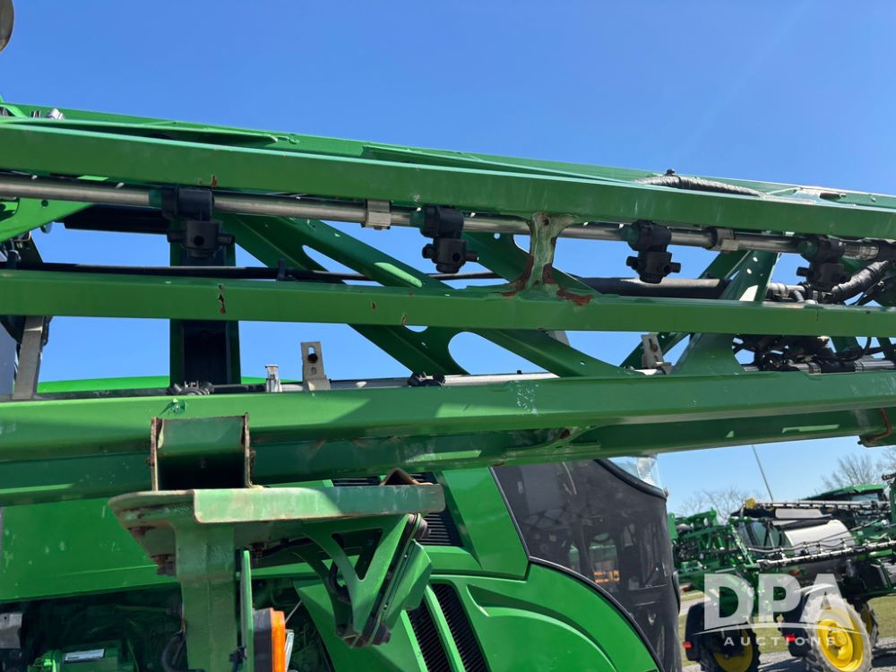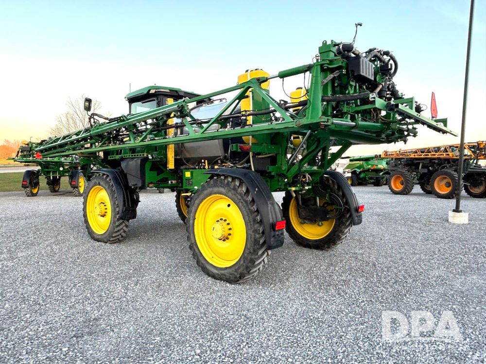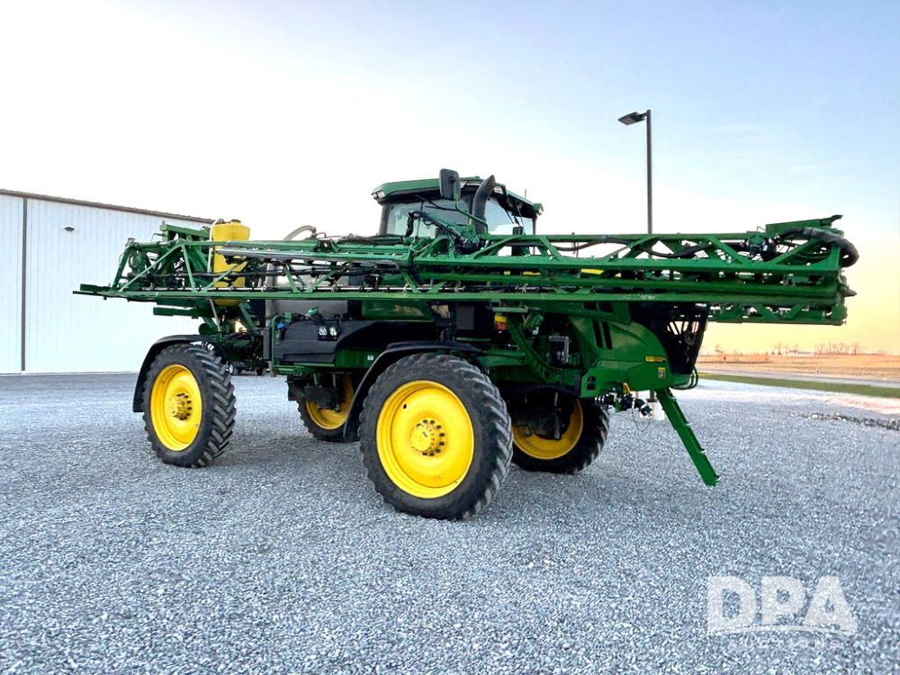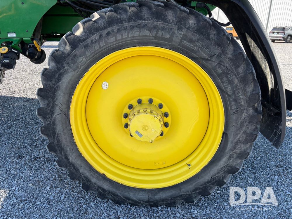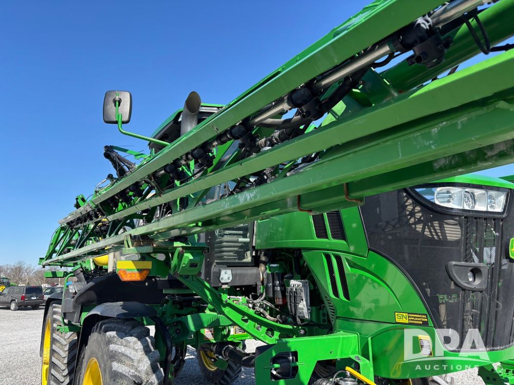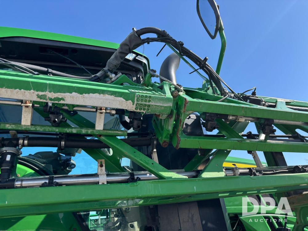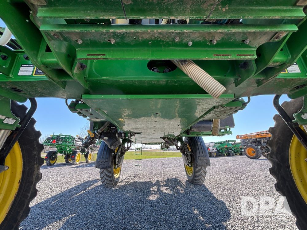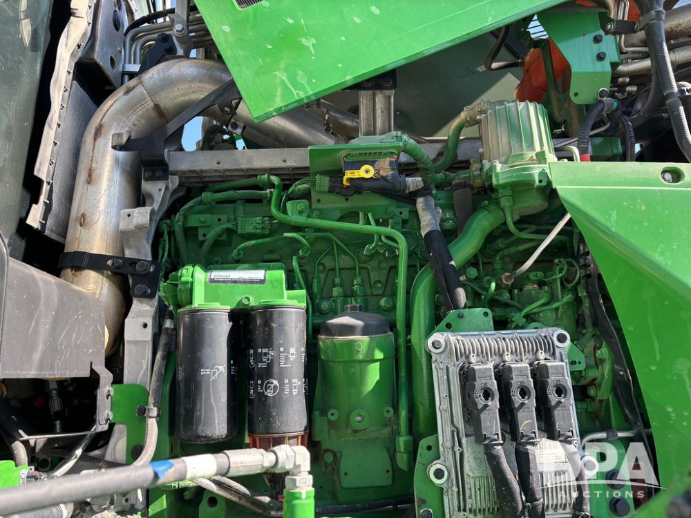 2023 John Deere 410R Sprayer (GP12953), full time 4 wheel drive with traction control, 9.0L - 6 cylinder turbo diesel engine - 310 HP (S/N RG6090U132442), dual range hydrostatic drive (25 MPH field, 35 MPH transport), JDLink MTG, CommandView 4 cab, HVAC, ultimate comfort and convenience package, auto temp control, Active II leather air suspension seat, leather buddy seat, premium touch screen Am/Fm radio, refrigerator, 1,000 gallon stainless steel liquid system, 3" left side quick fill and front fill, 120' steel boom, 1" stainless plumbing, 15" on-center spacing, (97) five position nozzle bodies, (11) section boom control valves, automatic solution control, fence row nozzles left & right, single drop foam markers, 3"x2" high flow solution pump (15 to 225 GPM), boom air purge, 5 sensor auto boom leveling, underframe crop shields, direct chemical injection system with (2) 50 gallon tanks & (1) high volume pump, hydraulic tread spacing adjustment (120-160"), auto air spring chassis leveling, on board air compressor, 380/90R46 tires, Cat 1 air filtration system, Gen 4, 4600 Command Center Gen4 GreenStar 10" color display and extended monitor, Command Center Premium 3.0 activation auto trac, section control, RowSense, Data Sync & Data Share, mechanical RowSense sensors and vision camera, premium visibility package, LED field lighting, LED beacon lights, rear view camera, Integrated SF7000 SF-1 global position receiver, shows 1,655 hours.