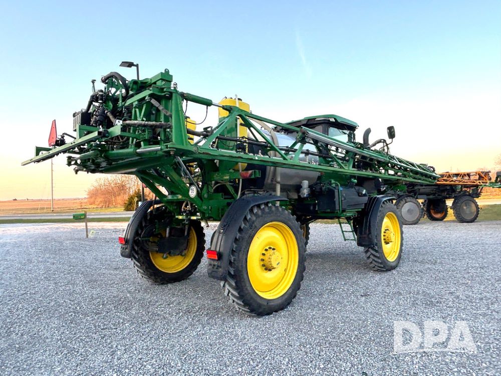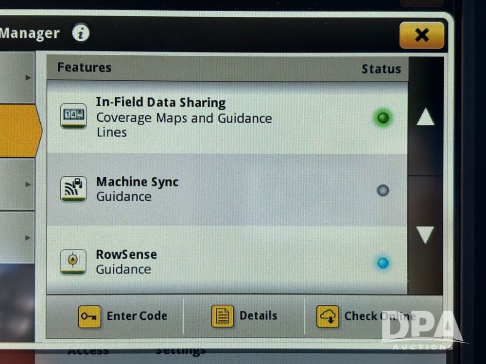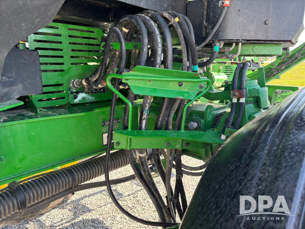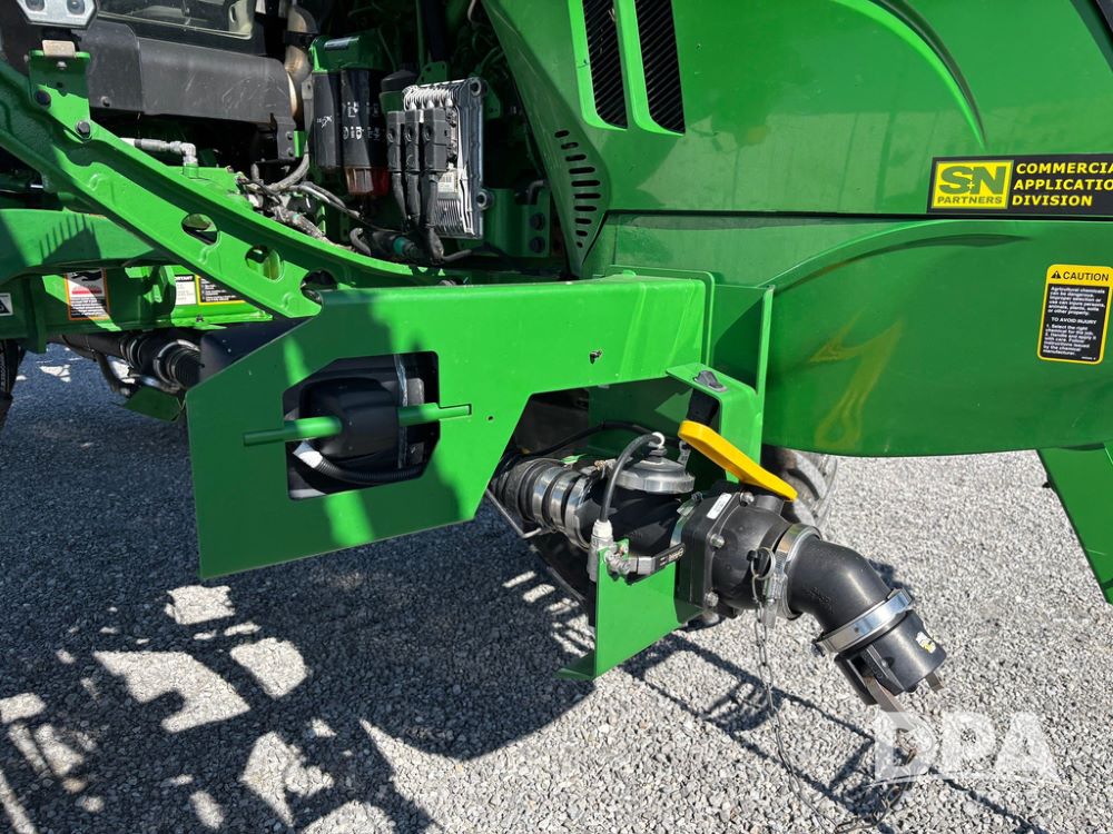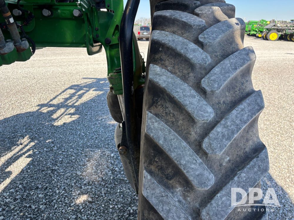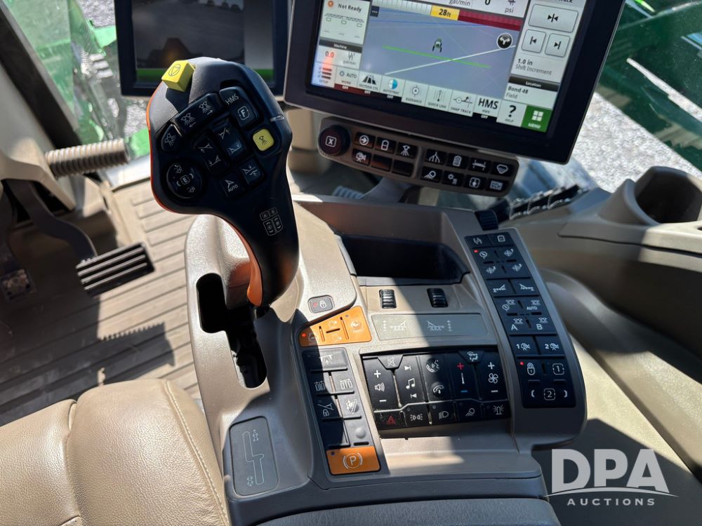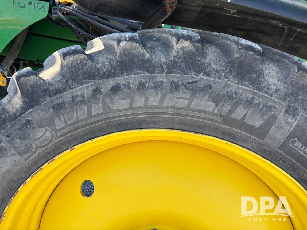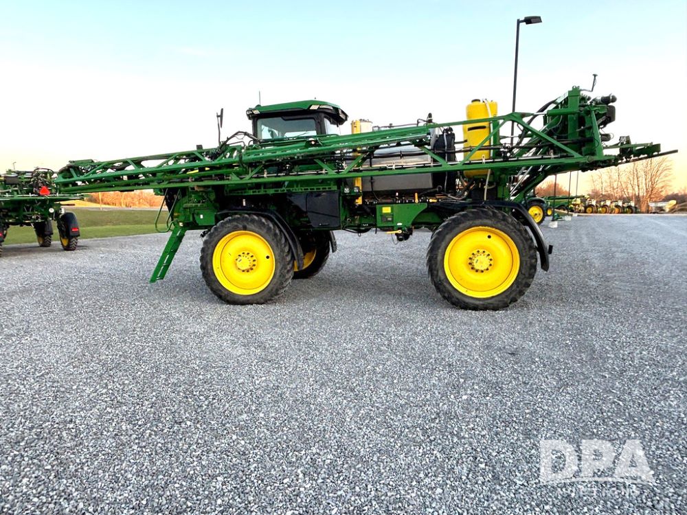 2023 John Deere 410R Sprayer (GP12953), full time 4 wheel drive with traction control, 9.0L - 6 cylinder turbo diesel engine - 310 HP (S/N RG6090U132442), dual range hydrostatic drive (25 MPH field, 35 MPH transport), JDLink MTG, CommandView 4 cab, HVAC, ultimate comfort and convenience package, auto temp control, Active II leather air suspension seat, leather buddy seat, premium touch screen Am/Fm radio, refrigerator, 1,000 gallon stainless steel liquid system, 3" left side quick fill and front fill, 120' steel boom, 1" stainless plumbing, 15" on-center spacing, (97) five position nozzle bodies, (11) section boom control valves, automatic solution control, fence row nozzles left & right, single drop foam markers, 3"x2" high flow solution pump (15 to 225 GPM), boom air purge, 5 sensor auto boom leveling, underframe crop shields, direct chemical injection system with (2) 50 gallon tanks & (1) high volume pump, hydraulic tread spacing adjustment (120-160"), auto air spring chassis leveling, on board air compressor, 380/90R46 tires, Cat 1 air filtration system, Gen 4, 4600 Command Center Gen4 GreenStar 10" color display and extended monitor, Command Center Premium 3.0 activation auto trac, section control, RowSense, Data Sync & Data Share, mechanical RowSense sensors and vision camera, premium visibility package, LED field lighting, LED beacon lights, rear view camera, Integrated SF7000 SF-1 global position receiver, shows 1,655 hours.