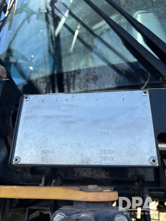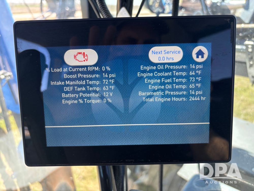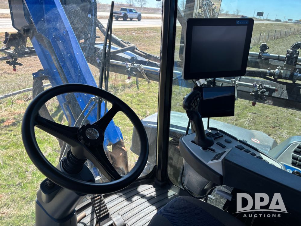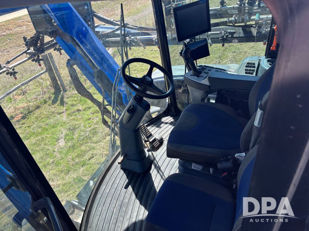2019 New Holland SP370F Sprayer (NP6617), diesel engine, hydrostatic transmission, heat, Am/Fm radio, buddy seat, 1,600 gallon stainless steel liquid system, 120' boom, hydraulic wheel spacing, Raven Viper 4 monitor, shows 2,444 hours.