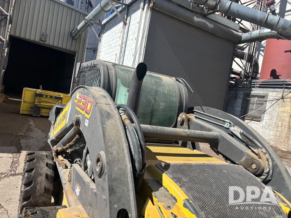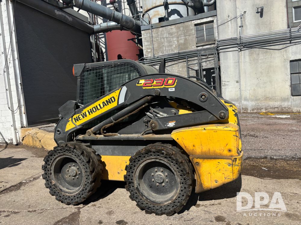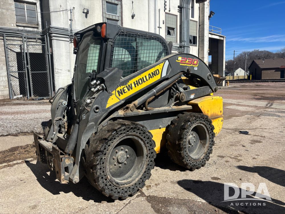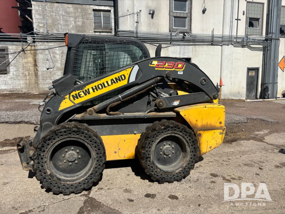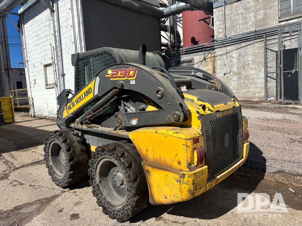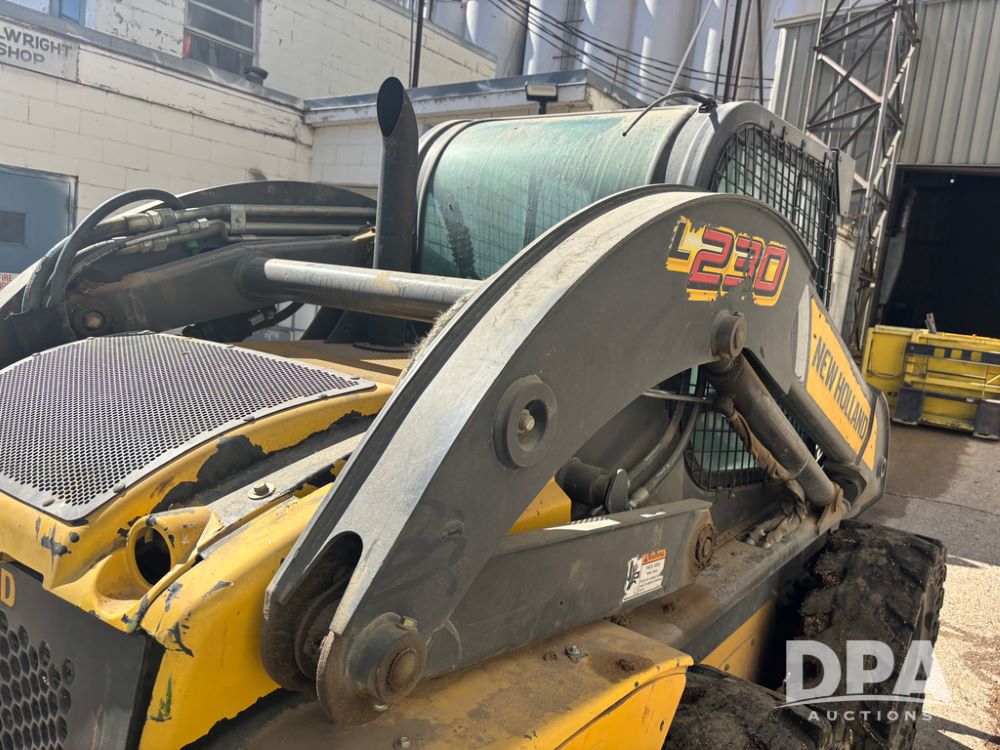 New Holland Skid Loader (DR13562), model L230, diesel engine, hydrostatic drive, enclosed cab w/heat and air conditioning, auxiliary hydraulic and electrical outlets, solid tires, quick tach front 84'' bucket, AM/FM radio, shows 3728 hours.