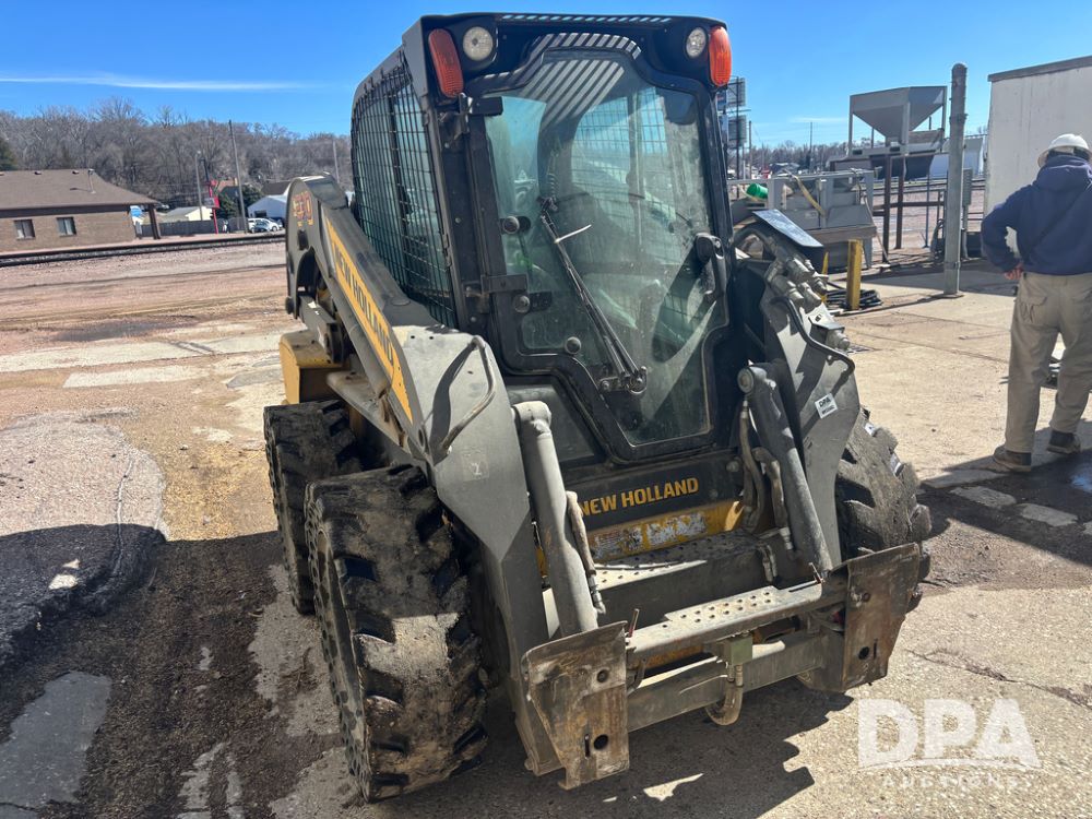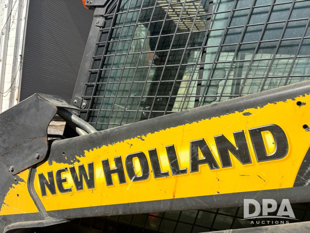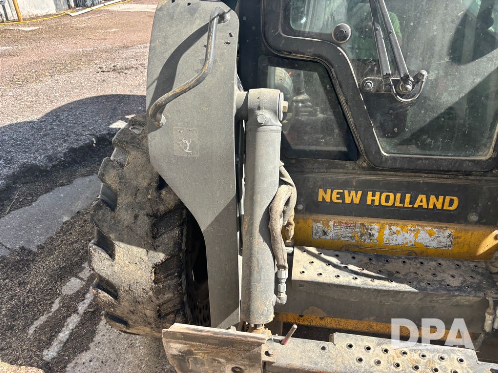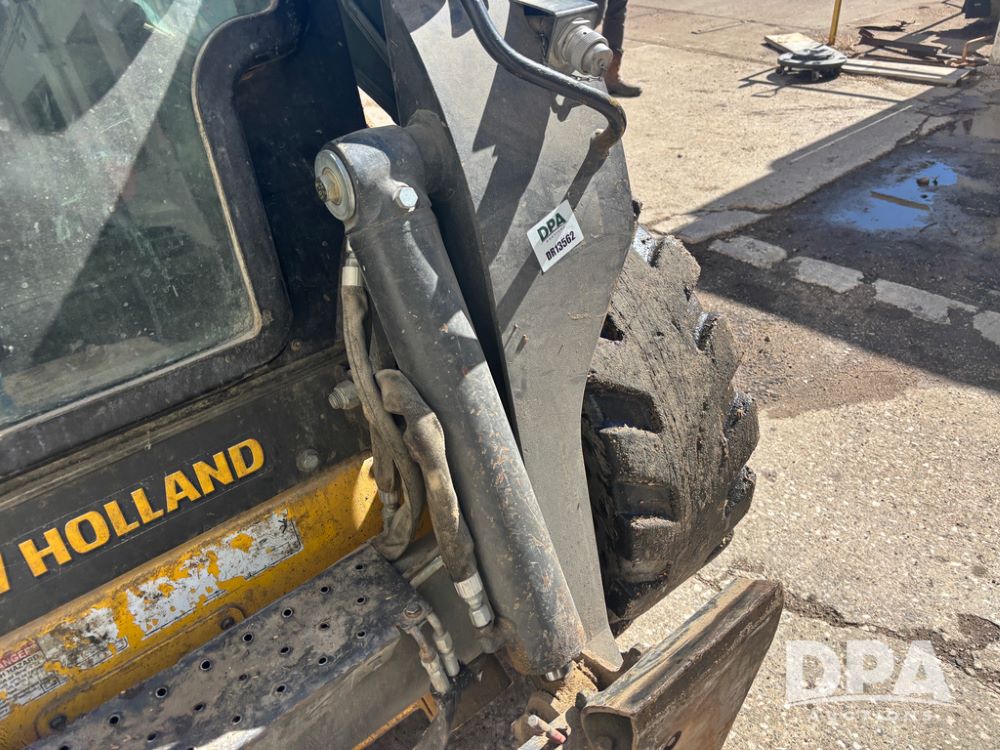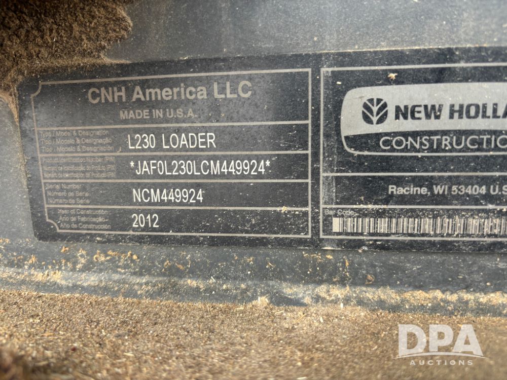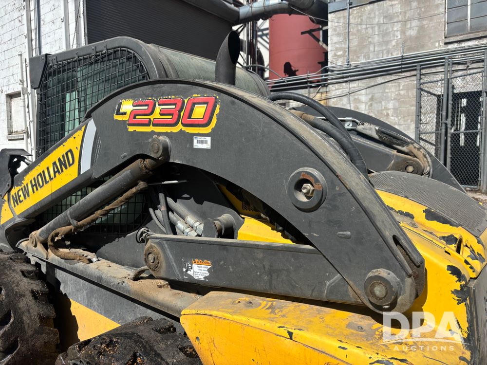 New Holland Skid Loader (DR13562), model L230, diesel engine, hydrostatic drive, enclosed cab w/heat and air conditioning, auxiliary hydraulic and electrical outlets, solid tires, quick tach front 84'' bucket, AM/FM radio, shows 3728 hours.