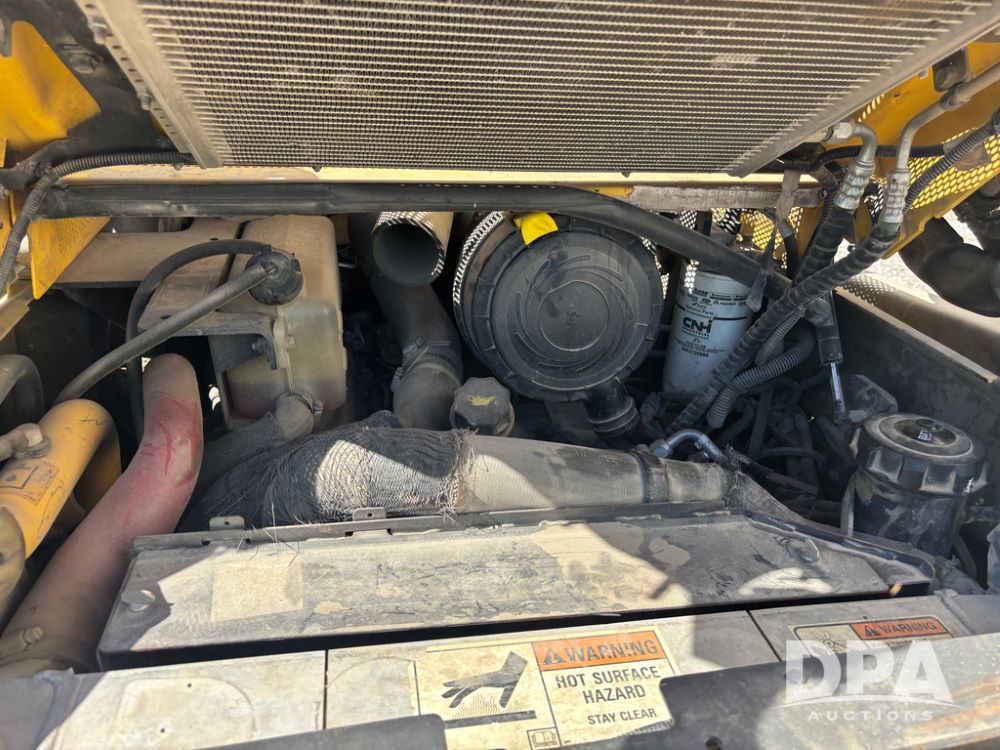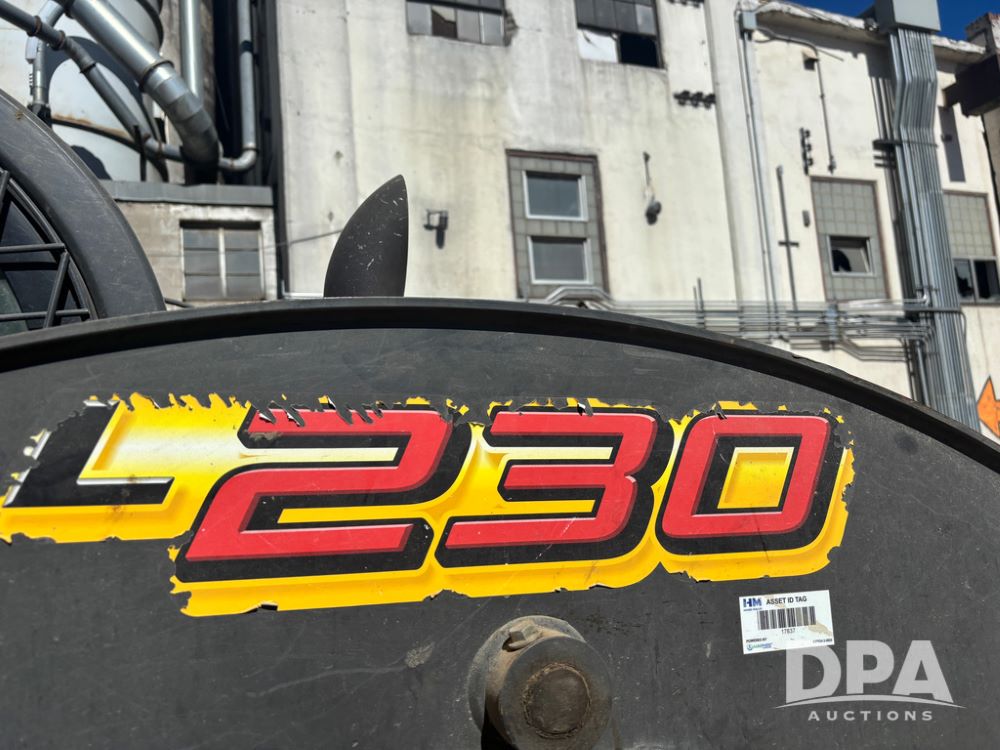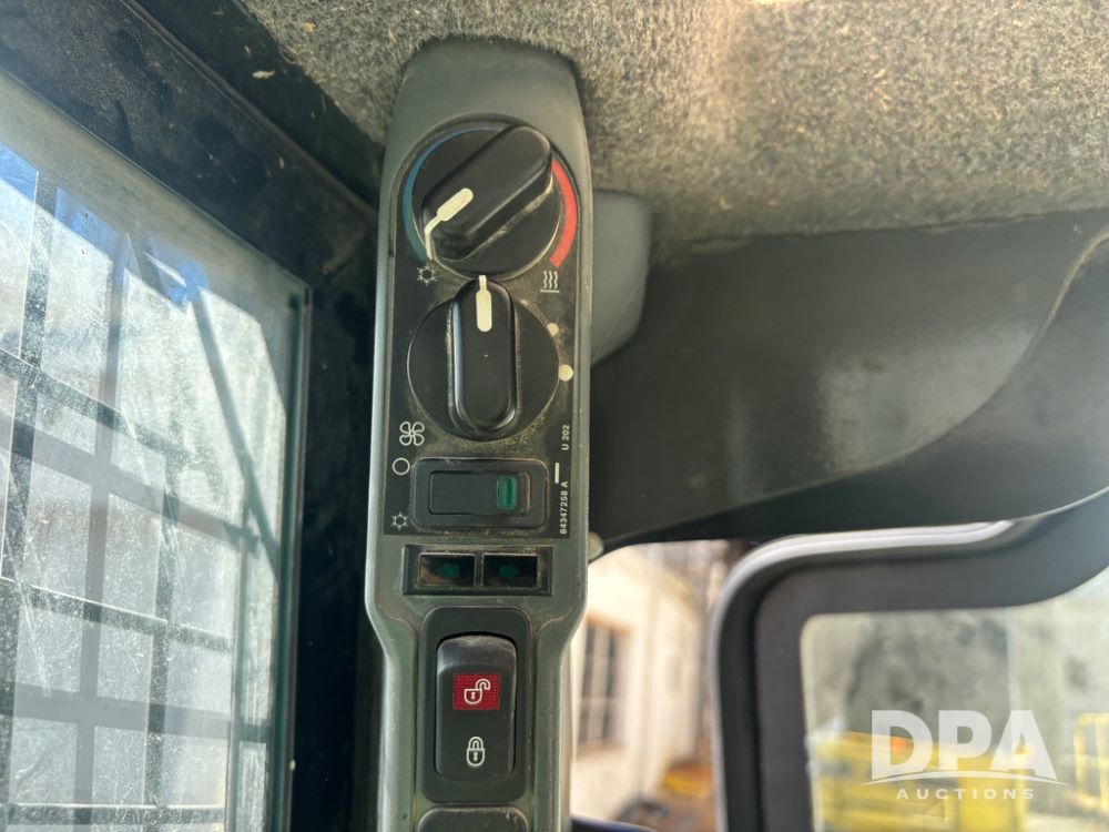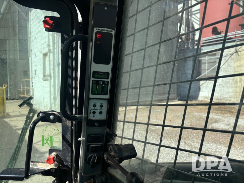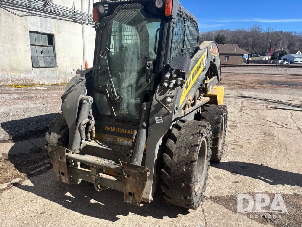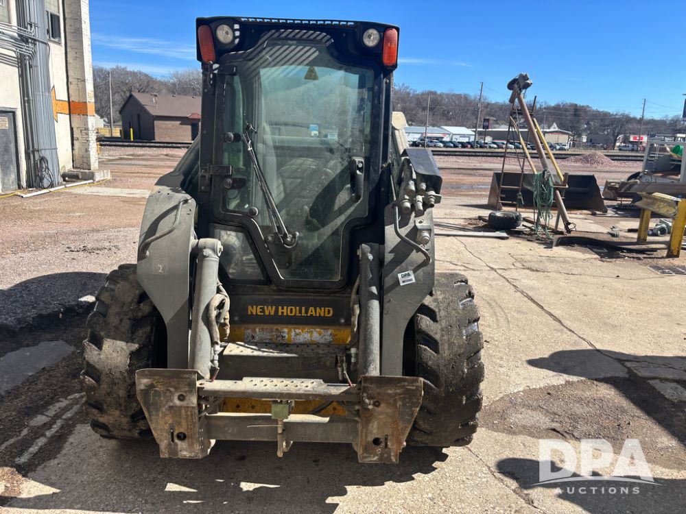 New Holland Skid Loader (DR13562), model L230, diesel engine, hydrostatic drive, enclosed cab w/heat and air conditioning, auxiliary hydraulic and electrical outlets, solid tires, quick tach front 84'' bucket, AM/FM radio, shows 3728 hours.