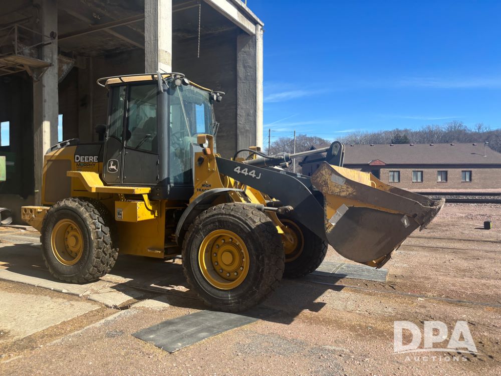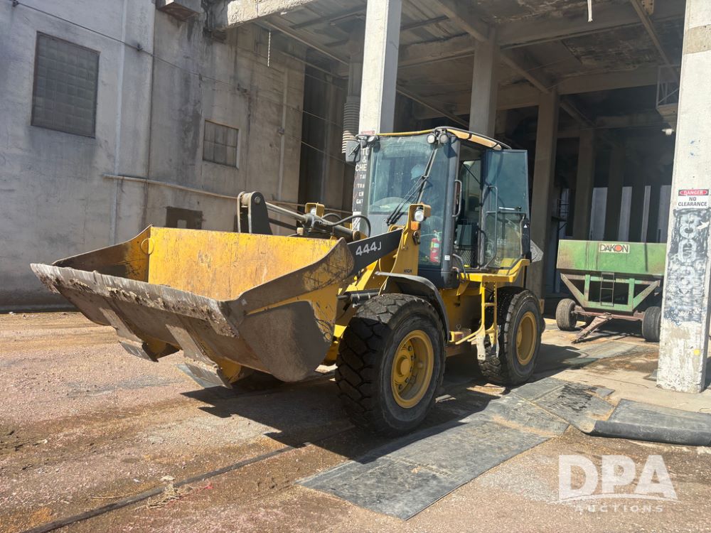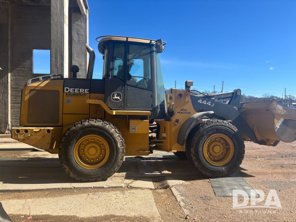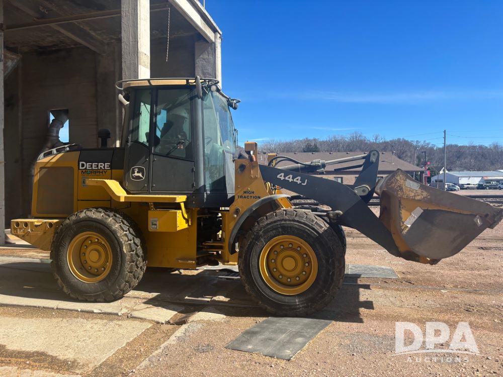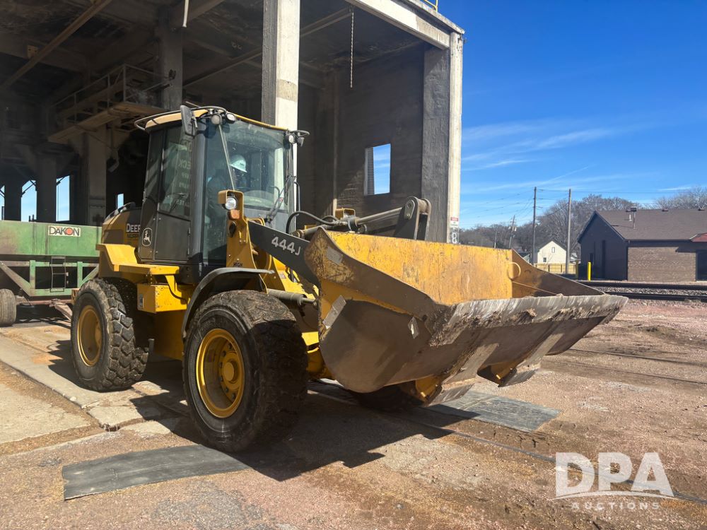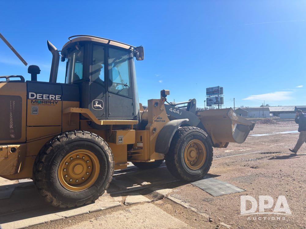 John Deere 444J Loader (DR13564), John Deere diesel engine, shuttle shift drive, enclosed cab w/heat & air conditioning, High traction model, 99'' front bucket, rear weights and hitch, AM/FM CD radio, 17.5R25 tires, full fenders, shows 6,430 hours.
