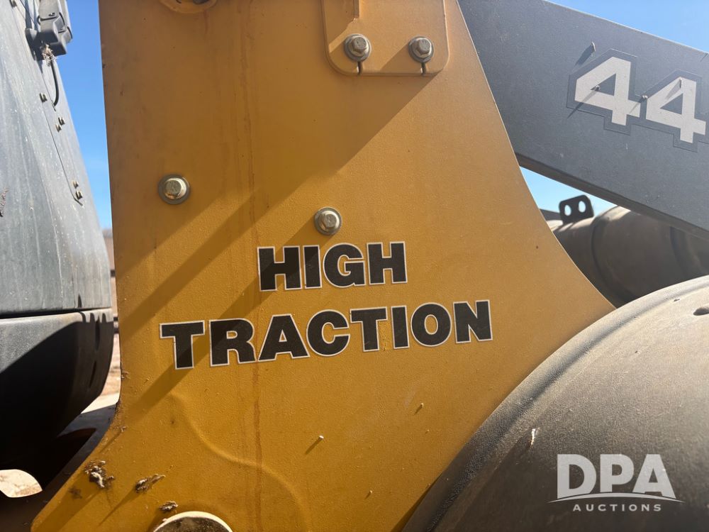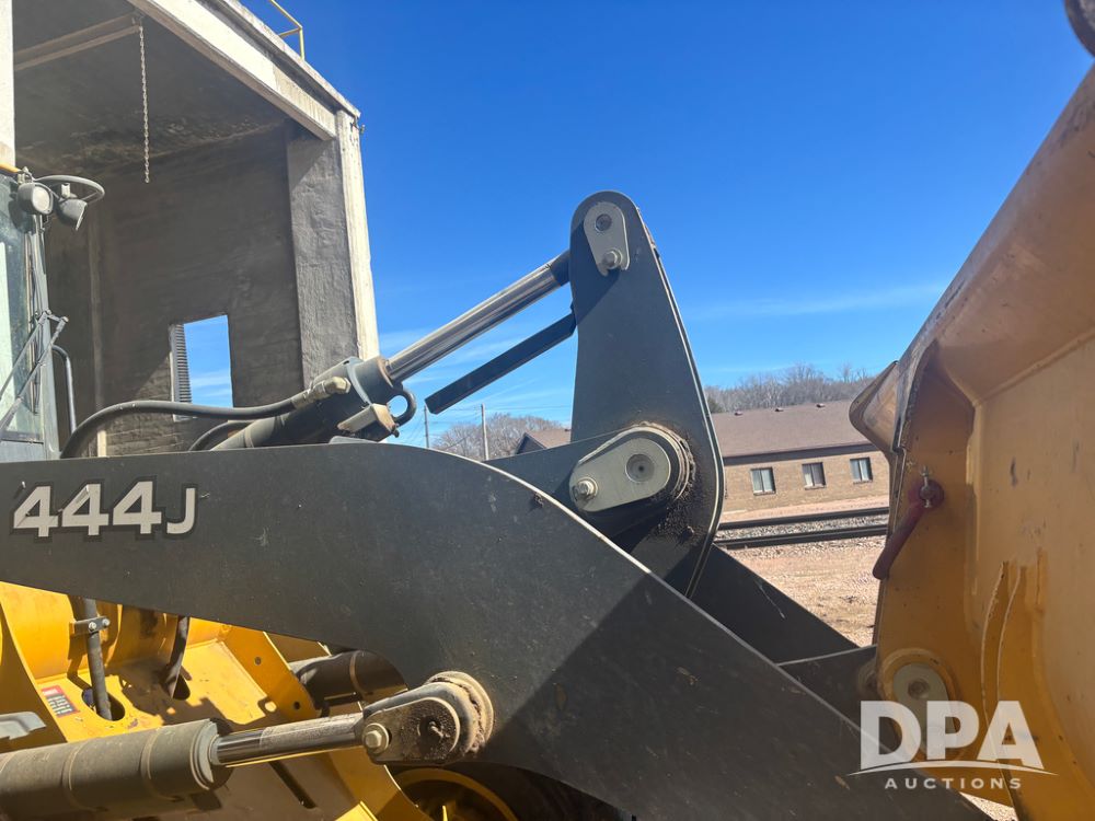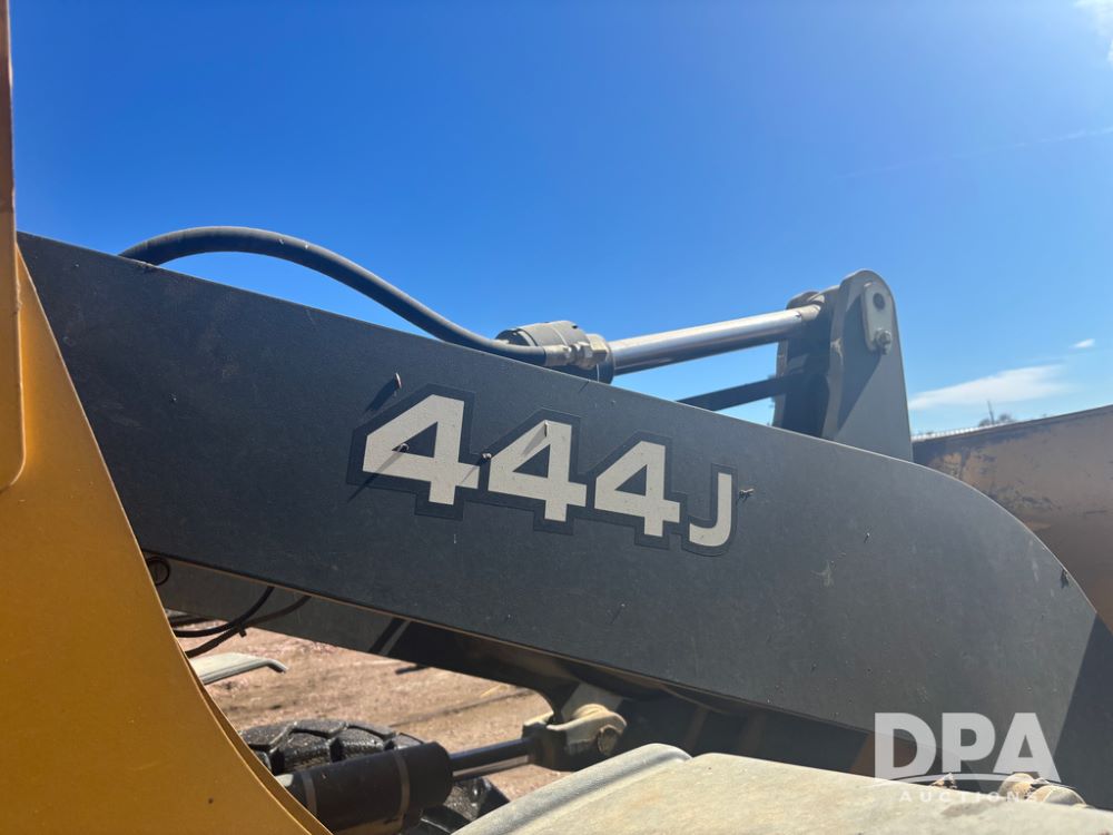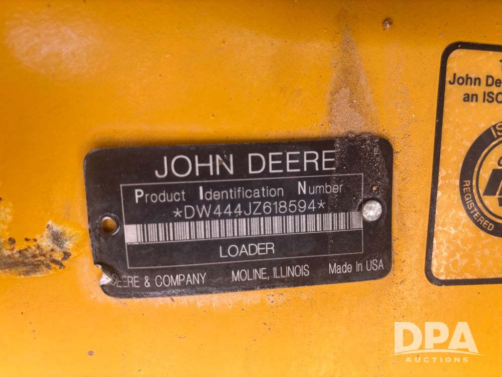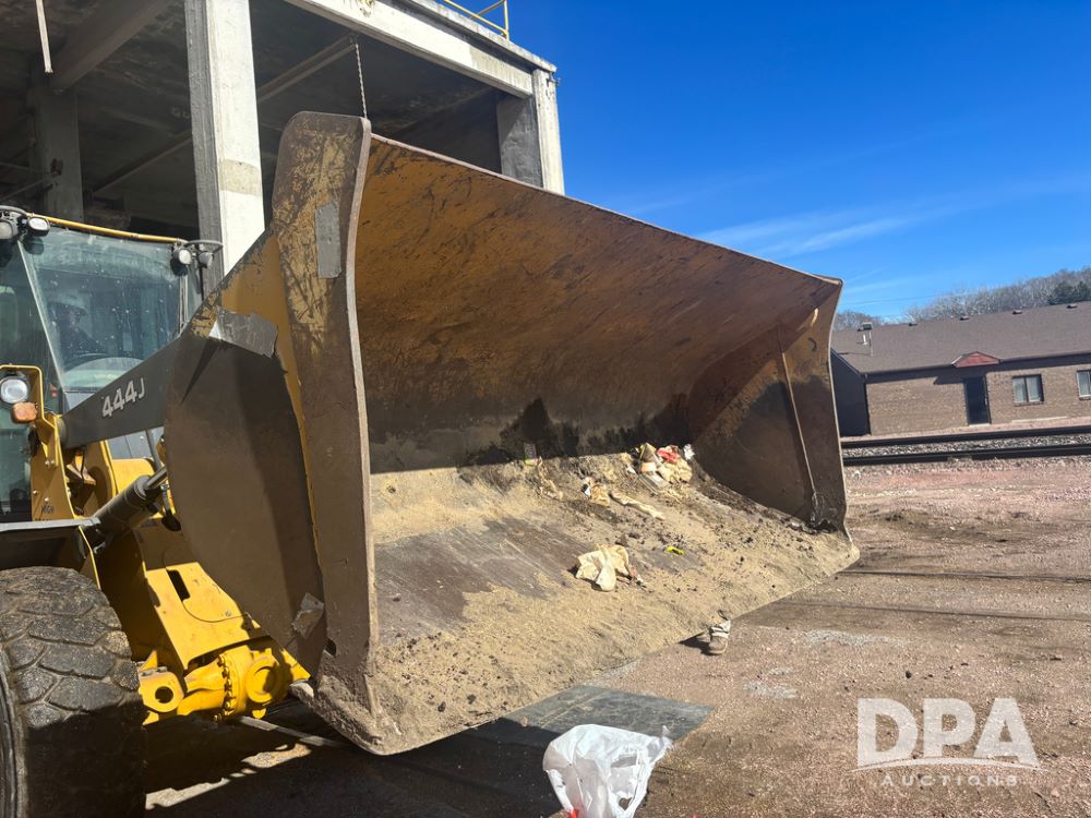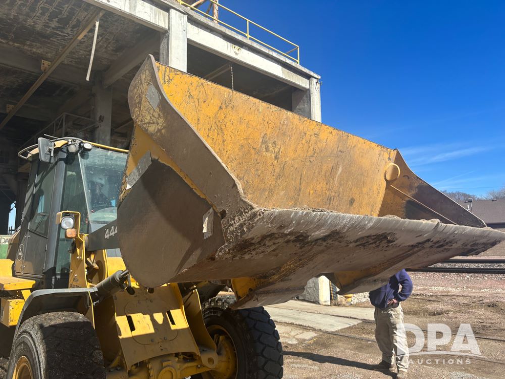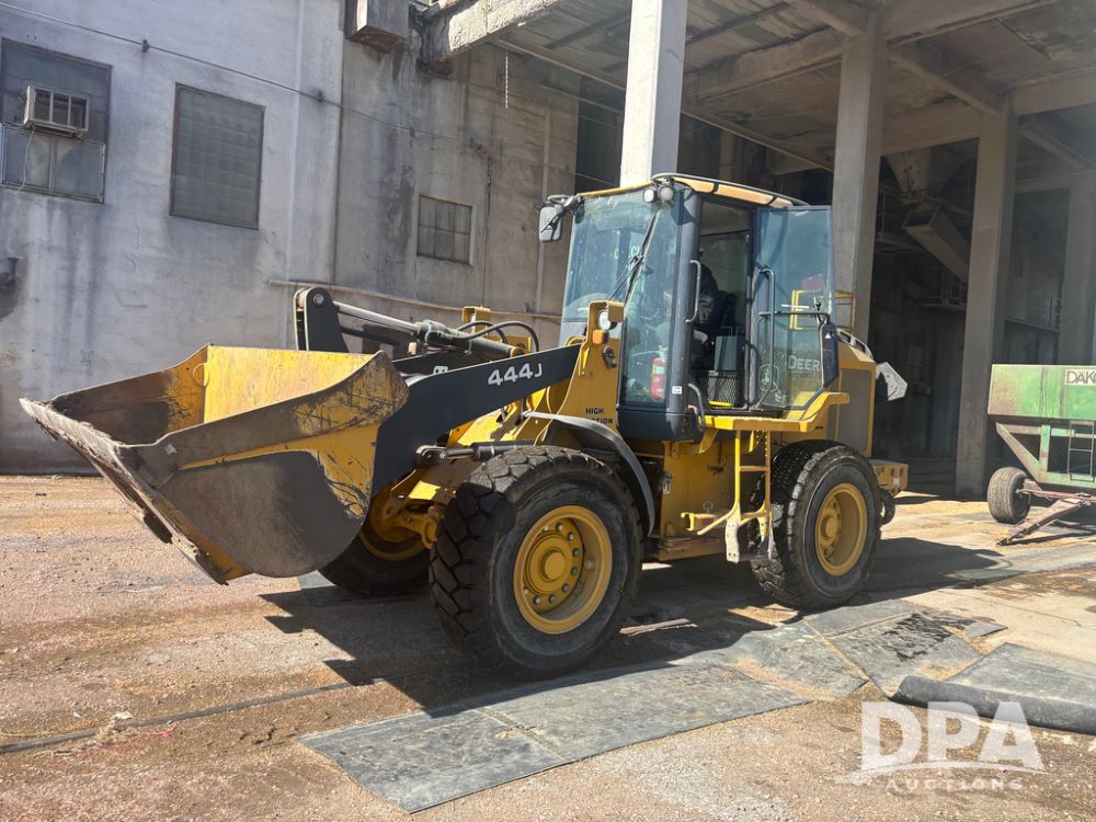 John Deere 444J Loader (DR13564), John Deere diesel engine, shuttle shift drive, enclosed cab w/heat & air conditioning, High traction model, 99'' front bucket, rear weights and hitch, AM/FM CD radio, 17.5R25 tires, full fenders, shows 6,430 hours.