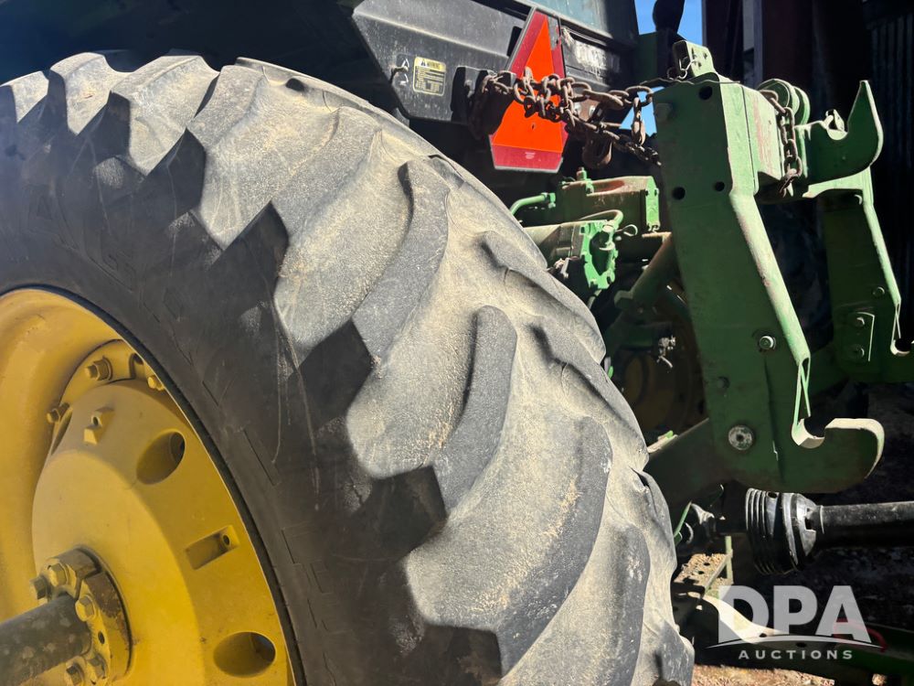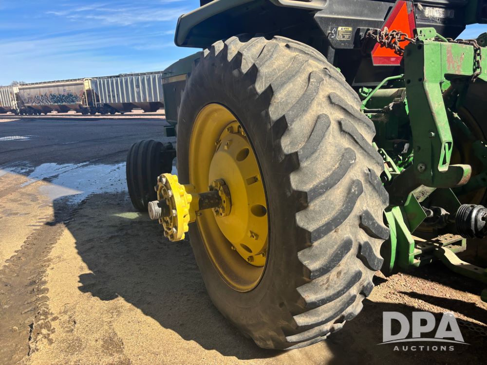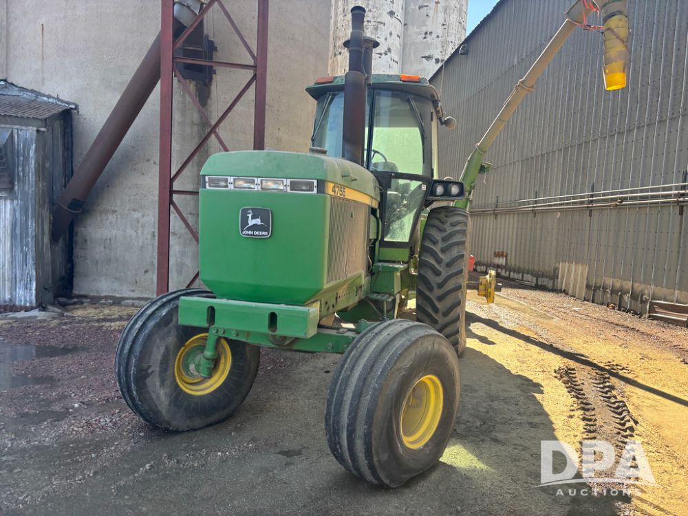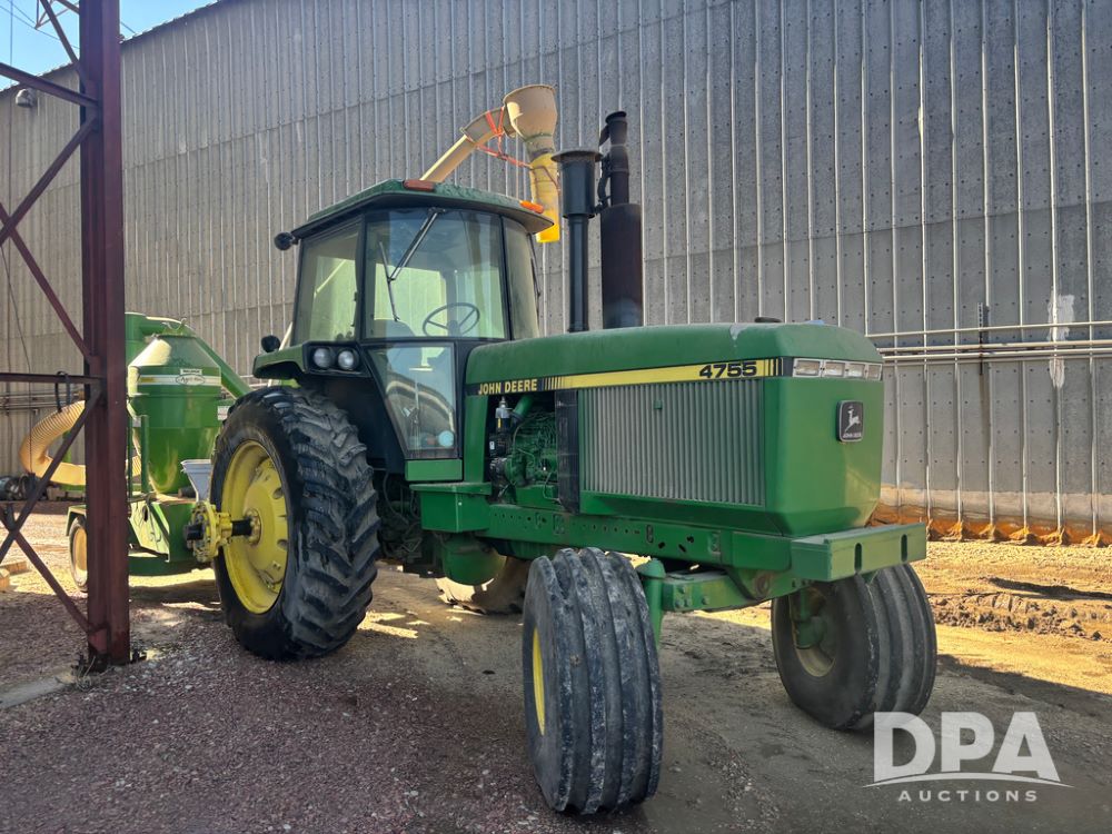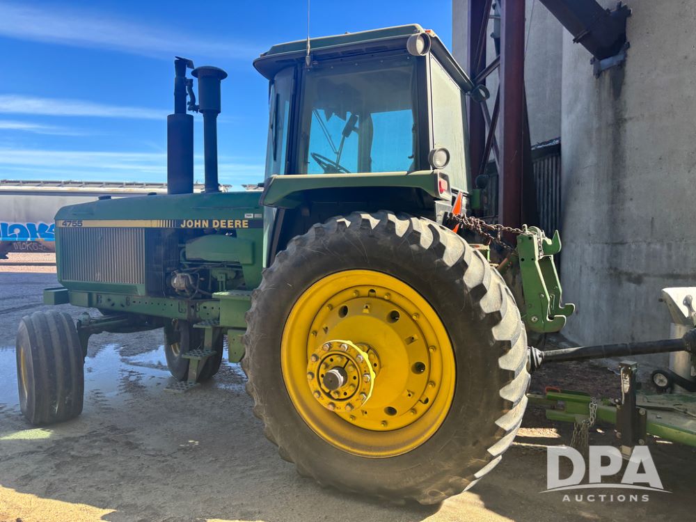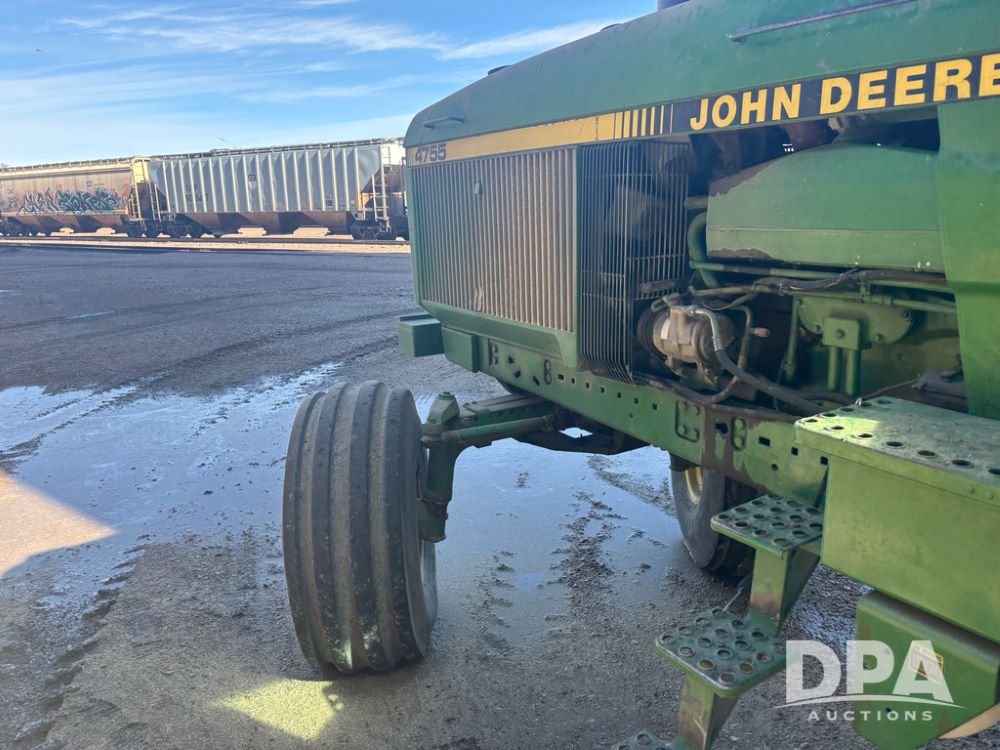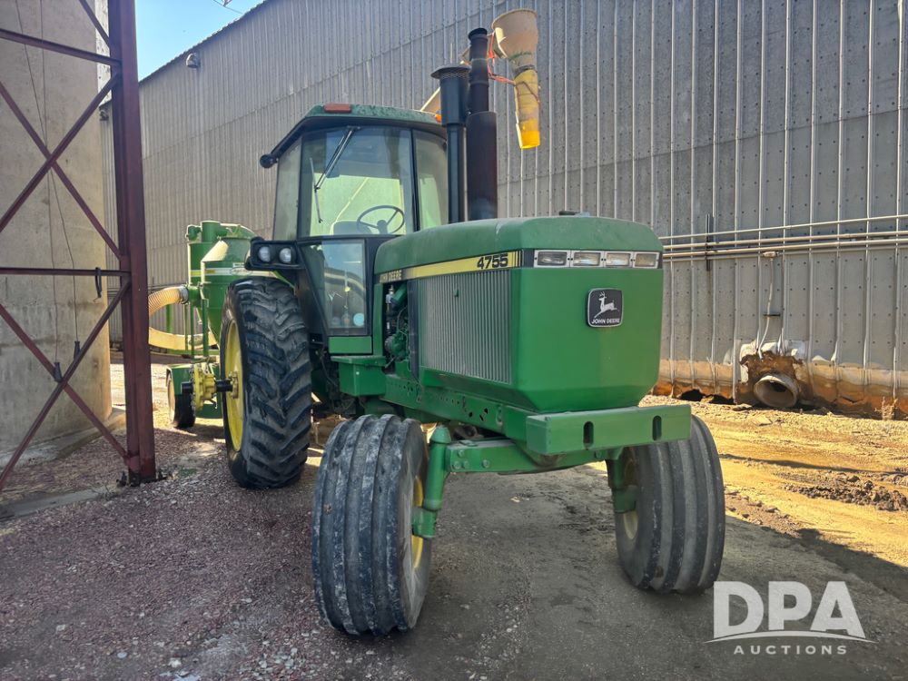 John Deere 4755 Tractor (DR13569), John Deere diesel engine, power shift transmission, rear 3 point quick hitch, auxiliary hydraulic outlets, 1,000 PTO, wide front has 16.5L-16.1 tires, 18.4R42 rear tires, and dual hubs.
