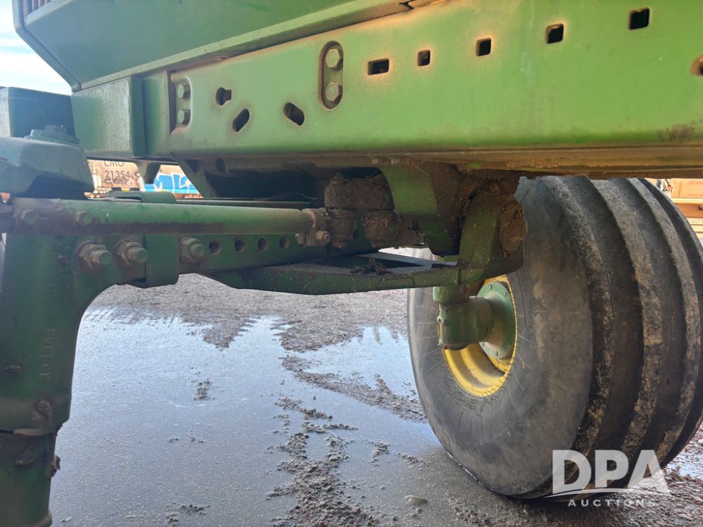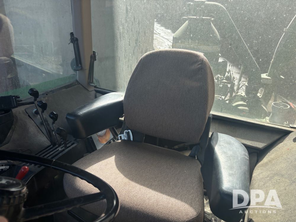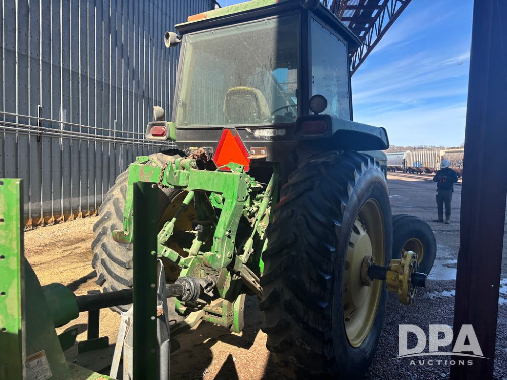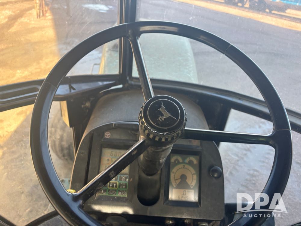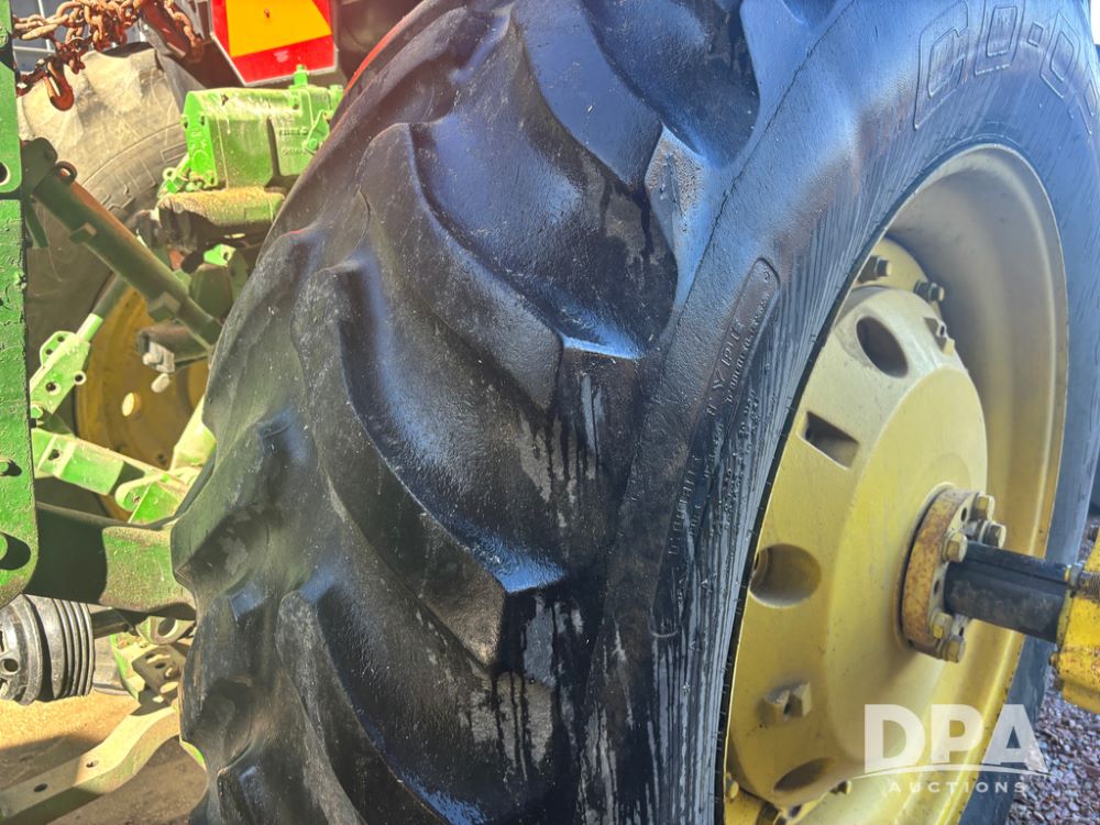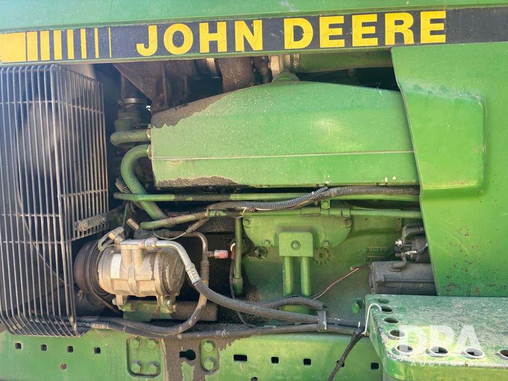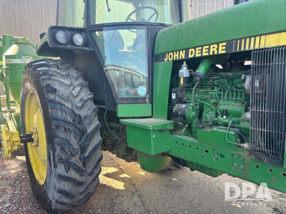 John Deere 4755 Tractor (DR13569), John Deere diesel engine, power shift transmission, rear 3 point quick hitch, auxiliary hydraulic outlets, 1,000 PTO, wide front has 16.5L-16.1 tires, 18.4R42 rear tires, and dual hubs.