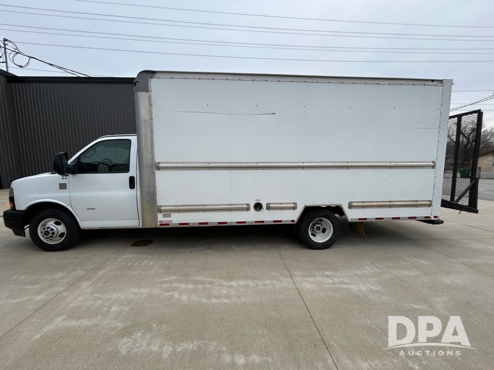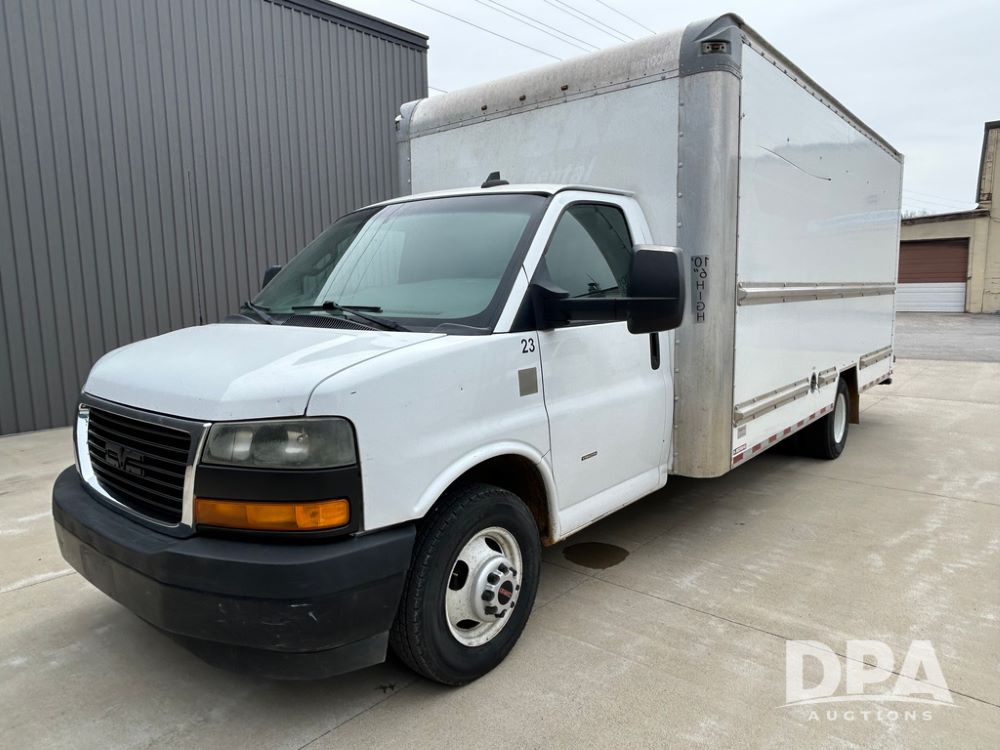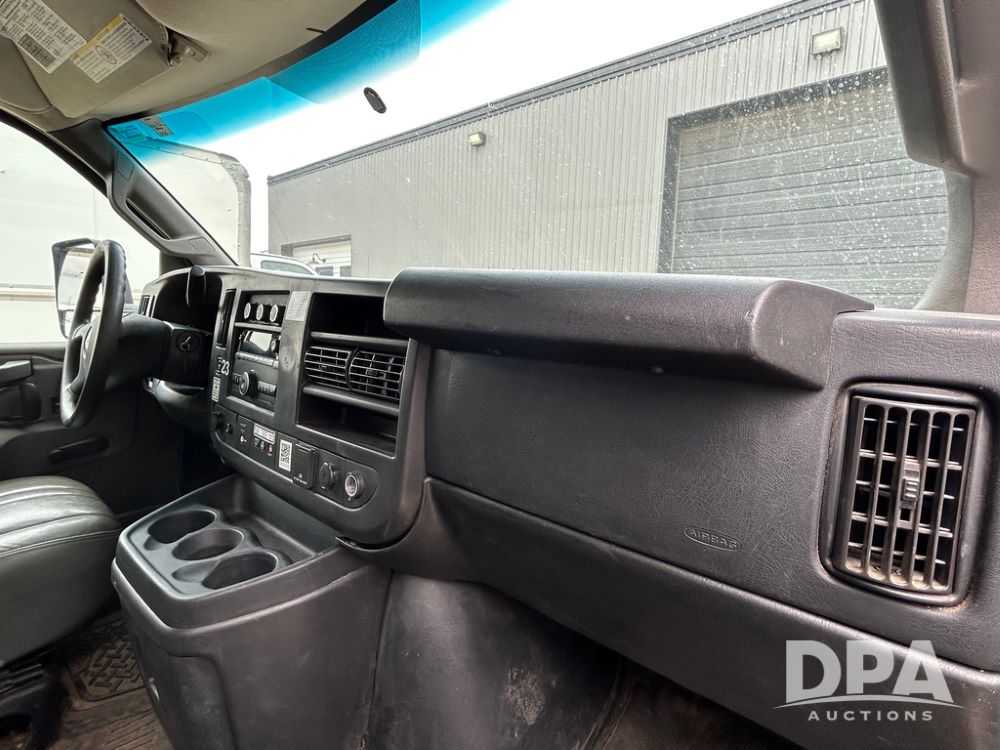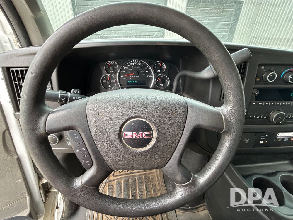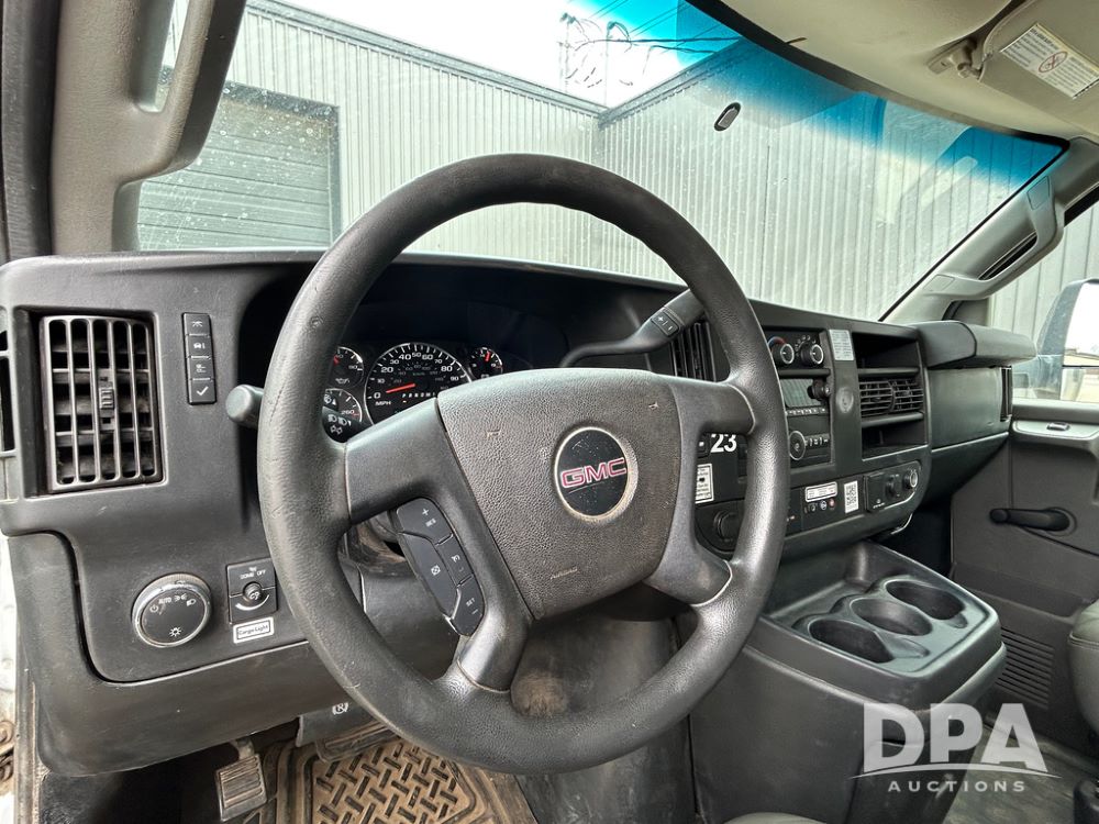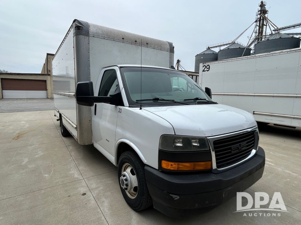2018 GMC Savana 3500 Box Truck (LLD1713, Unit #23), 6.0 gas engine, RWD, 16 foot box, power locks, cruise control, heat, air conditioning, radio, dove tail/ramp (can be removed with 2 bolts & 1 pin), 1 spare tire included, shows 212,665.