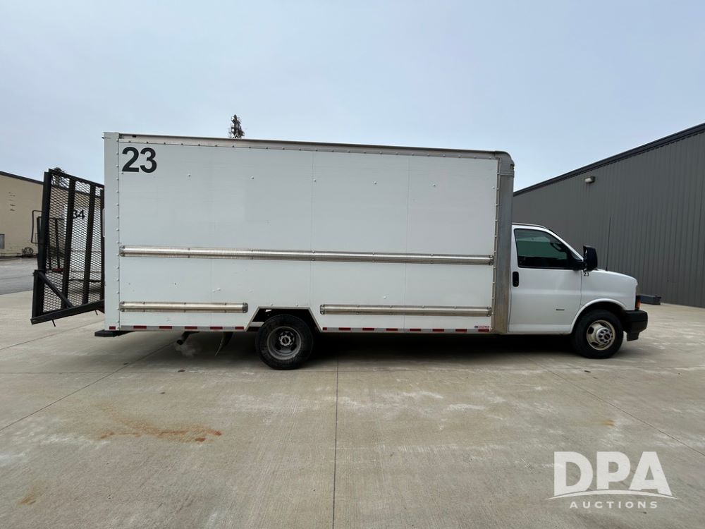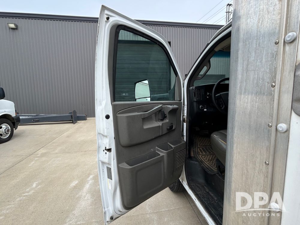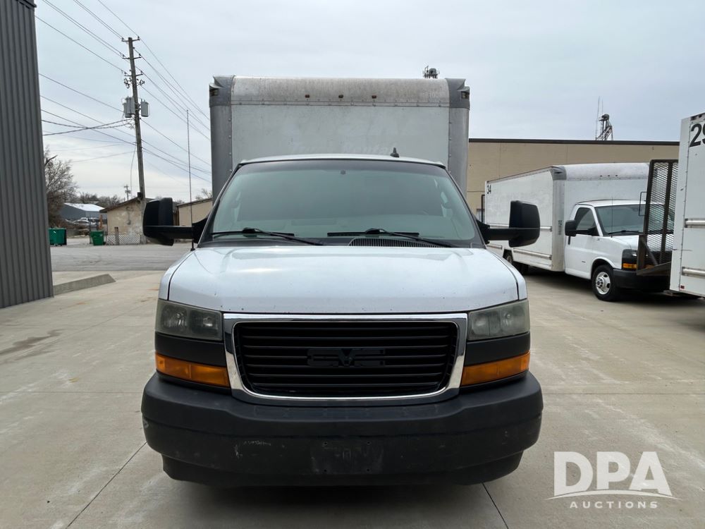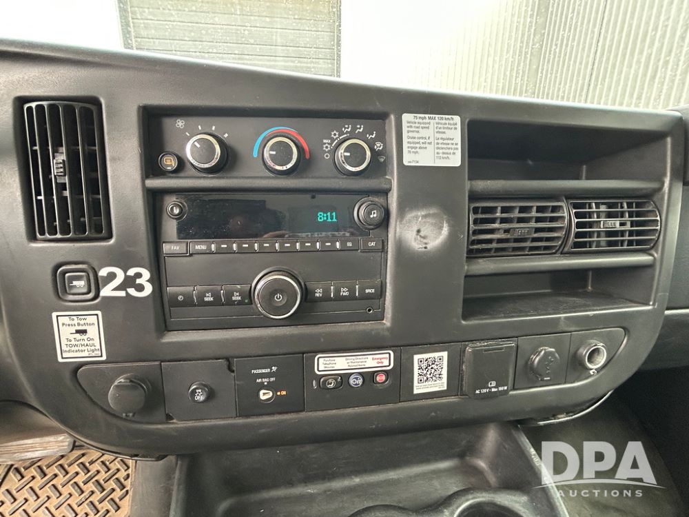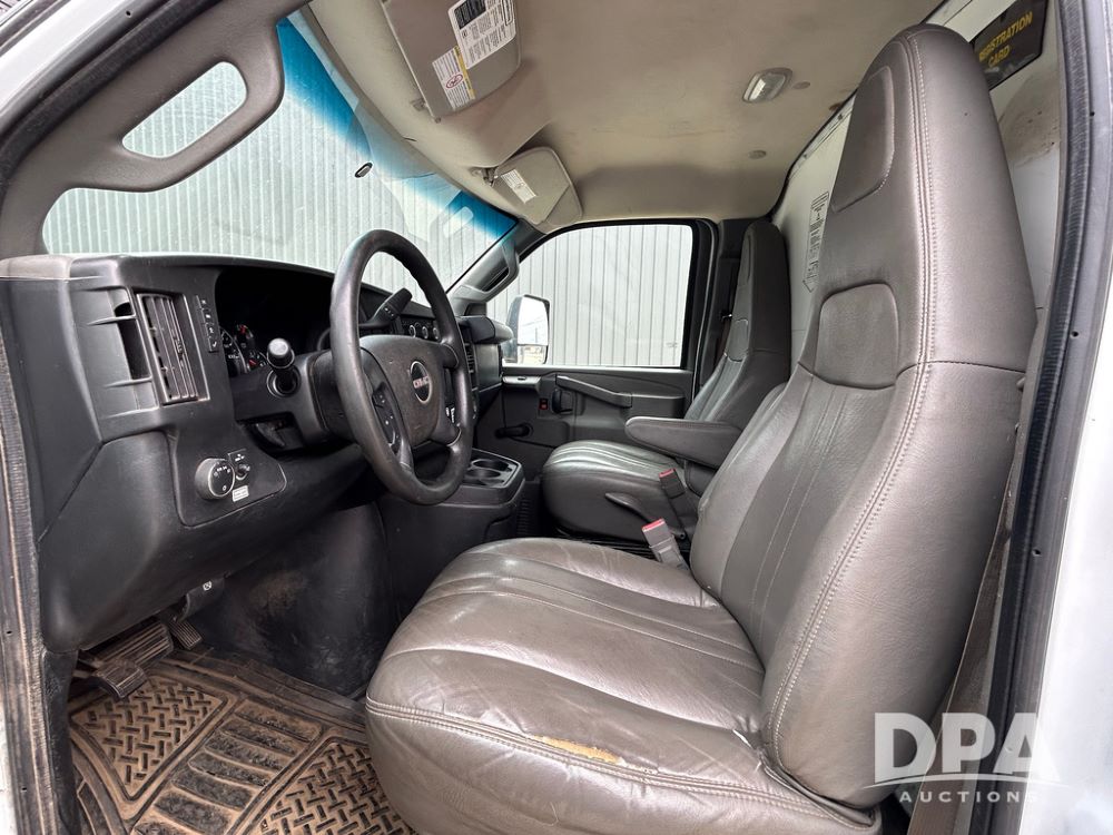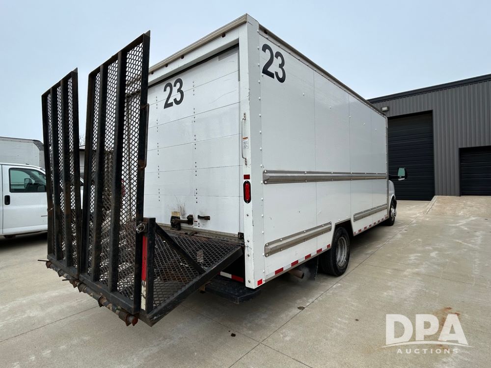 2018 GMC Savana 3500 Box Truck (LLD1713, Unit #23), 6.0 gas engine, RWD, 16 foot box, power locks, cruise control, heat, air conditioning, radio, dove tail/ramp (can be removed with 2 bolts & 1 pin), 1 spare tire included, shows 212,665.
