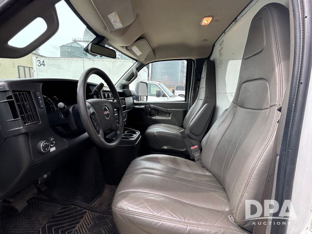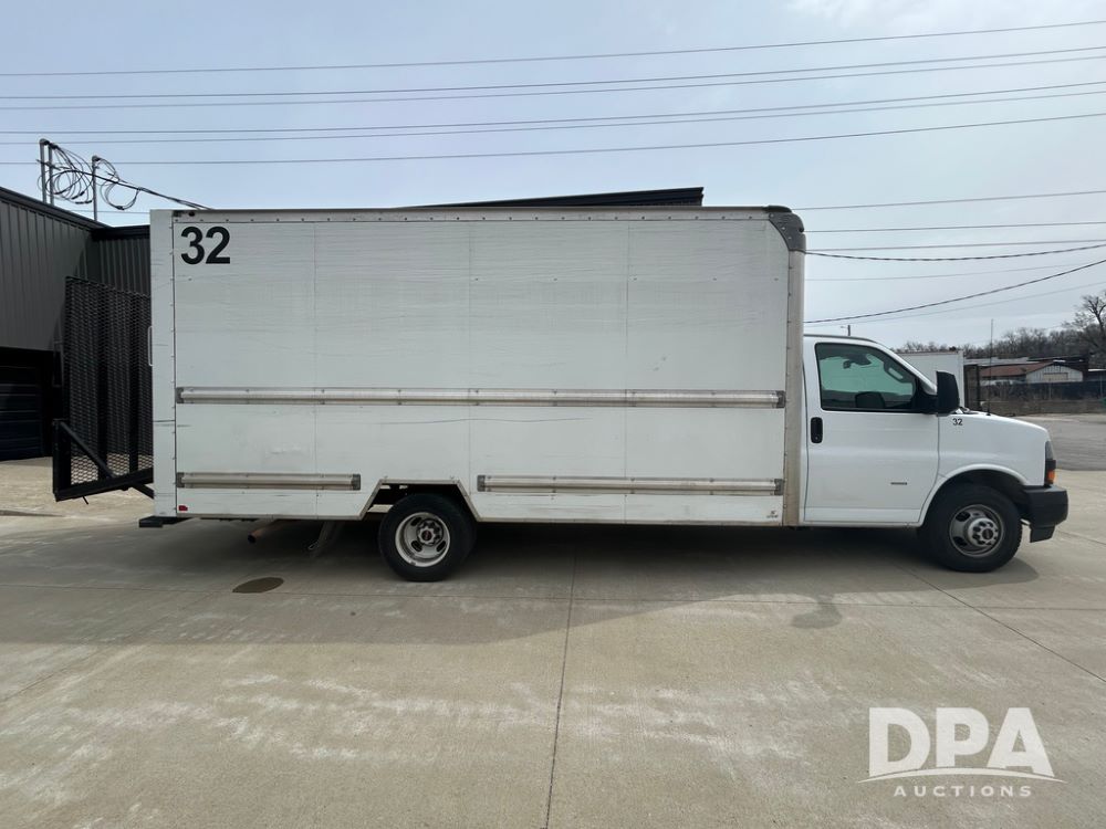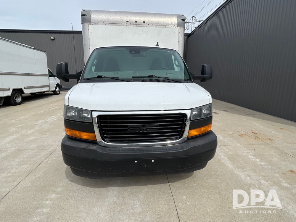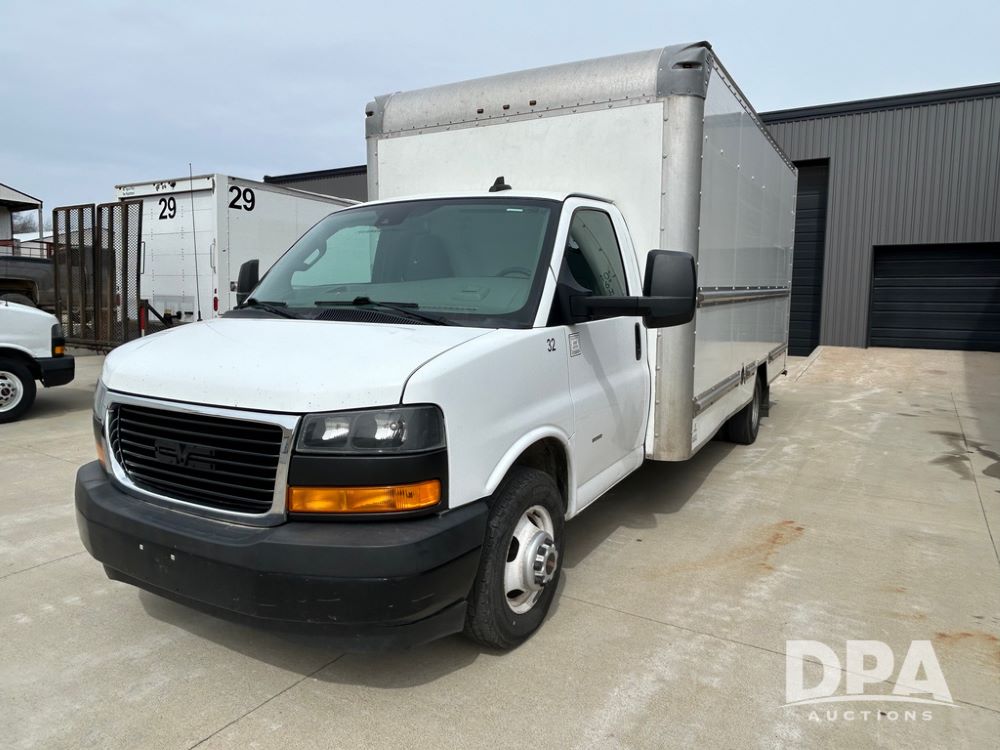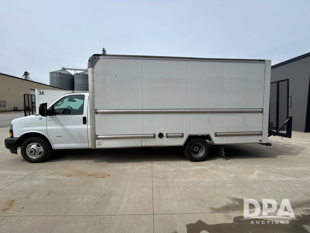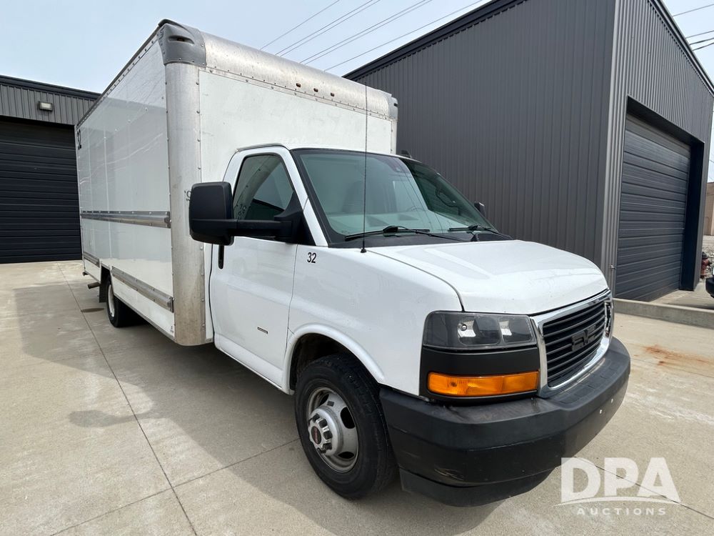 2020 GMC Savana 3500 Box Truck (LLD1717, Unit #32), 6.0 gas engine, RWD,16 foot box, power locks, cruise control, heat, air conditioning, radio, dove tail/ramp (can be removed with 2 bolts & 1 pin), 1 spare tire included, shows 180,301 miles.