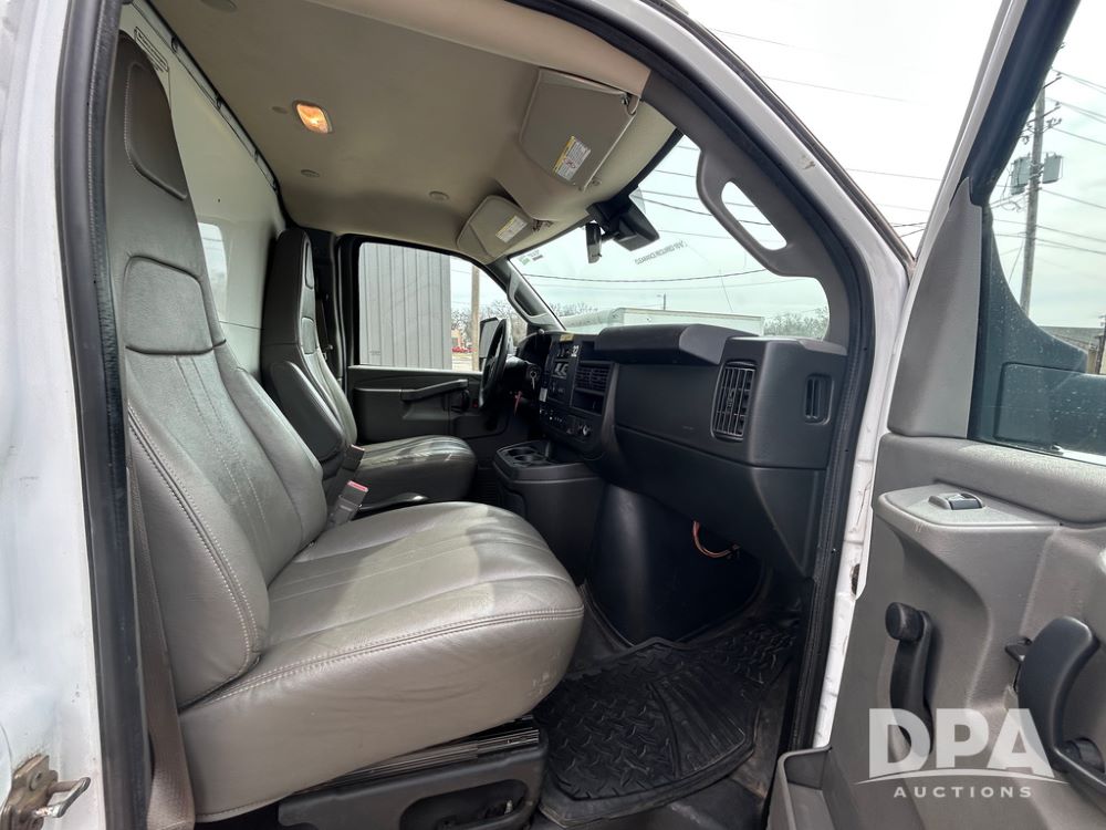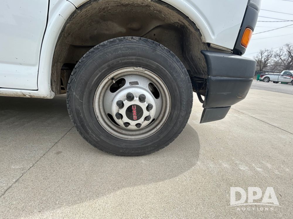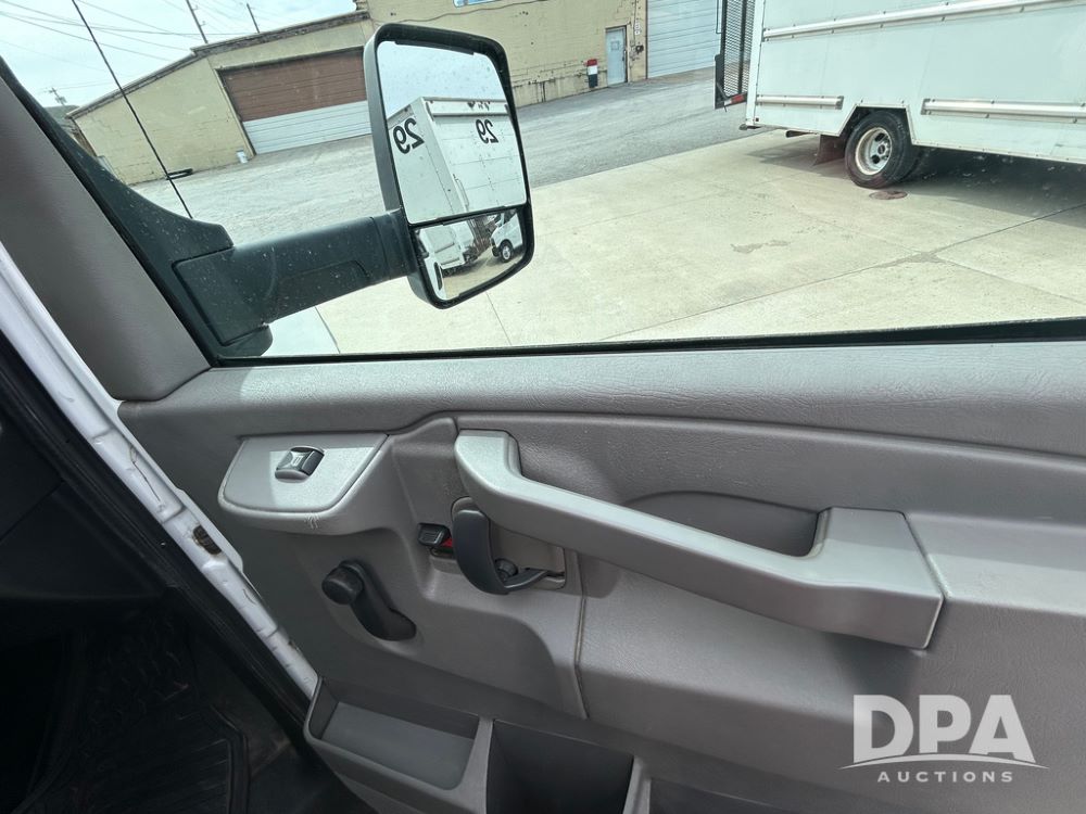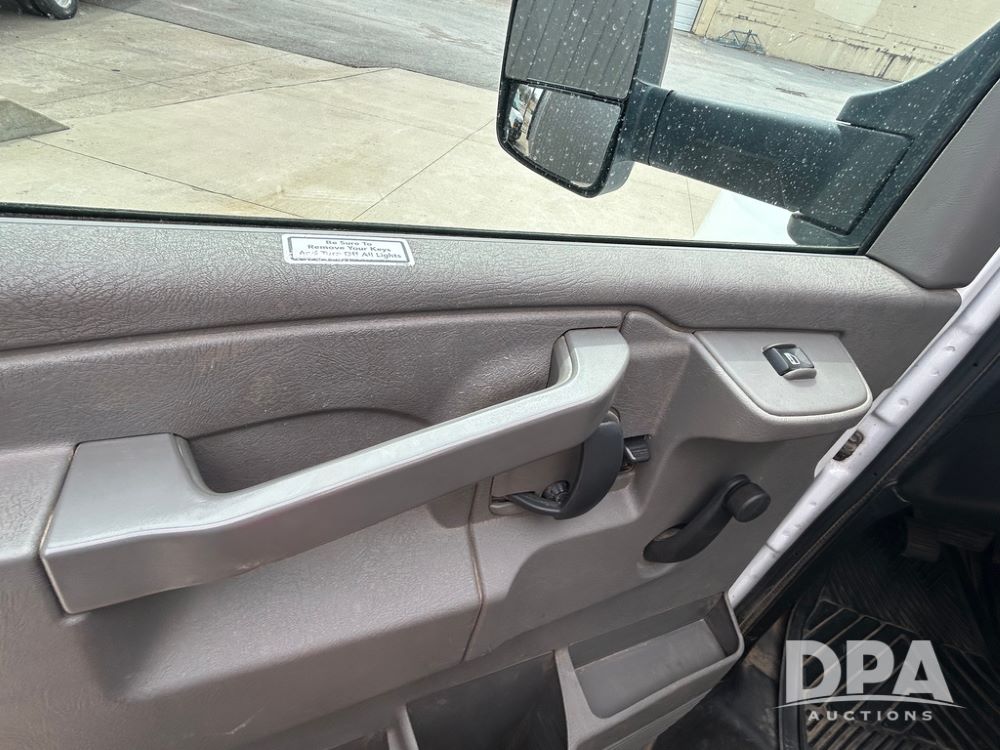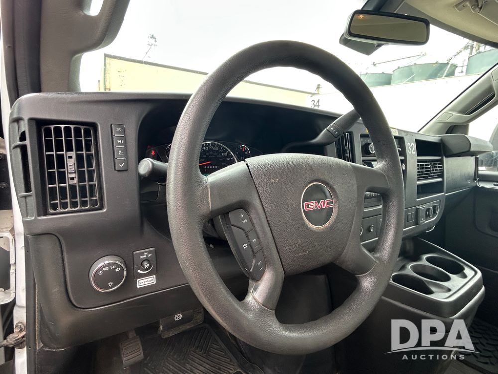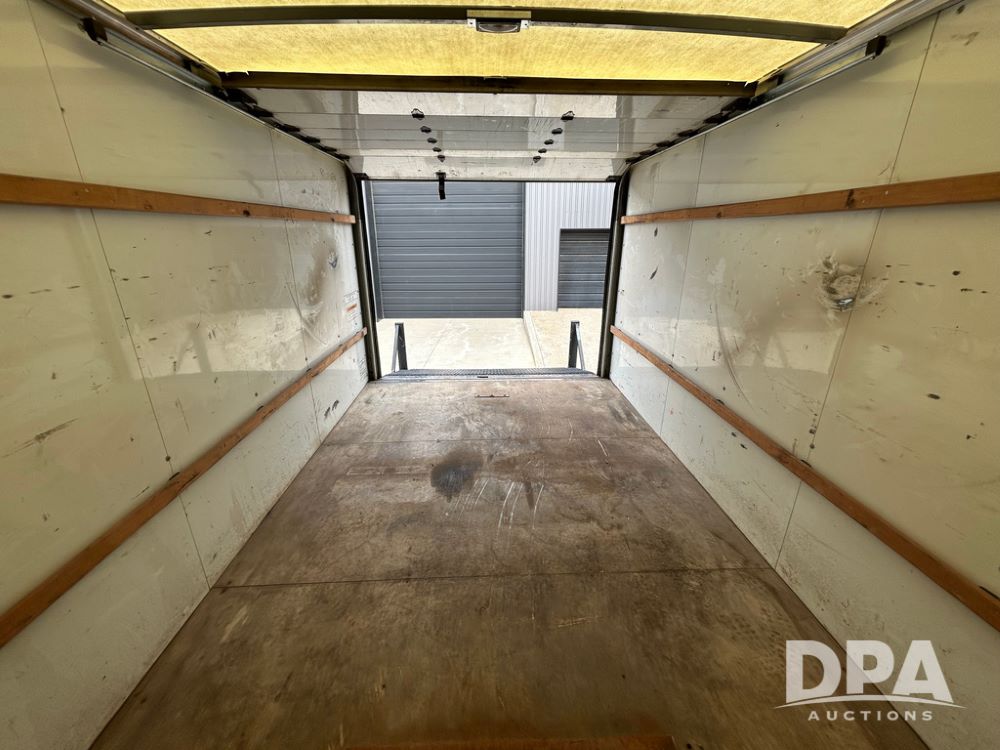 2020 GMC Savana 3500 Box Truck (LLD1717, Unit #32), 6.0 gas engine, RWD,16 foot box, power locks, cruise control, heat, air conditioning, radio, dove tail/ramp (can be removed with 2 bolts & 1 pin), 1 spare tire included, shows 180,301 miles.