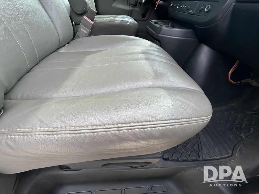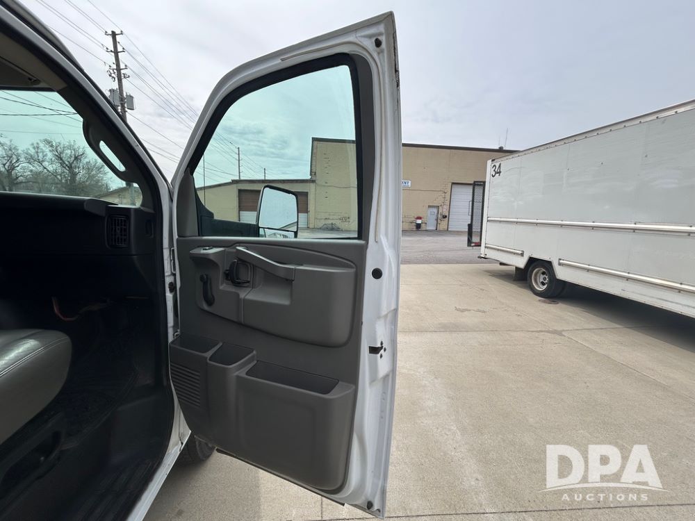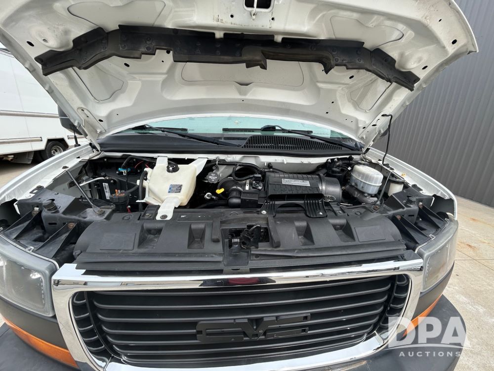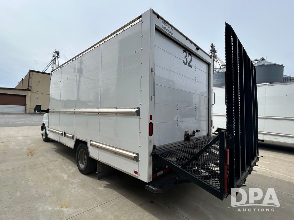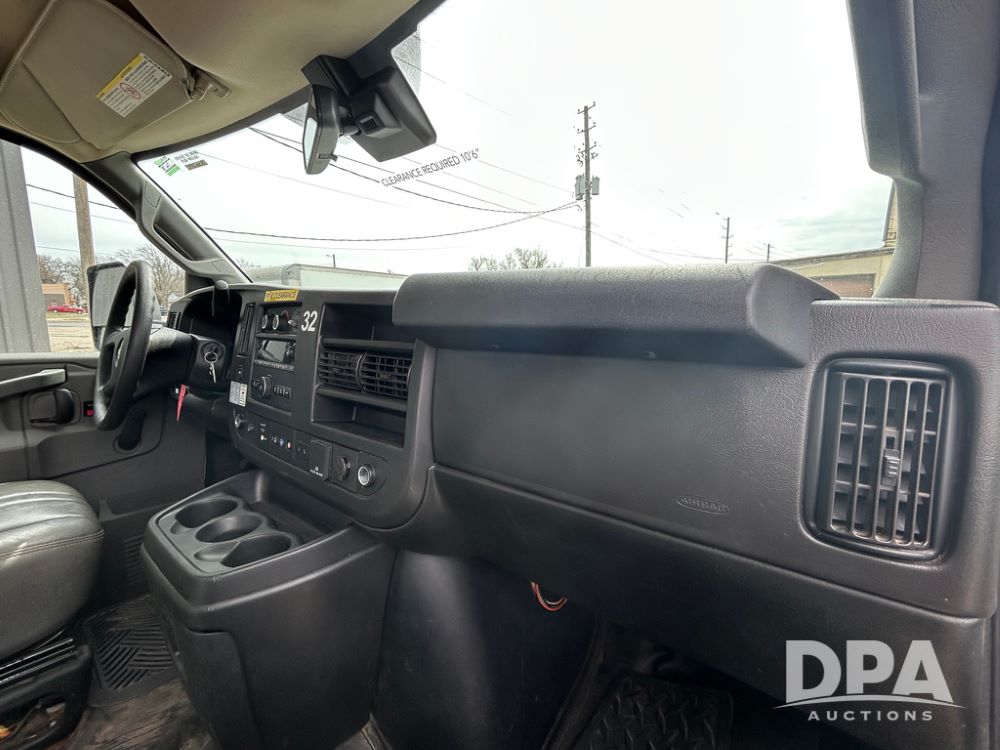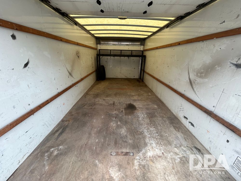 2020 GMC Savana 3500 Box Truck (LLD1717, Unit #32), 6.0 gas engine, RWD,16 foot box, power locks, cruise control, heat, air conditioning, radio, dove tail/ramp (can be removed with 2 bolts & 1 pin), 1 spare tire included, shows 180,301 miles.