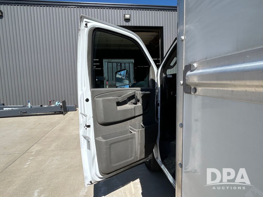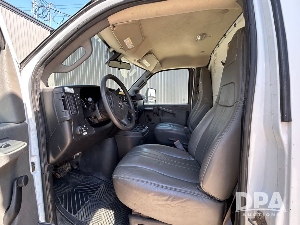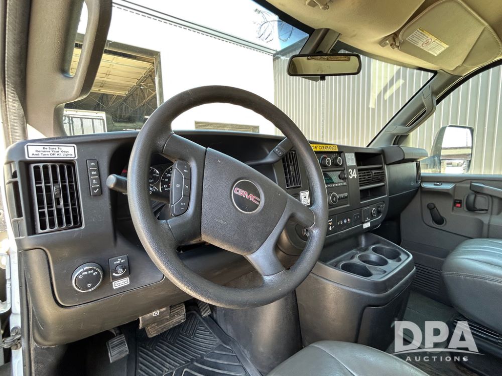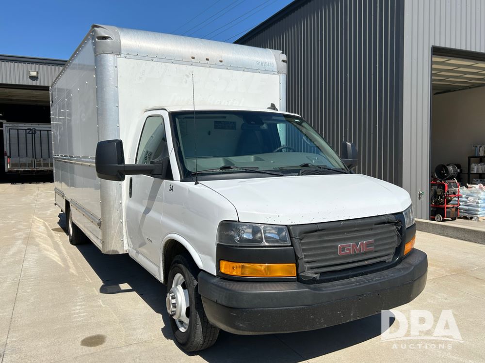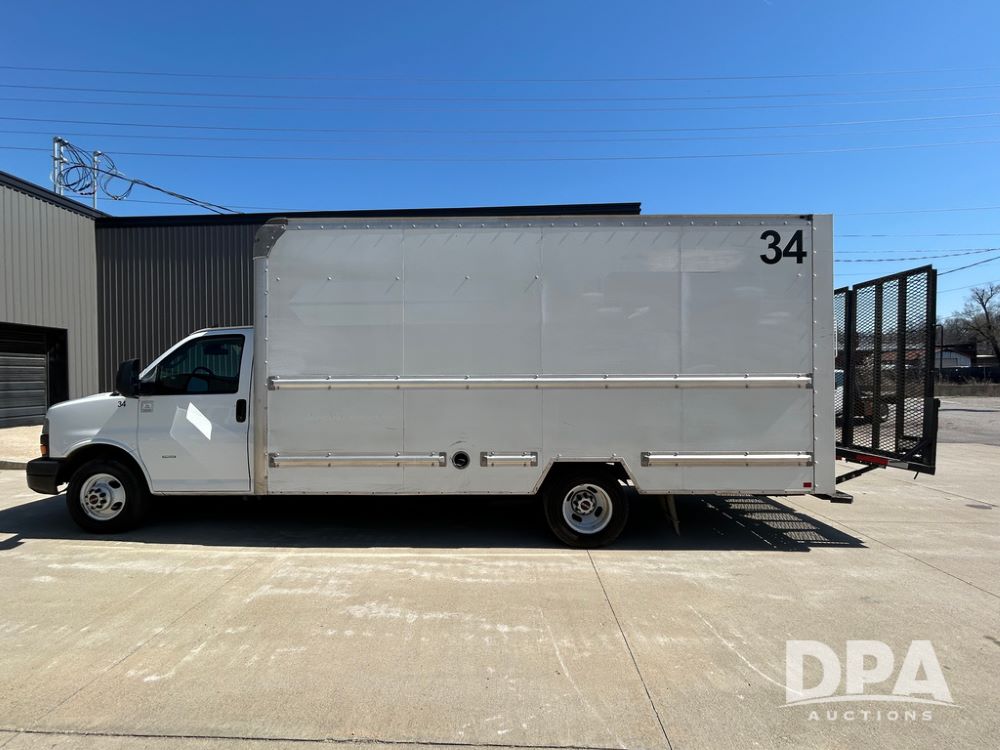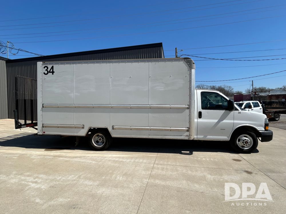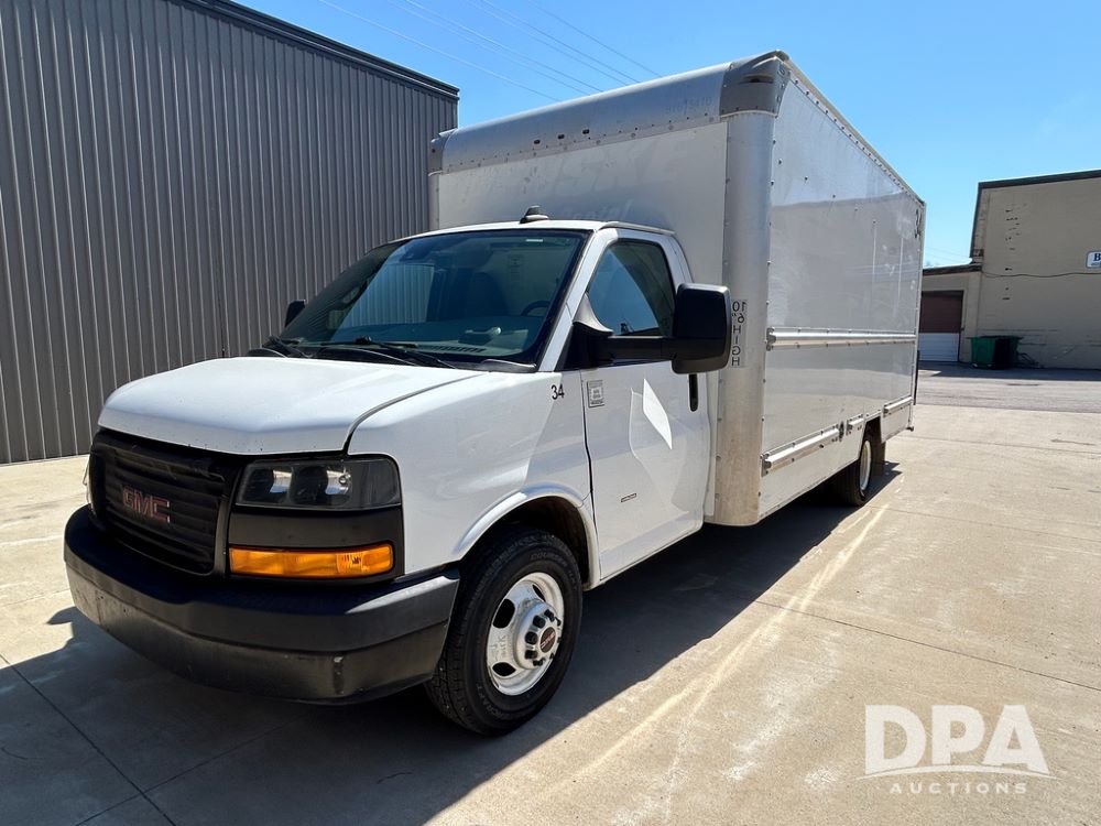 2020 GMC Savana 3500 Box Truck (LLD1719, Unit #34), 6.0 gas engine, RWD, 16 foot box, power locks, cruise control, back up camera, heat, air conditioning, radio, dove tail/ramp (can be removed with 2 bolts & 1 pin), underbody aluminum pull out ramp, 1 spare tire included, shows 176,777 miles.
