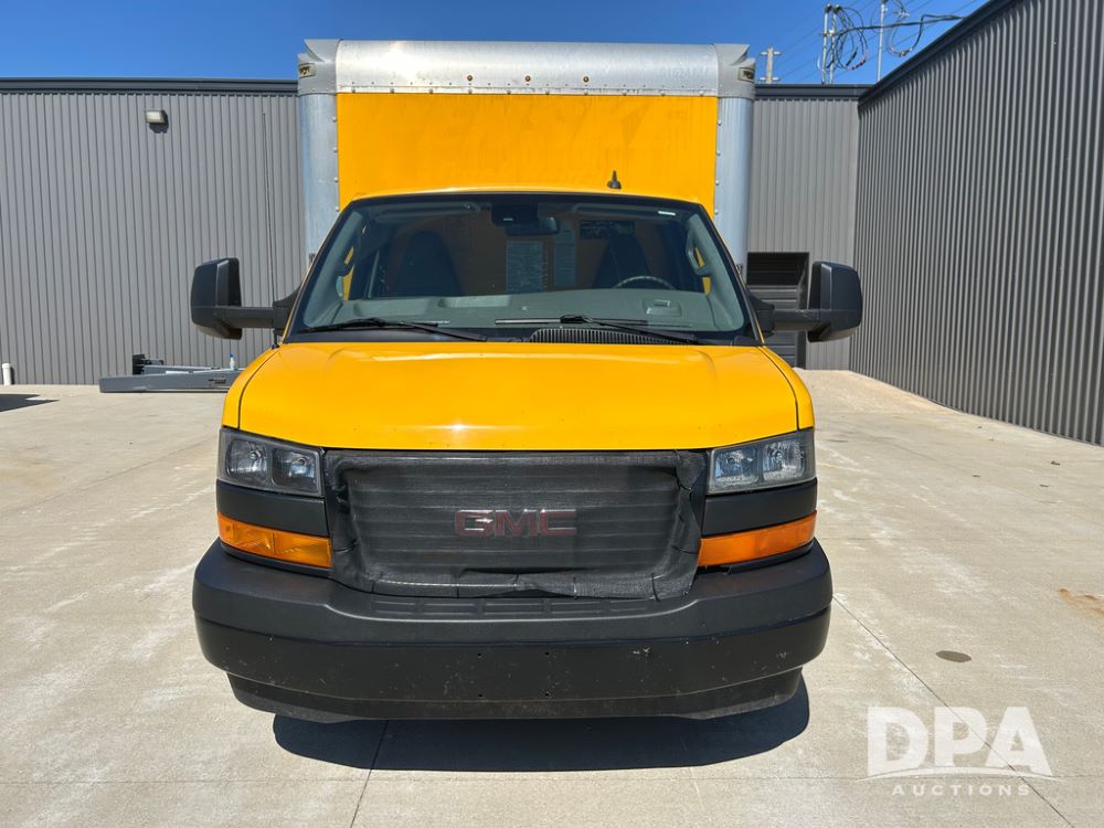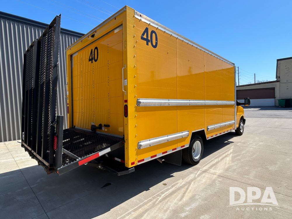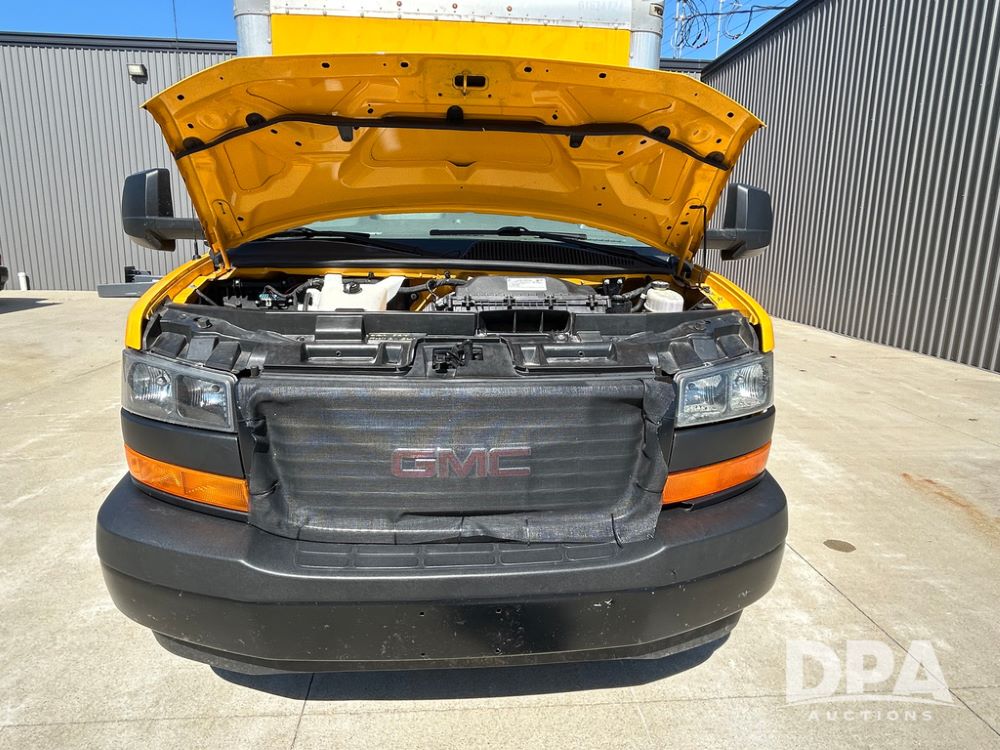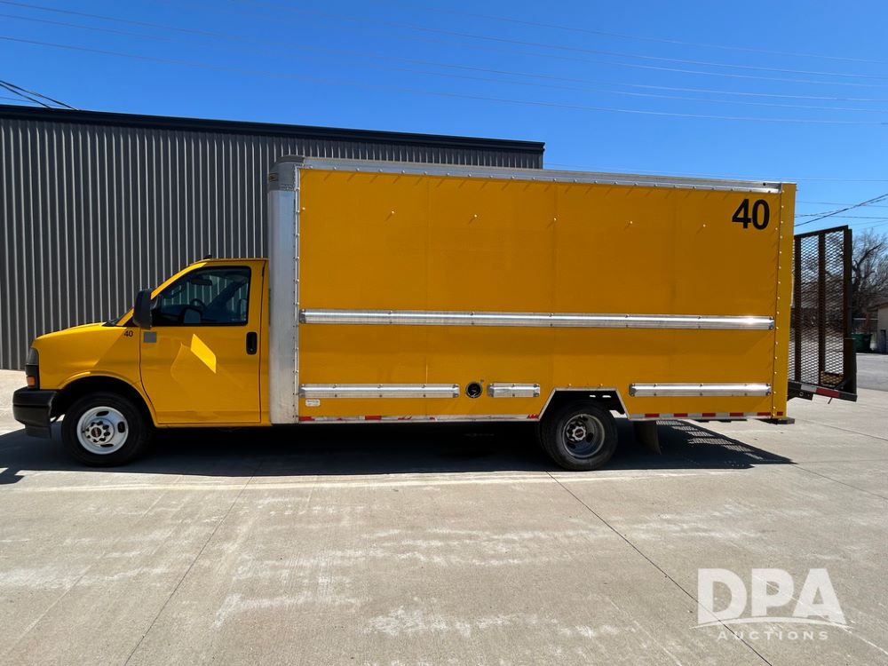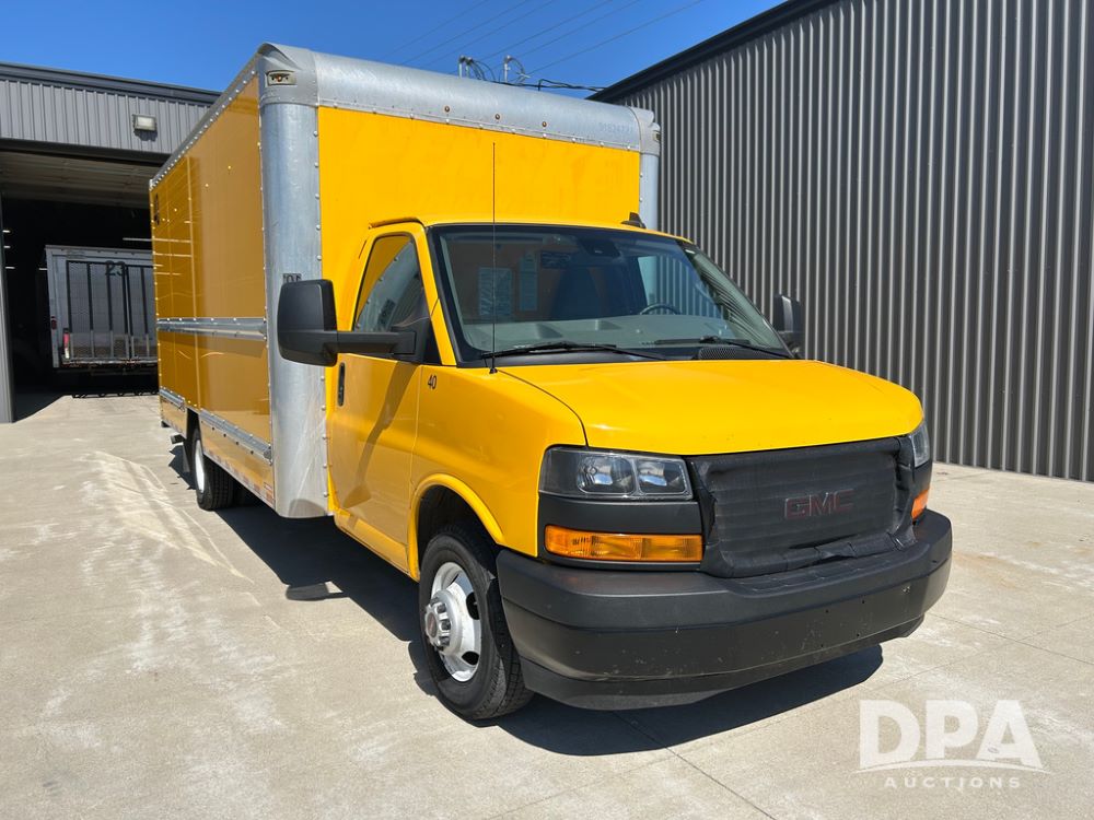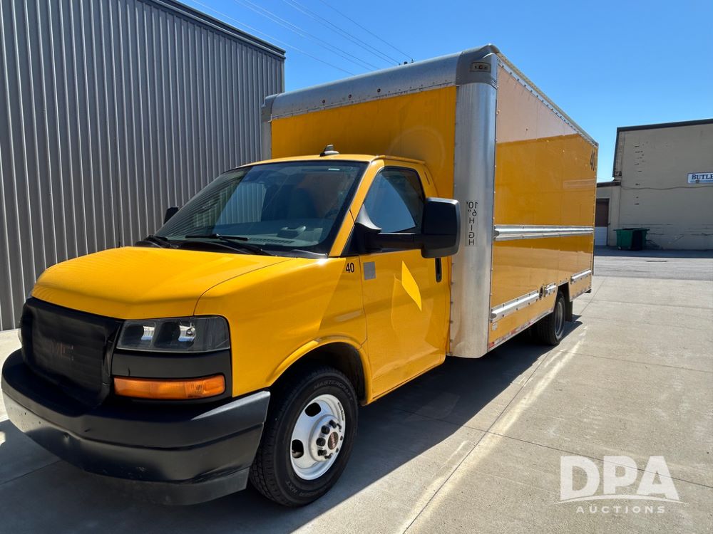 2022 GMC Savana 3500 Box Truck (LLD1720, Unit #40), 6.0 gas engine, RWD, 16 foot box, power locks, cruise control, back up camera, heat, air conditioning, radio, dove tail/ramp (can be removed with 2 bolts & 1 pin), underbody aluminum pull out ramp, 1 spare tire included, shows 82,257 miles.