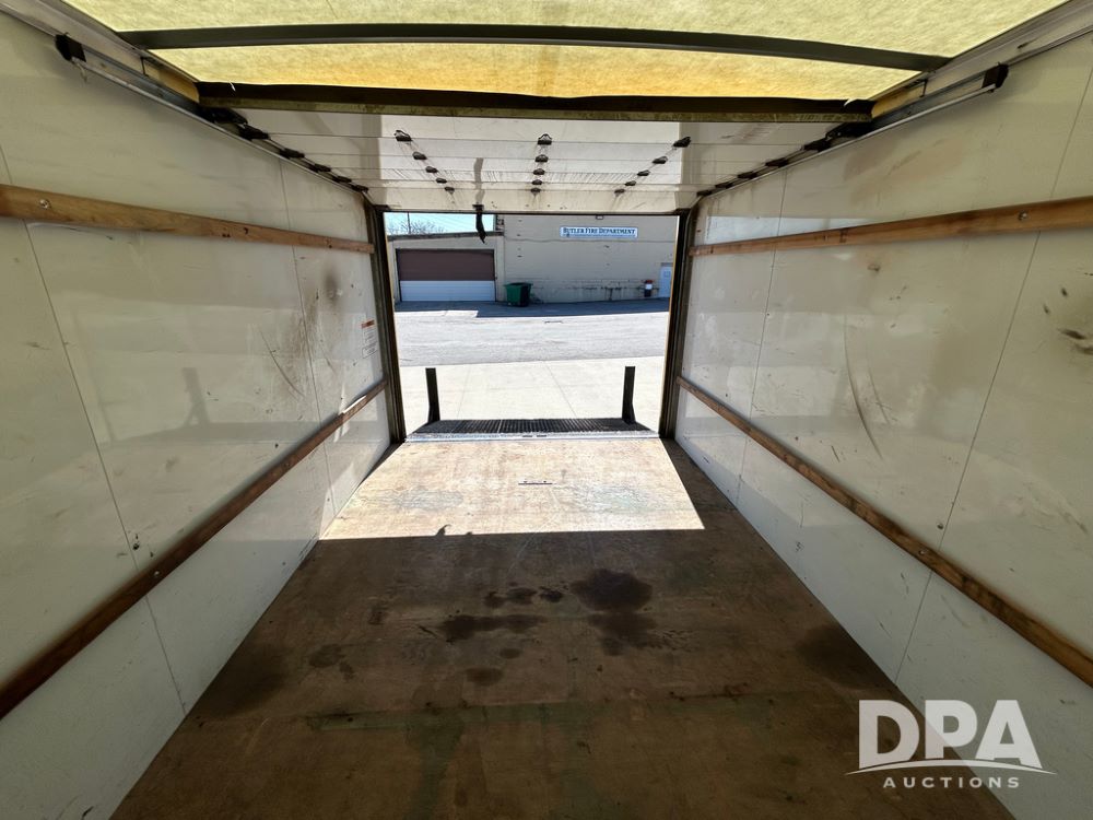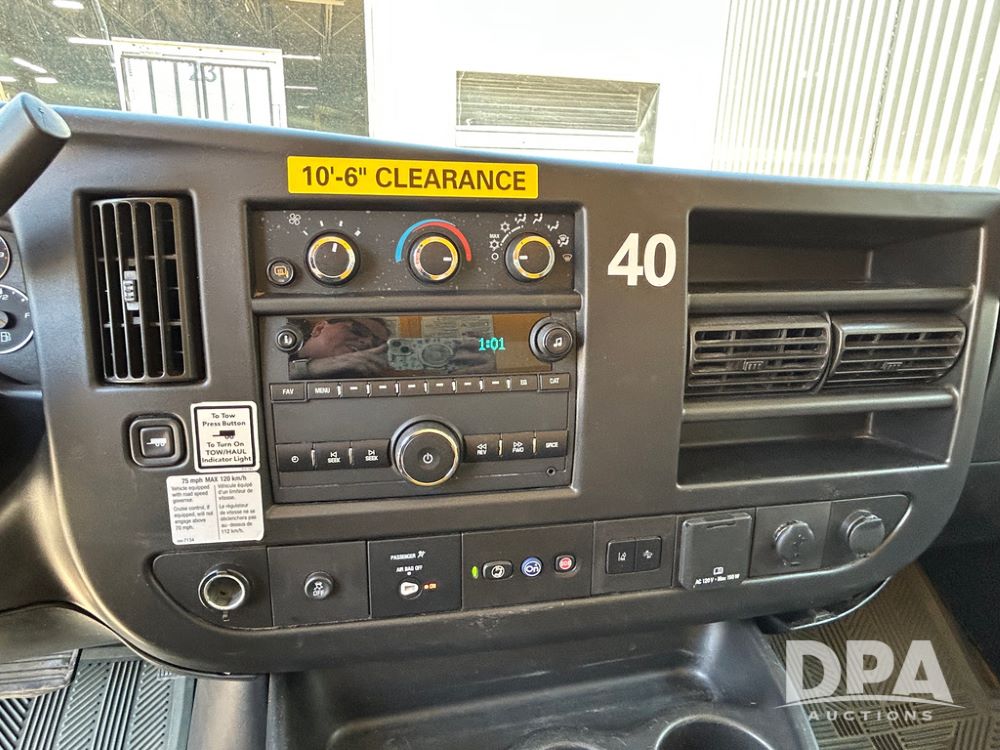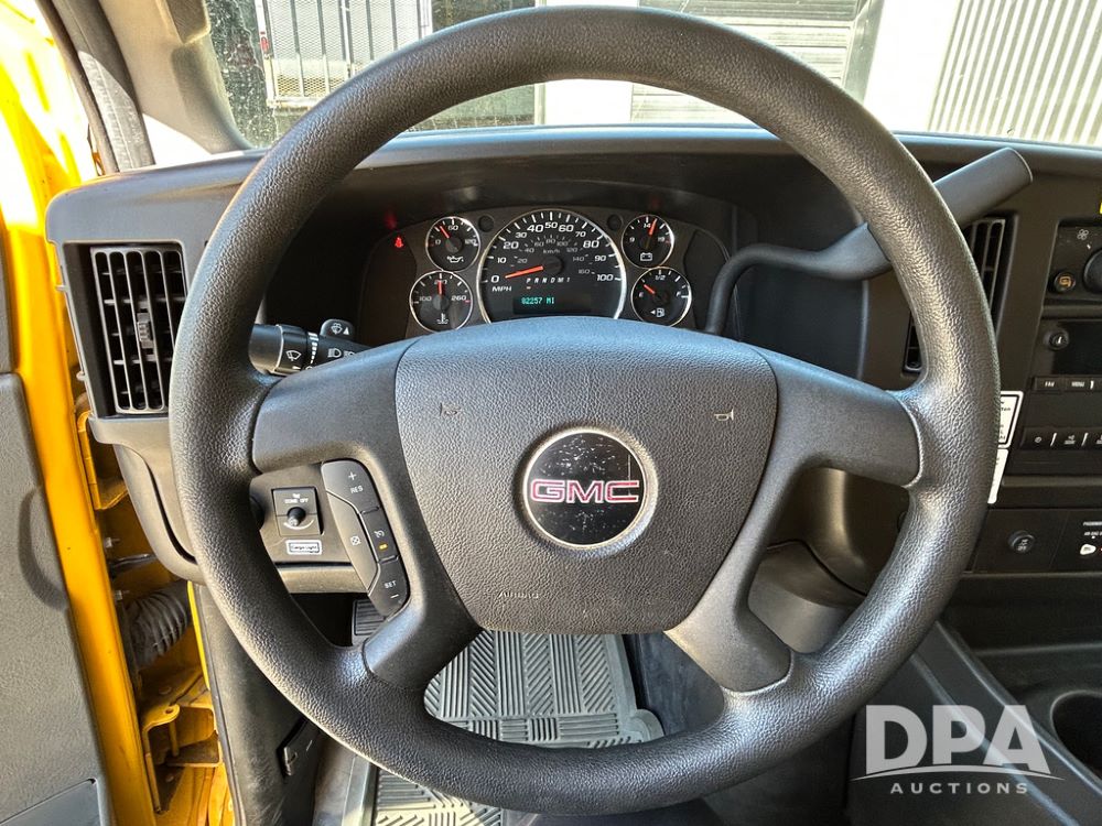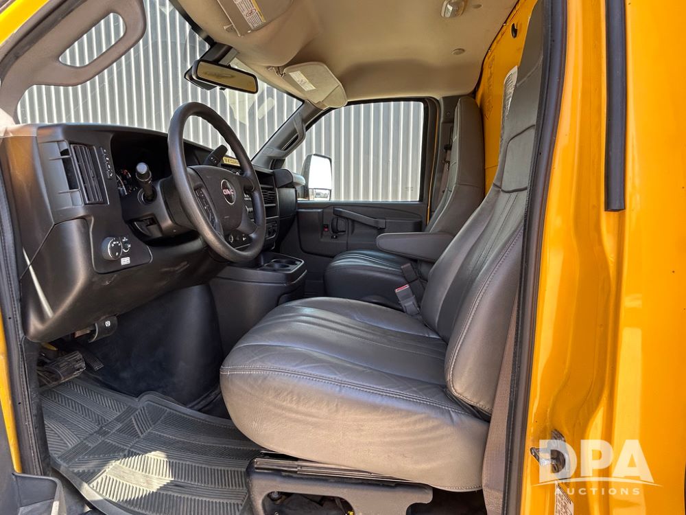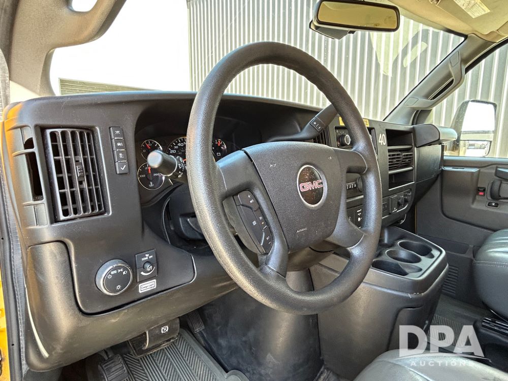 2022 GMC Savana 3500 Box Truck (LLD1720, Unit #40), 6.0 gas engine, RWD, 16 foot box, power locks, cruise control, back up camera, heat, air conditioning, radio, dove tail/ramp (can be removed with 2 bolts & 1 pin), underbody aluminum pull out ramp, 1 spare tire included, shows 82,257 miles.