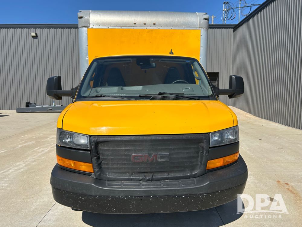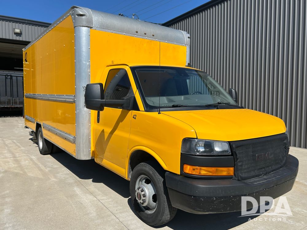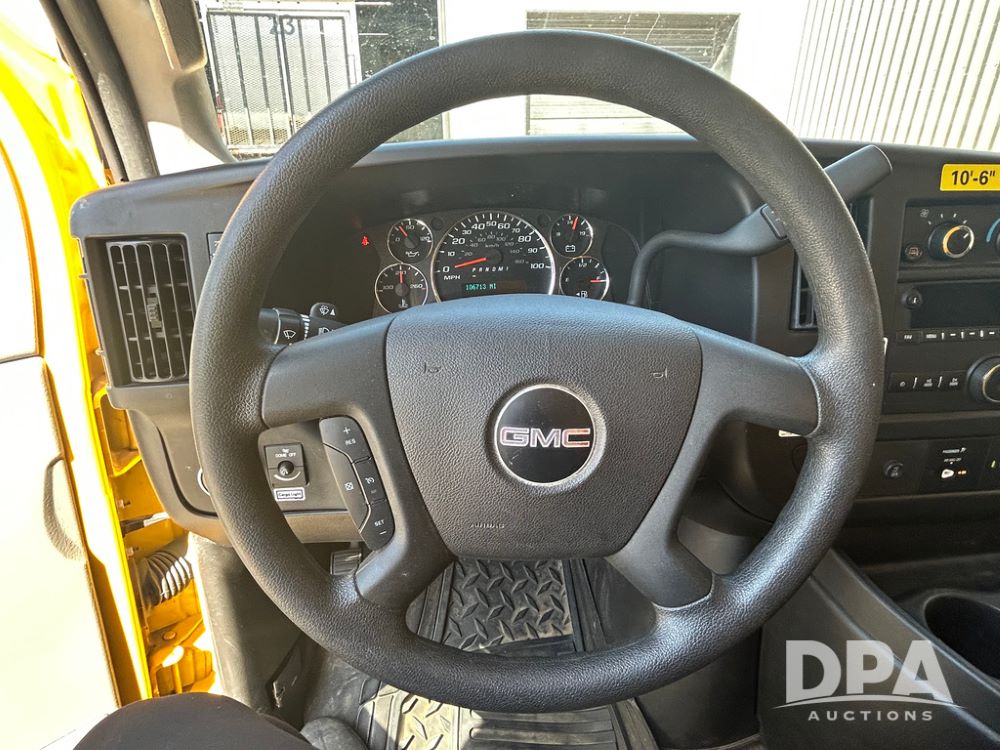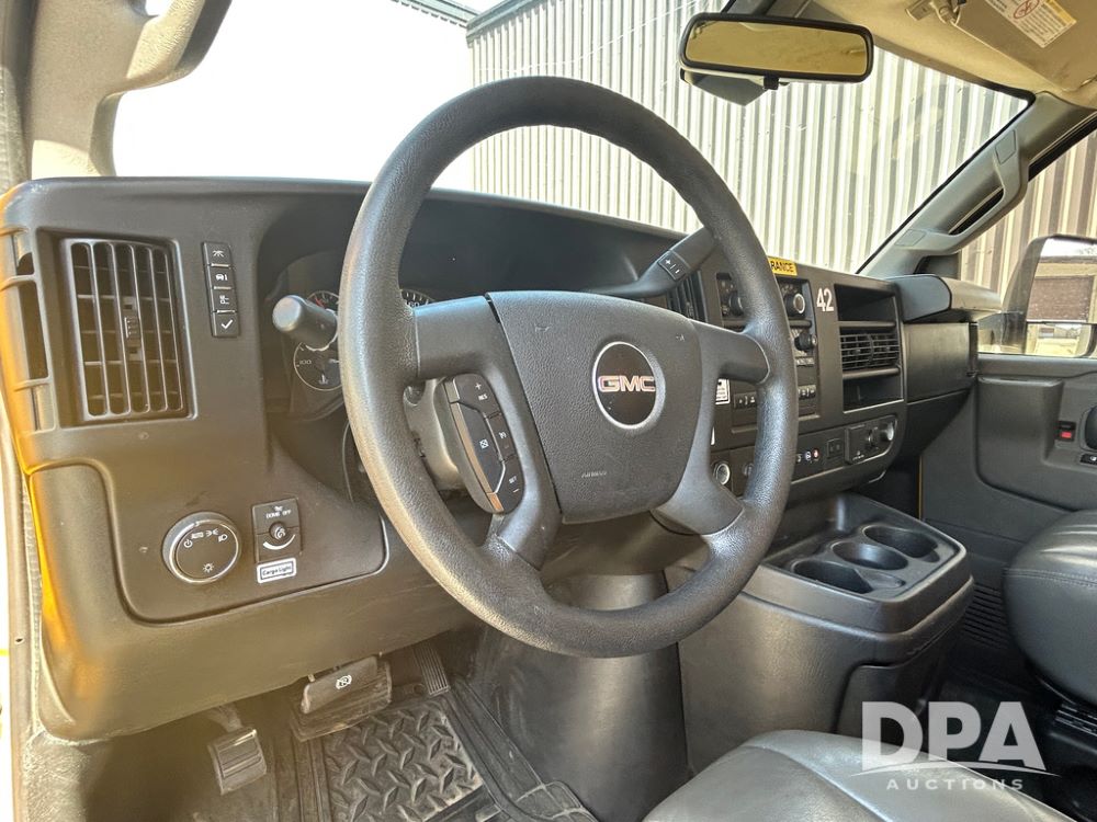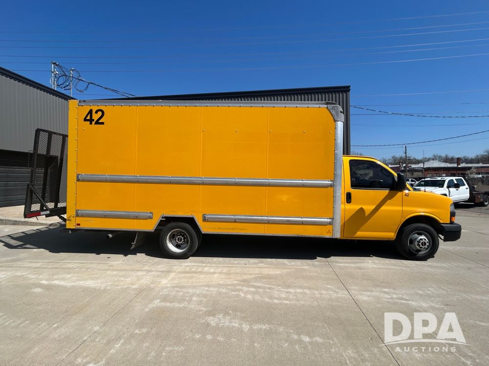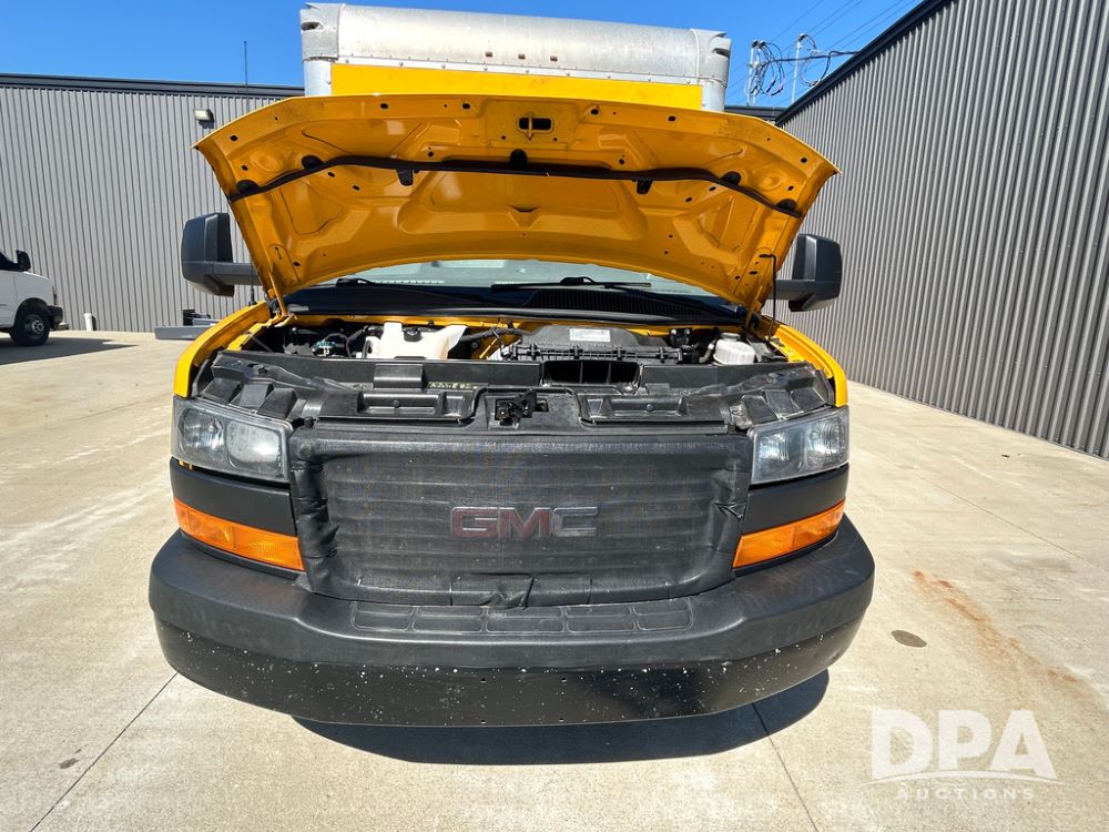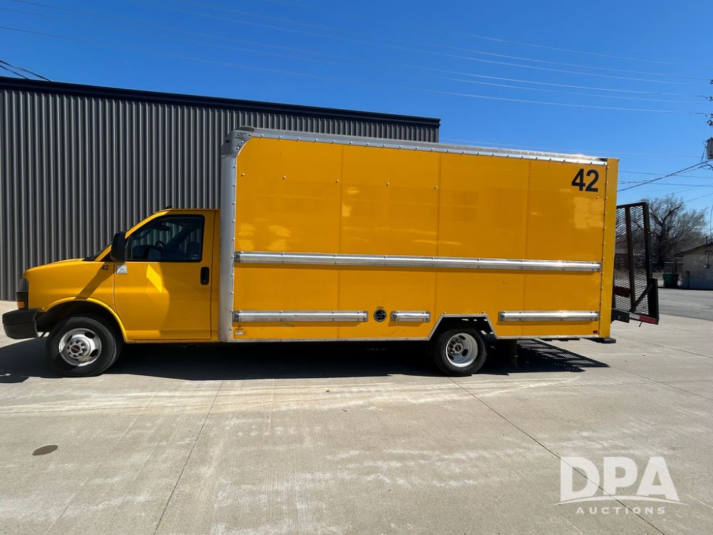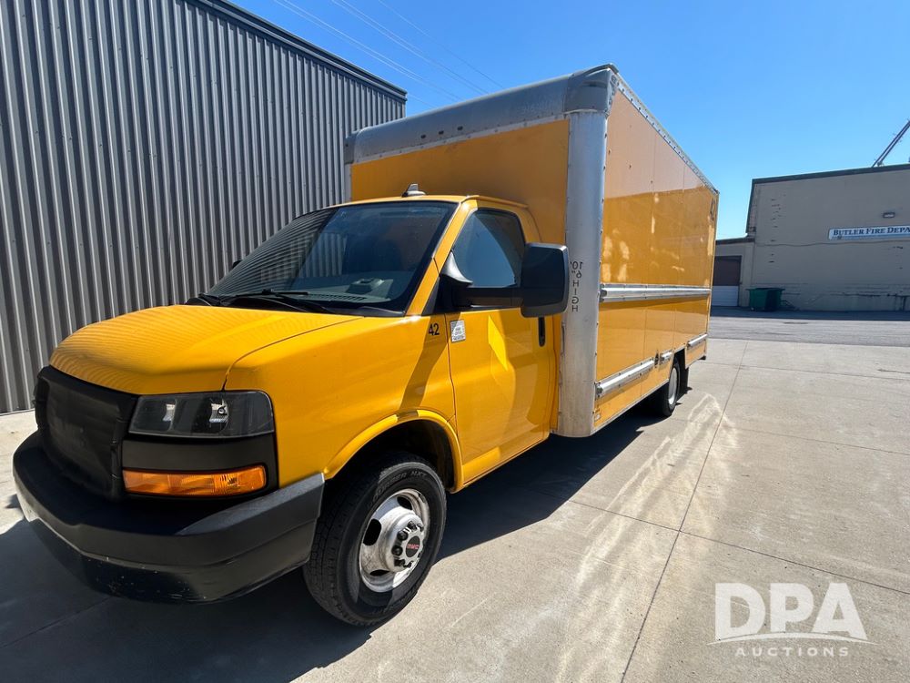 2022 GMC Savana 3500 Box Truck (LLD1721, Unit #42), 6.6 gas engine, RWD, 16 foot box, power locks, power windows, cruise control, back up camera, heat, air conditioning, radio, dove tail/ramp (can be removed with 2 bolts & 1 pin), underbody aluminum pull out ramp, 1 spare tire included, shows 106,713 miles.