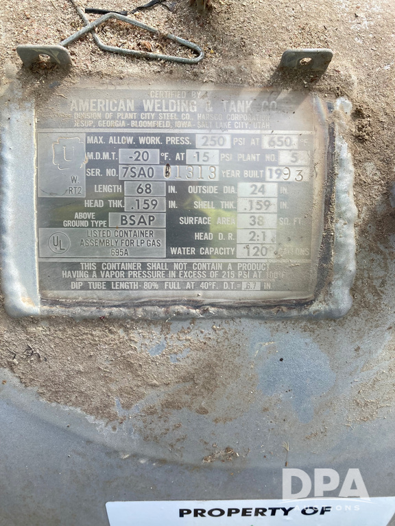 American Welding LP Tank (DR13671), 120 gallon LP storage tank w/good data tag.